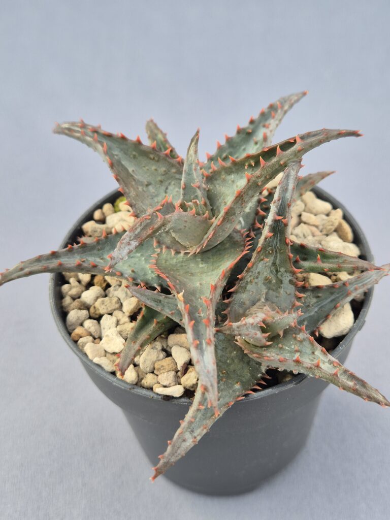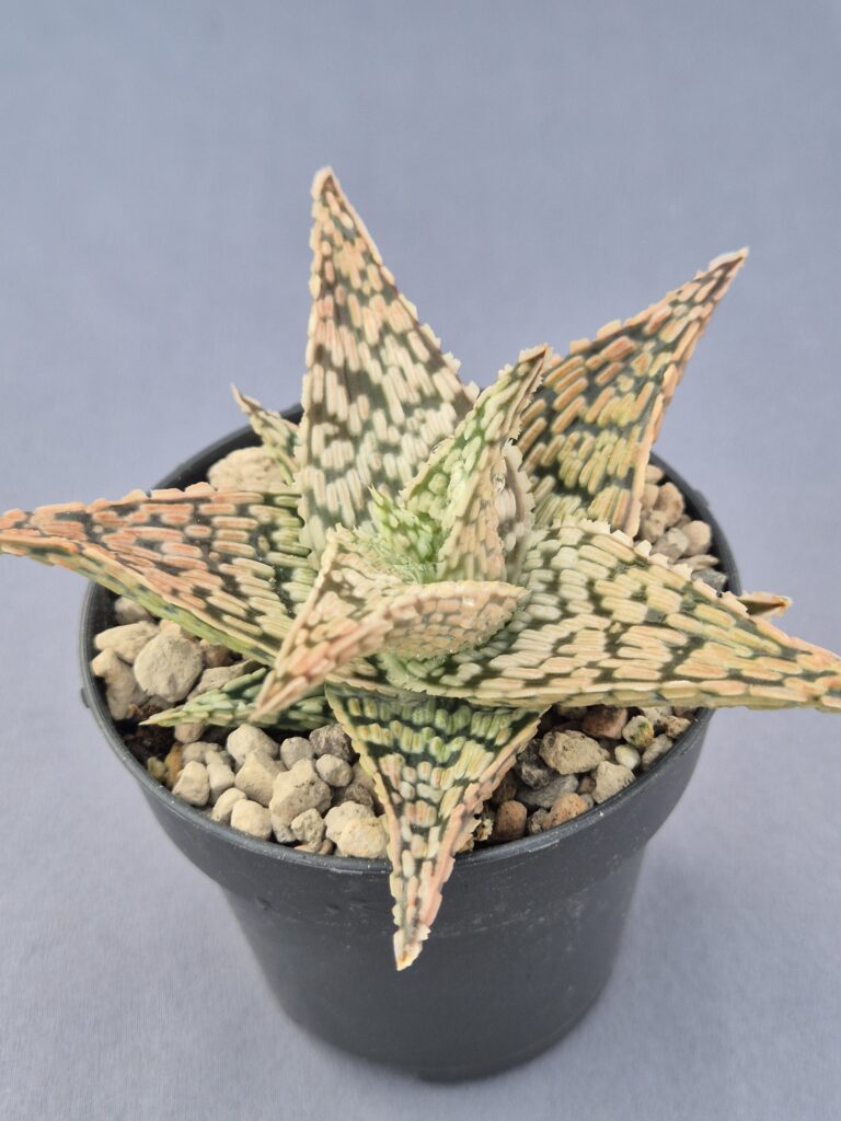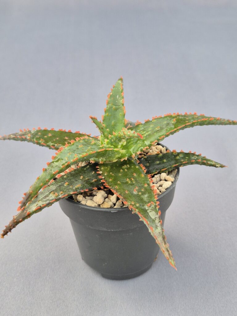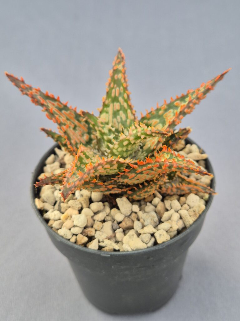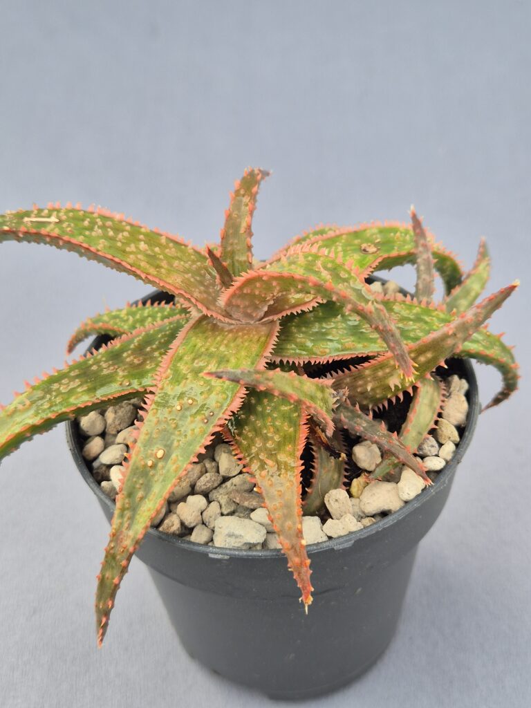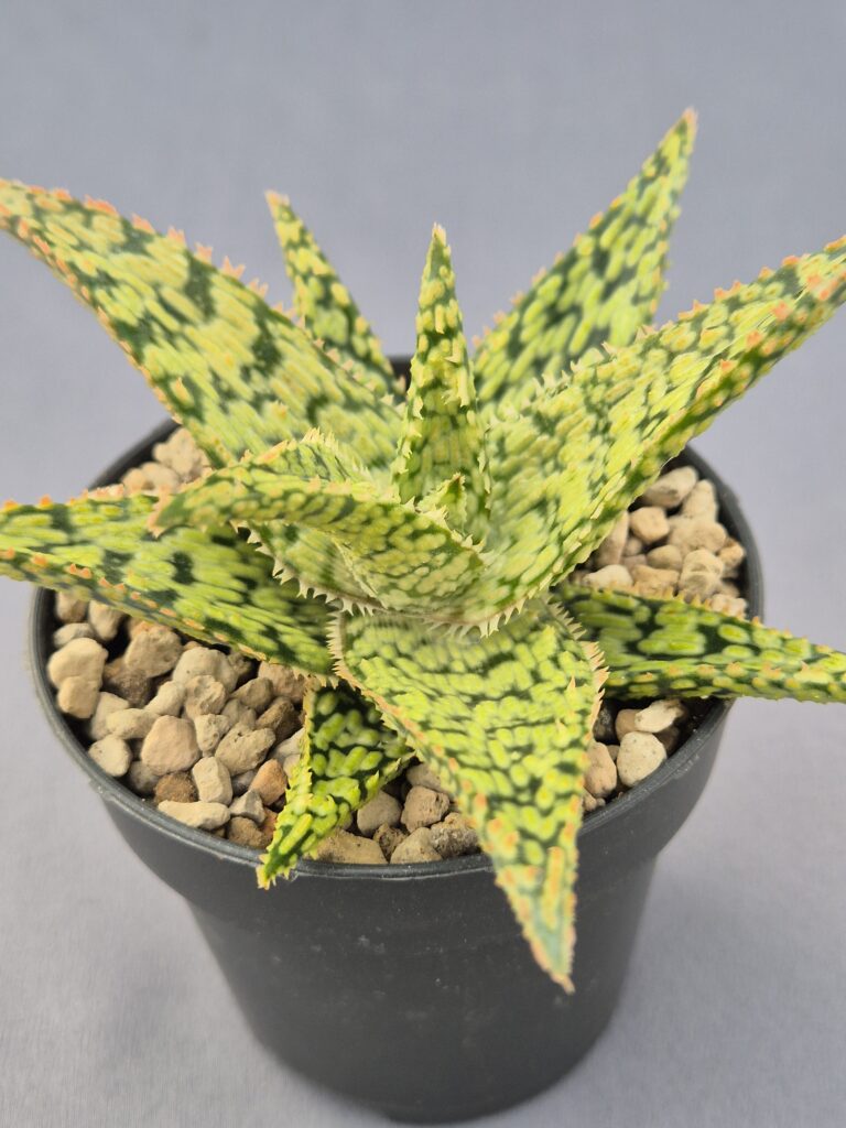 Este Aloe híbrido destaca por su equilibrio entre elegancia y carácter, combinando una forma armónica con una coloración fresca y luminosa. Es una planta muy decorativa, de crecimiento ordenado y aspecto limpio, ideal tanto para colección como para decoración.