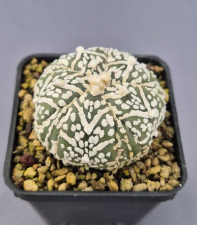 Este precioso Astrophytum destaca por su forma globosa perfectamente definida y por la espectacular combinación de tonos verde oscuro y amarillo brillante que recorren su superficie. Las areolas lanosas, abundantes y bien marcadas, crean un contraste visual único que resalta aún más su patrón “V-TYPE”, otorgándole un aspecto elegante, distintivo y muy apreciado entre los coleccionistas de cactus selectos.