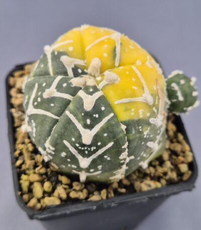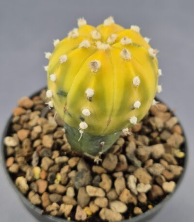 El Astrophytum variegata injertado es una pieza vibrante y llamativa, reconocida por su espectacular mezcla de tonos amarillos y verdes que lo convierten en un cactus protagonista en cualquier colección. El injerto potencia su crecimiento, su coloración y su resistencia, permitiendo disfrutar al máximo de su belleza única.