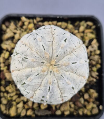 El Astrophytum V-TYPE híbrido es una pieza excepcional dentro del género, combinando rasgos únicos que lo hacen destacar desde el primer vistazo. Su epidermis clara, casi blanquecina, cubierta por motas finas y dibujos naturales, le aporta un aspecto suave, elegante y muy valorado por coleccionistas. Un ejemplar que llama la atención por su pureza visual y por la delicadeza de sus detalles.
