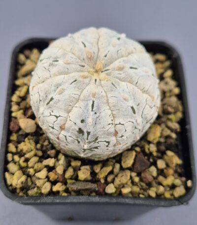 El Astrophytum Super White Hakkun injertado es una auténtica joya botánica, reconocible al instante por su epidermis intensamente blanca y su patrón quebrado que parece esculpido a mano. Sus protuberancias lanosas, que coronan toda la superficie, aportan un aspecto único, casi escultórico, que lo convierte en una pieza especialmente apreciada por coleccionistas exigentes. Al estar injertado, su crecimiento es más vigoroso y estable, permitiendo disfrutar plenamente de su rareza.