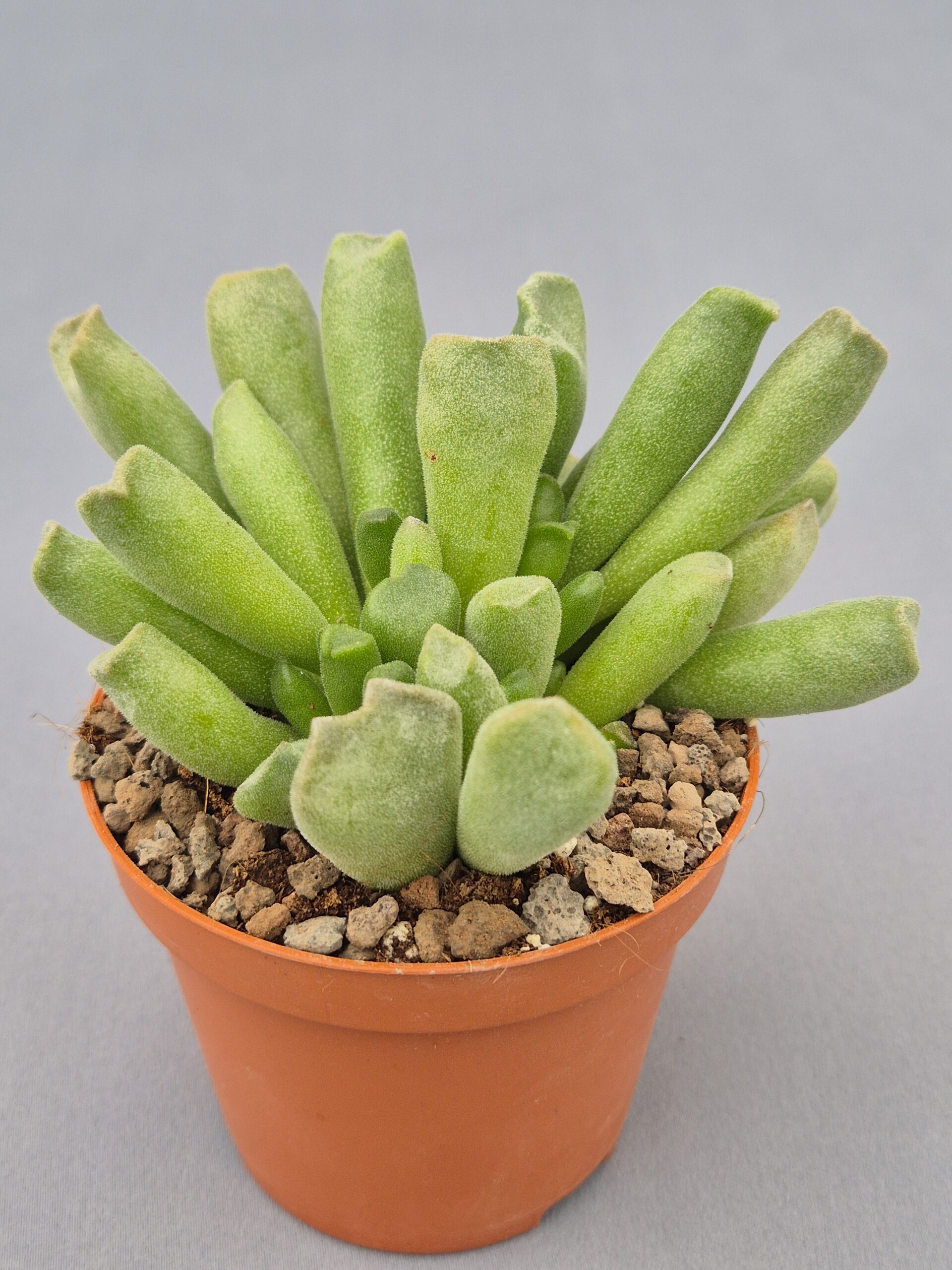 Adromischus cristatus var. schoenlandii es una suculenta compacta y muy ornamental, apreciada por la forma ondulada de sus hojas y su textura singular. Es una planta de crecimiento lento, ideal para colecciones cuidadas y macetas pequeñas.