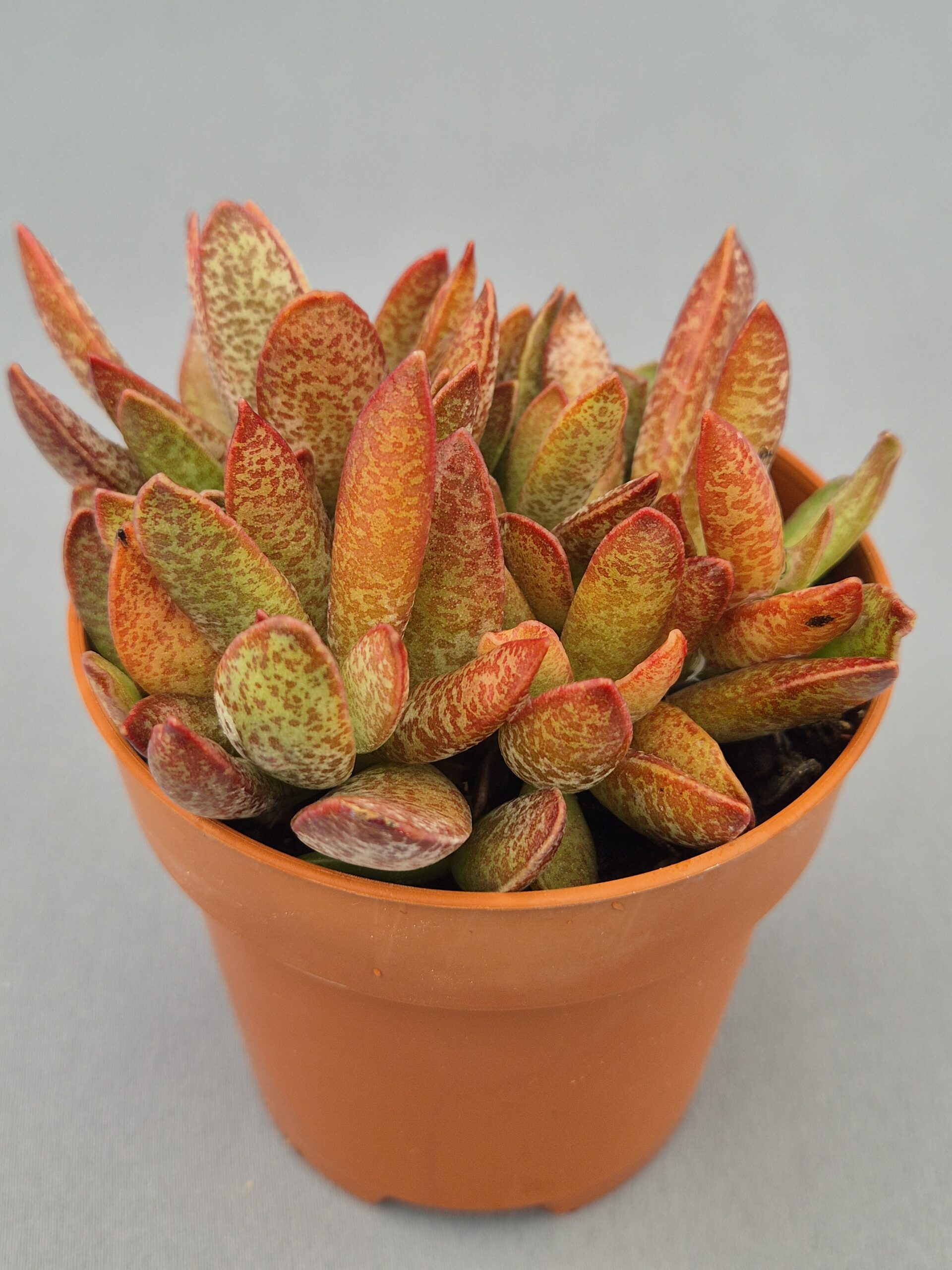 Adromischus trigynus ‘Calico-Hearts’ es una suculenta muy apreciada por la forma redondeada de sus hojas y por su delicada variegación, que le aporta un aspecto elegante y muy decorativo. Su crecimiento pausado y su tamaño contenido la convierten en una planta ideal para colecciones cuidadas.