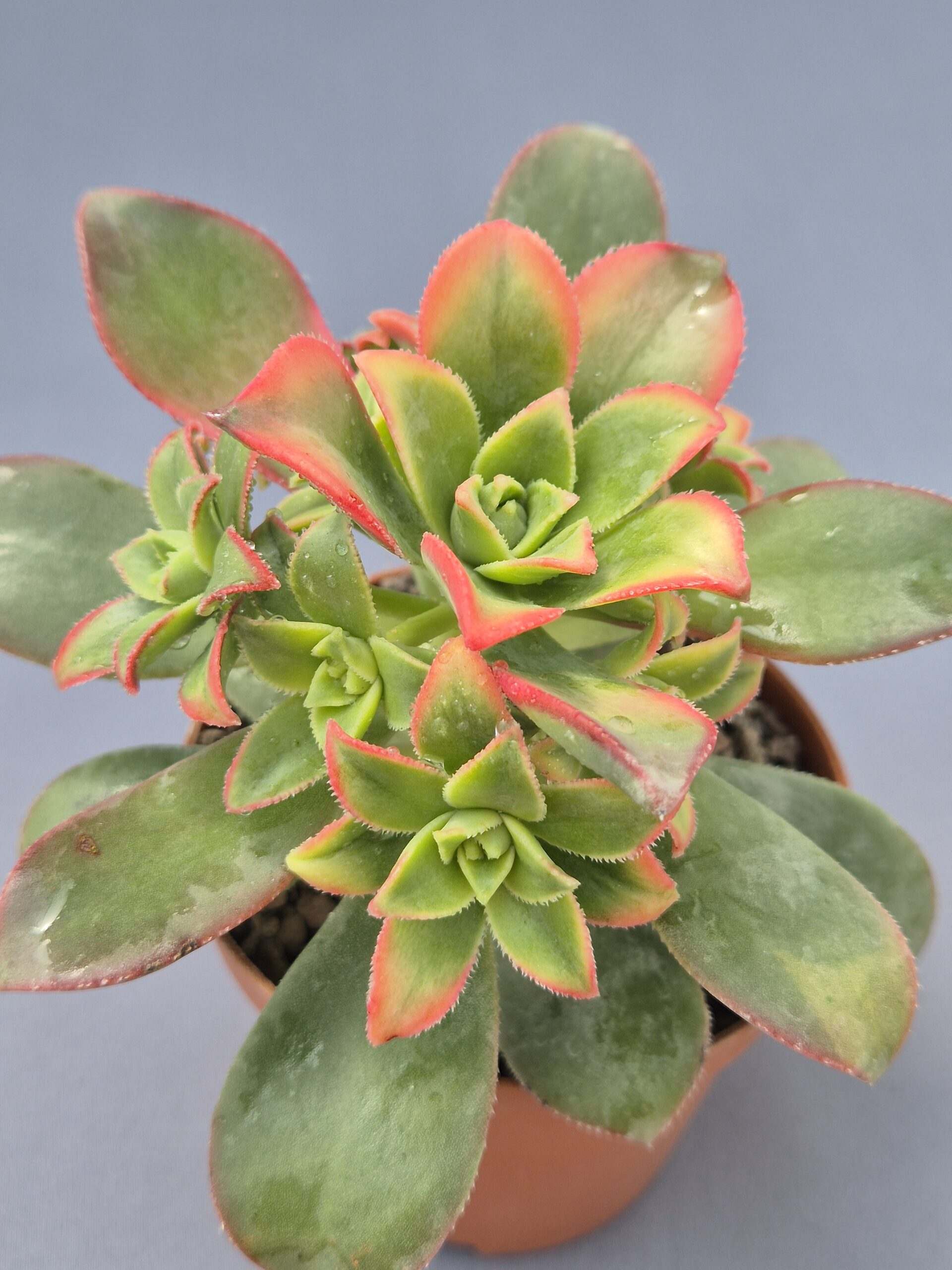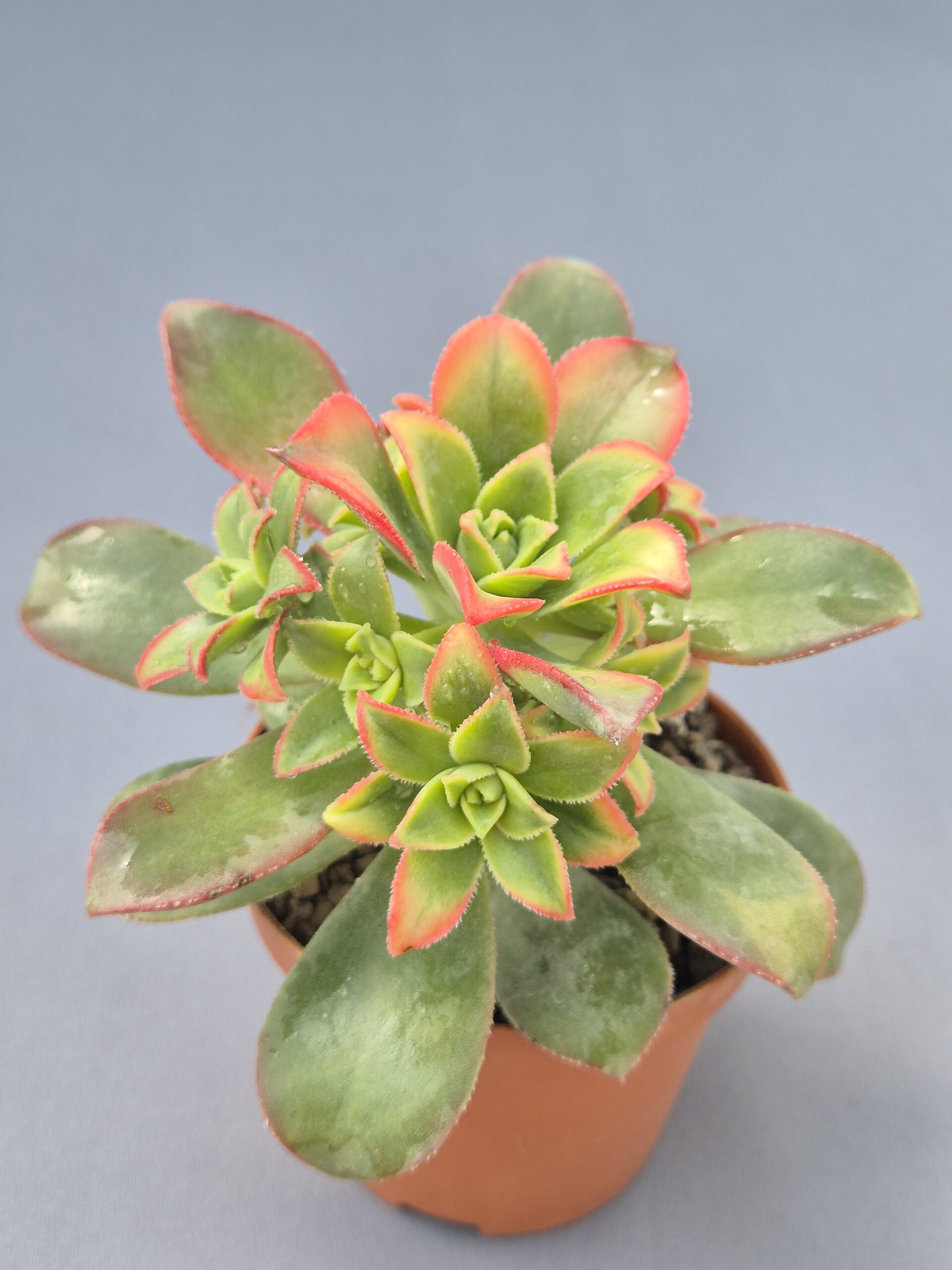 Suculenta muy popular por sus colores vivos y su fácil cultivo. Sus rosetas compactas combinan tonos verdes, amarillos y bordes rojizos, creando un efecto muy decorativo durante todo el año.