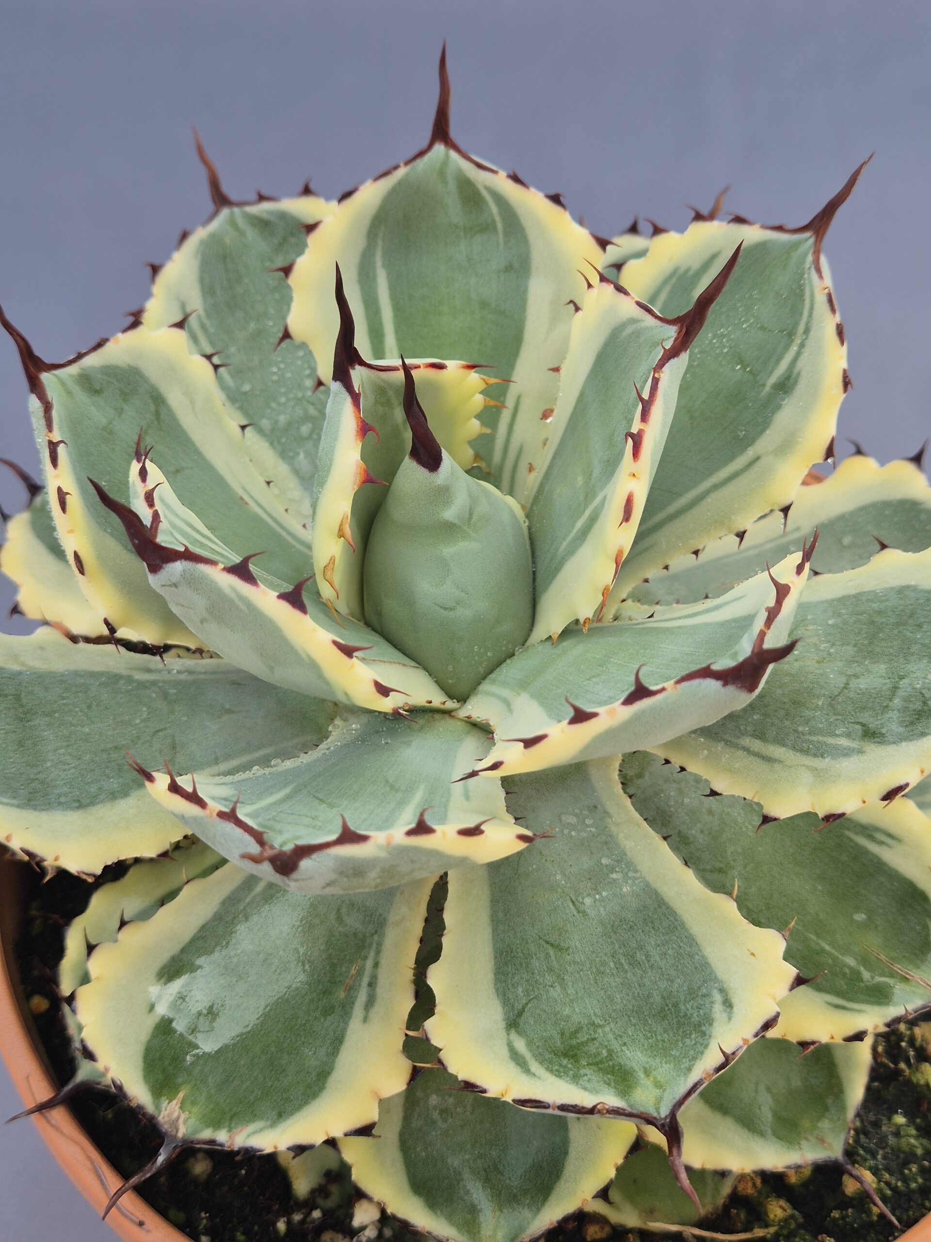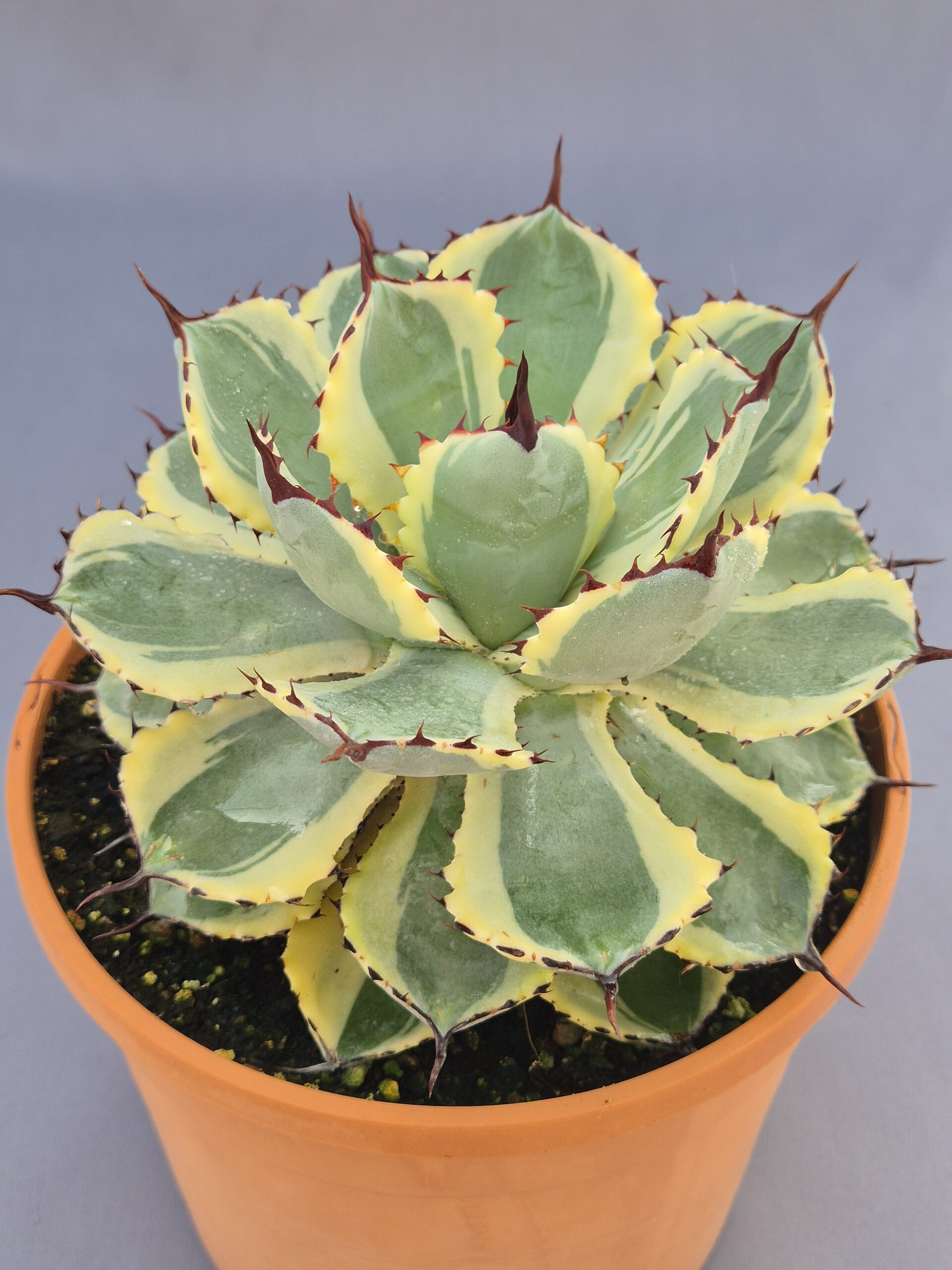 Agave potatorum ‘Kichiokan Marginata’ es una suculenta muy apreciada por su espectacular variegación marginal y su forma compacta. Sus hojas anchas con bordes claros crean un contraste muy elegante, convirtiéndola en una pieza destacada dentro de cualquier colección de Agave.