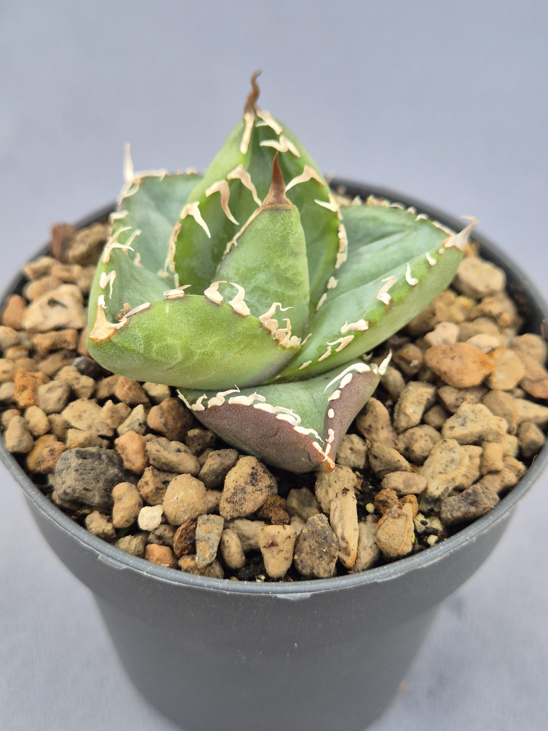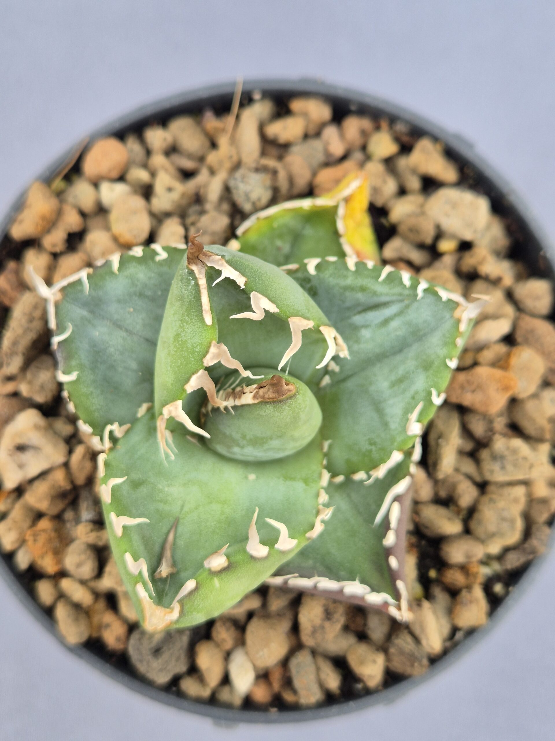 Este Agave titanota destaca por su forma compacta, sus hojas gruesas con bordes dentados muy marcados y su característico color verde azulado, acompañado de espinas crema que contrastan de forma elegante. Es una planta muy apreciada por coleccionistas por su presencia robusta y su crecimiento lento y ornamental.