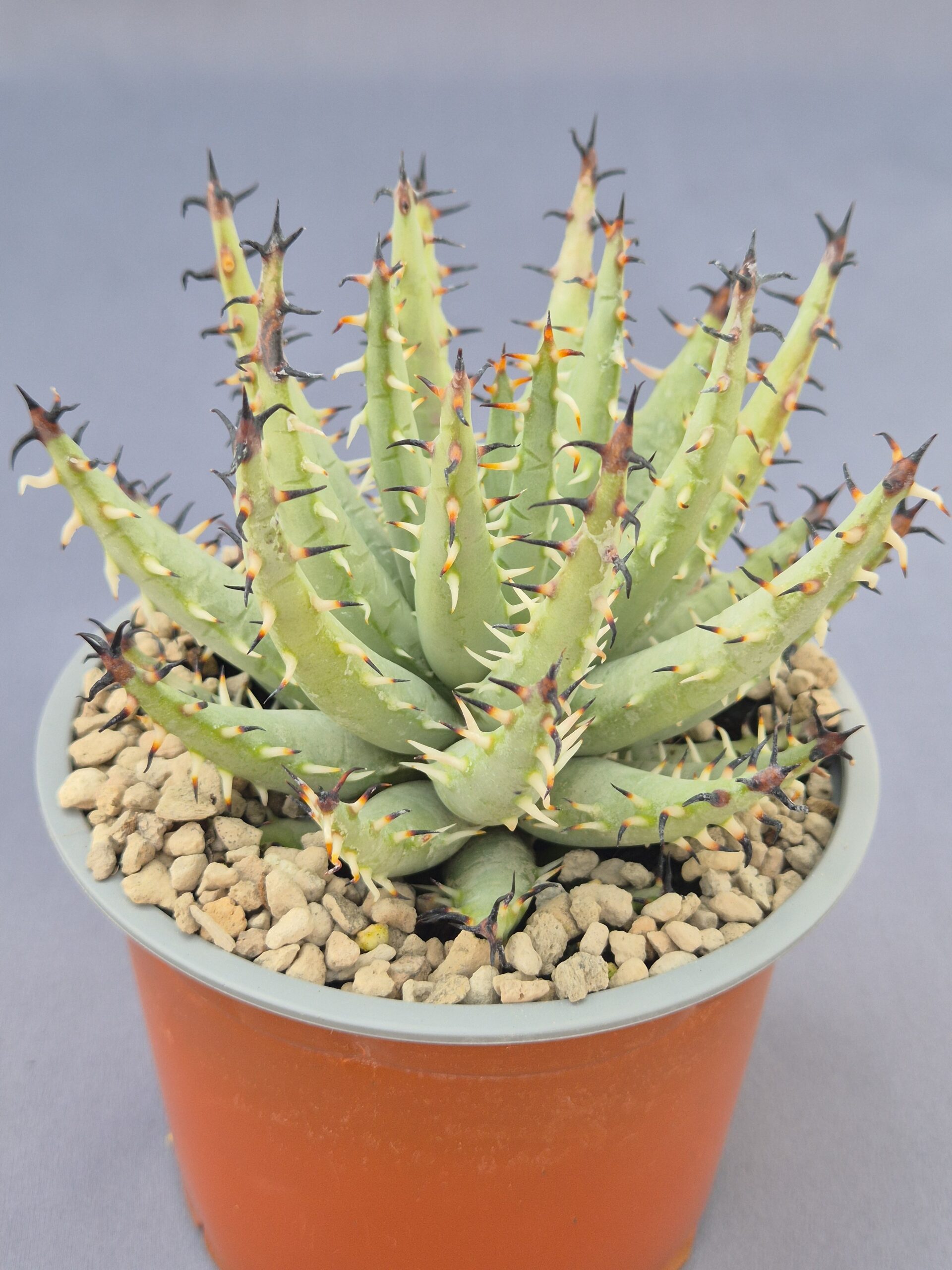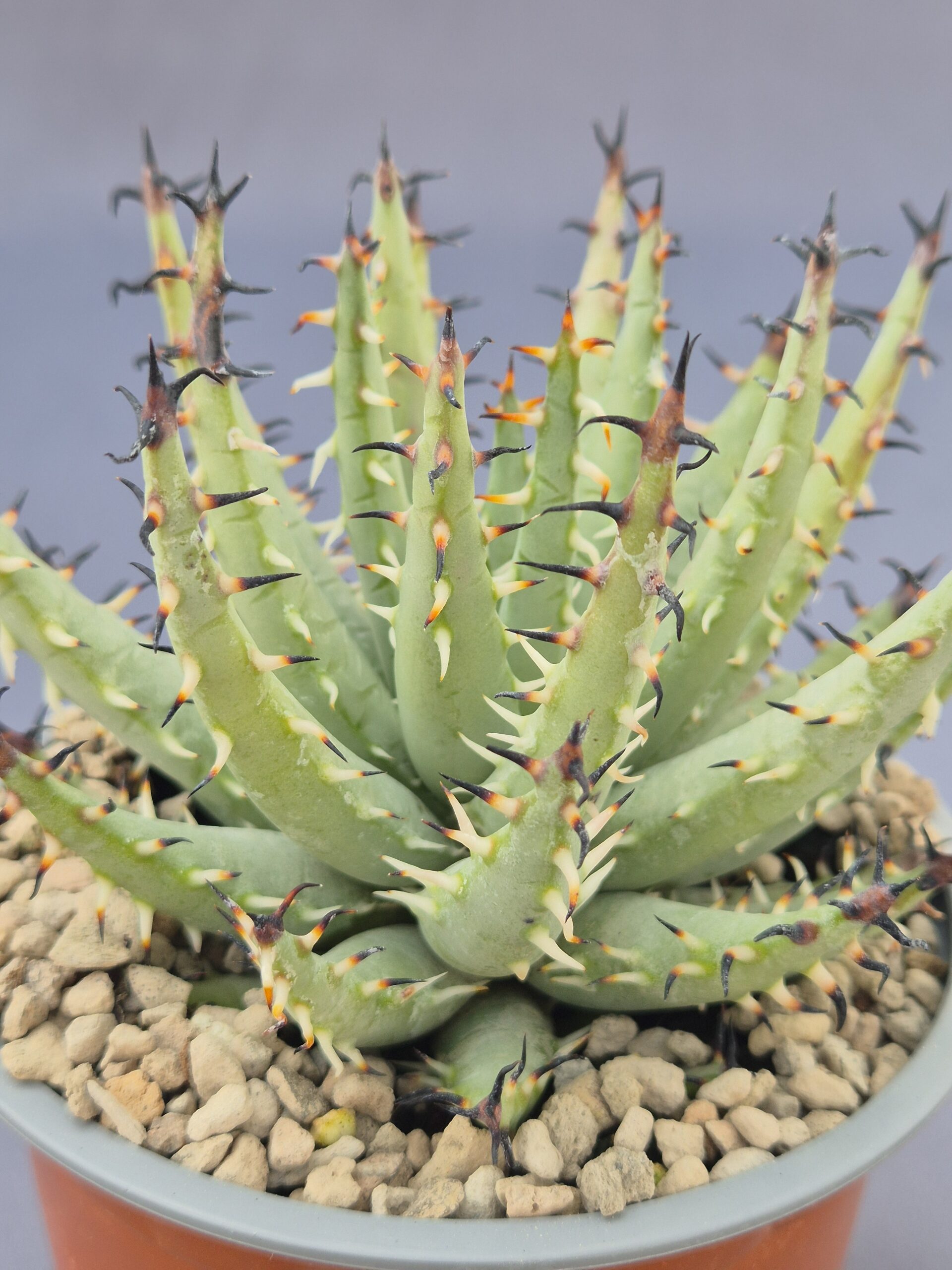 🌿Forma: roseta compacta y muy cerrada, formada por hojas triangulares gruesas cubiertas de espinas prominentes en superficie y bordes.