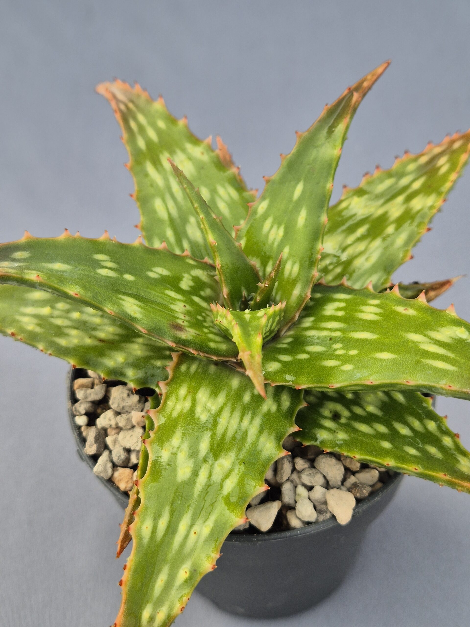 Este Aloe híbrido destaca por su equilibrio entre elegancia y carácter, combinando una forma armónica con una coloración fresca y luminosa. Es una planta muy decorativa, de crecimiento ordenado y aspecto limpio, ideal tanto para colección como para decoración.