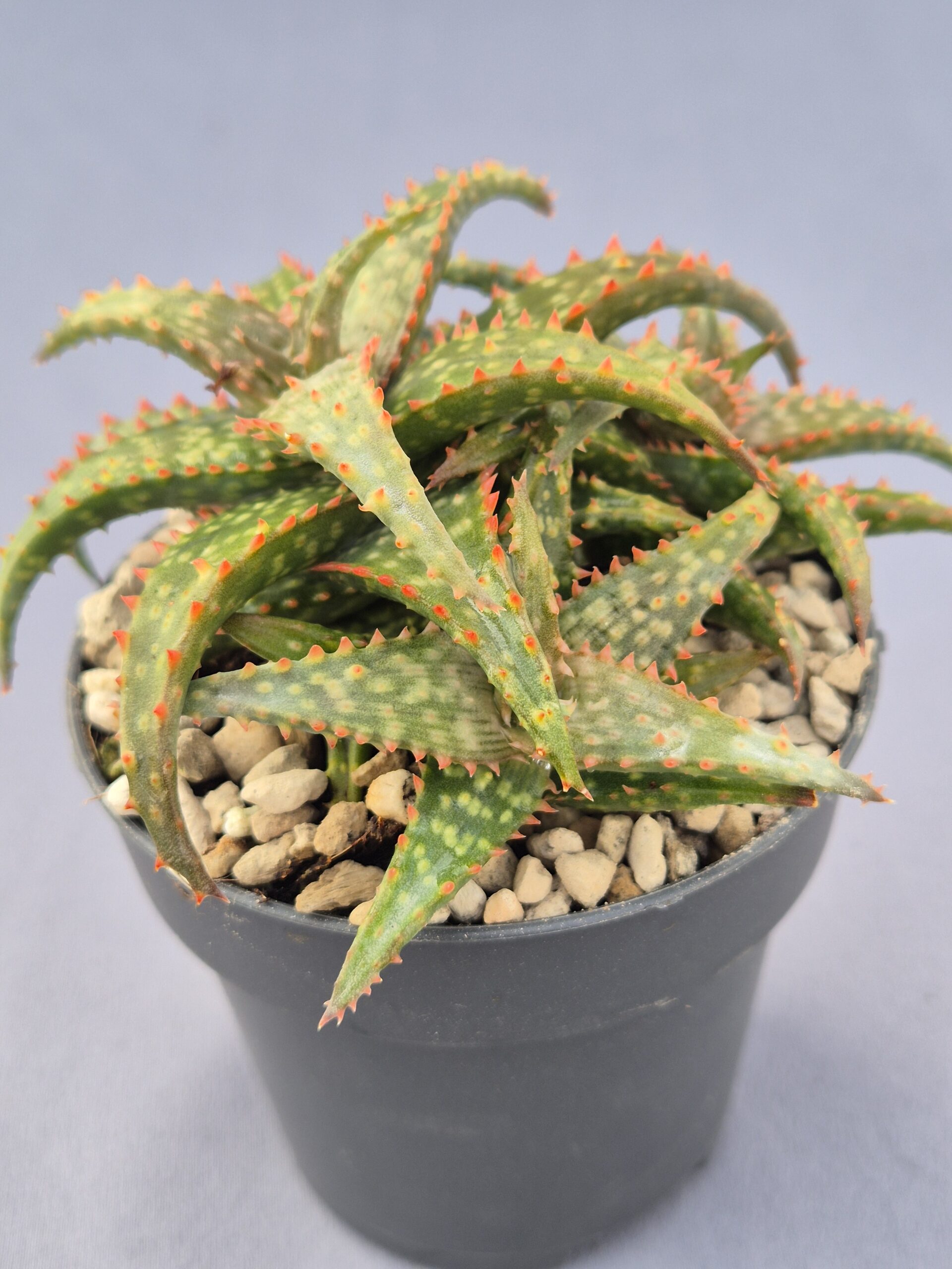 Este Aloe híbrido destaca por su apariencia dinámica y muy ornamental, con hojas arqueadas y una textura marcada que le da un carácter exótico y llamativo. Es una planta compacta, ideal para colecciones de híbridos especiales.