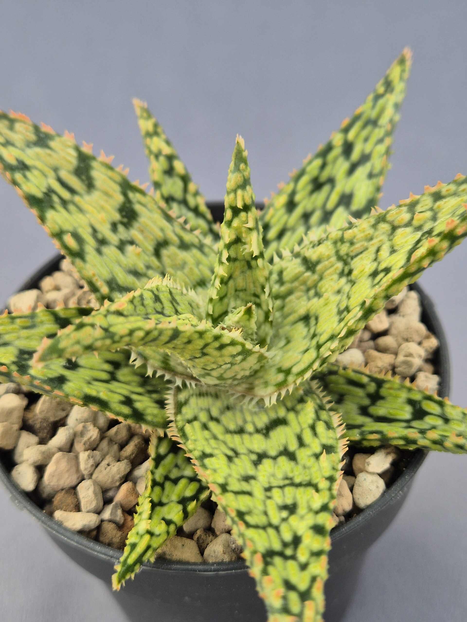 Este Aloe híbrido destaca por su patrón moteado muy definido y su porte equilibrado, ofreciendo una estética llamativa y elegante. Es una planta compacta y muy ornamental, ideal para quienes buscan un aloe diferente y con gran presencia visual.