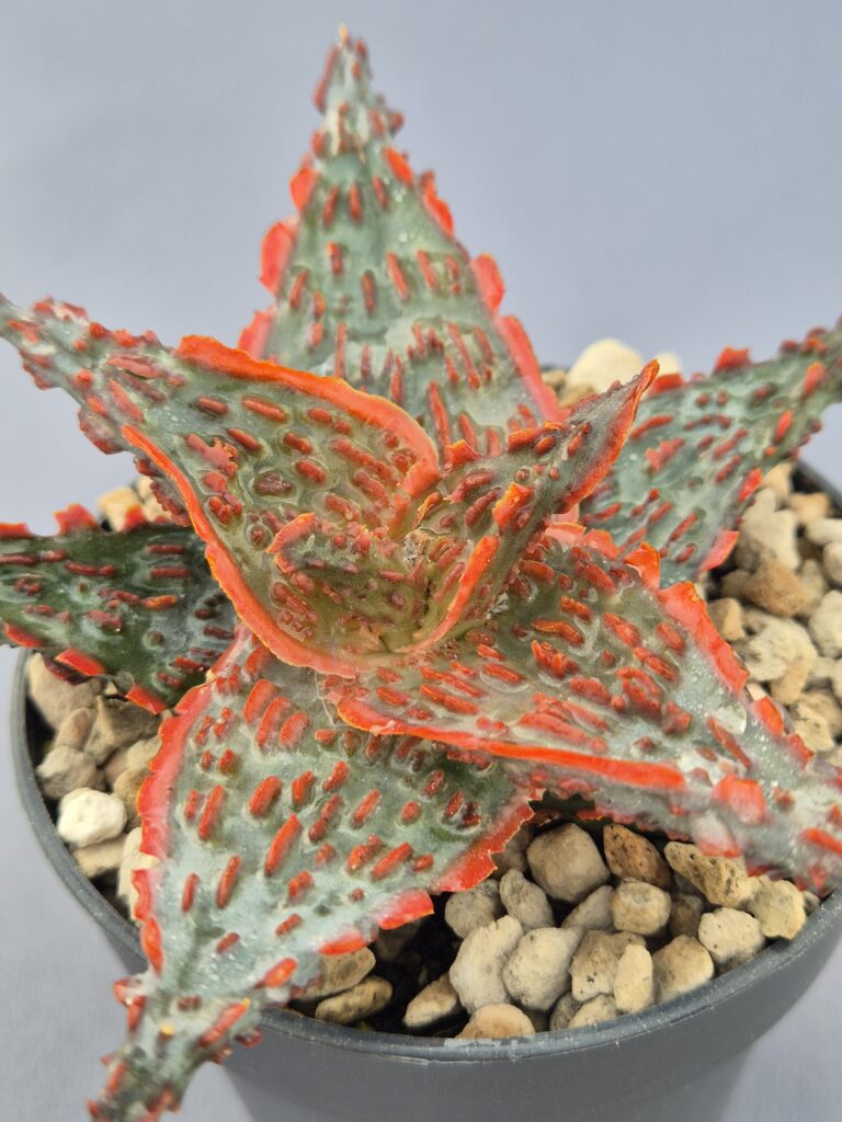 🎨Color: Base verde con un patrón moteado más claro, intensamente remarcado por espinas y bordes de un rojo anaranjado muy vivo, especialmente visibles en hojas jóvenes y bajo buena iluminación.