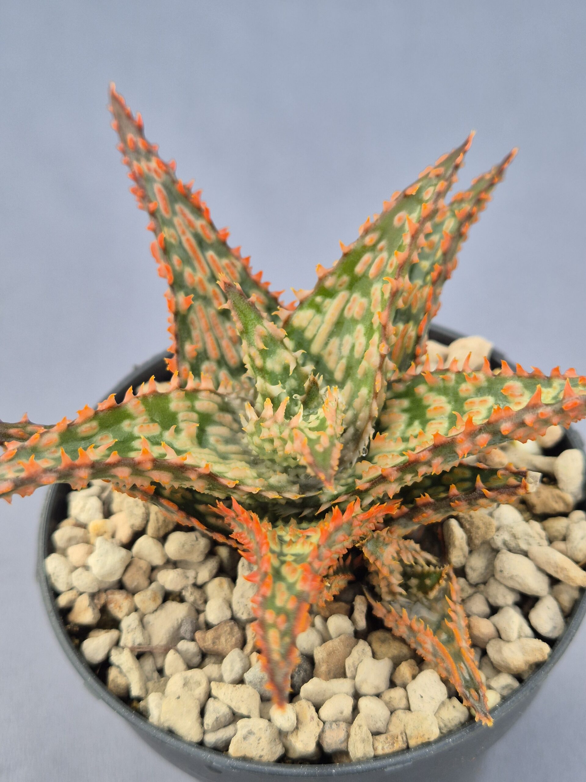 Este Aloe híbrido destaca por su aspecto salvaje y escultórico, con hojas muy armadas y una presencia intensa. Es una planta compacta pero de gran impacto visual, perfecta para colecciones donde se busquen formas agresivas y colores contrastados.