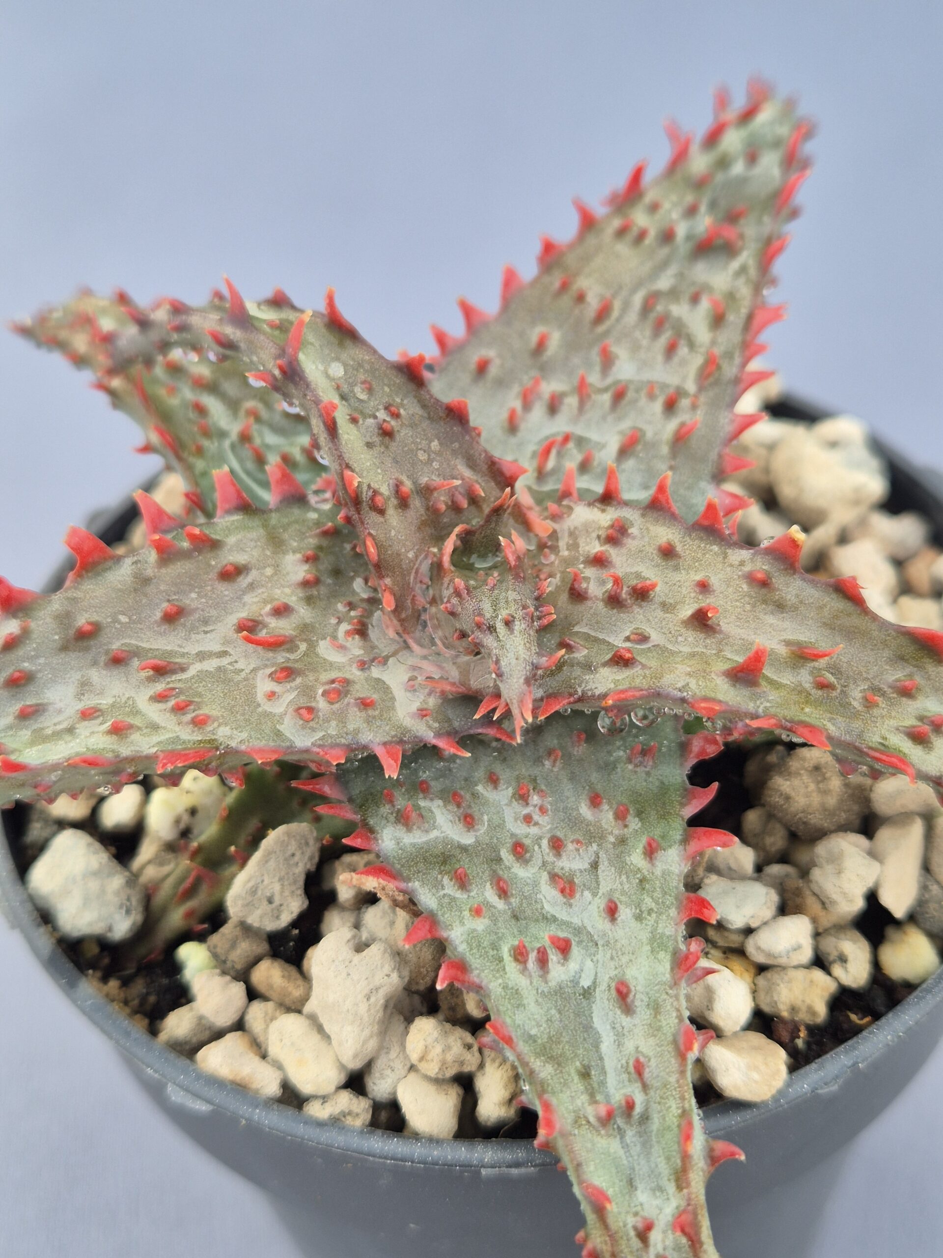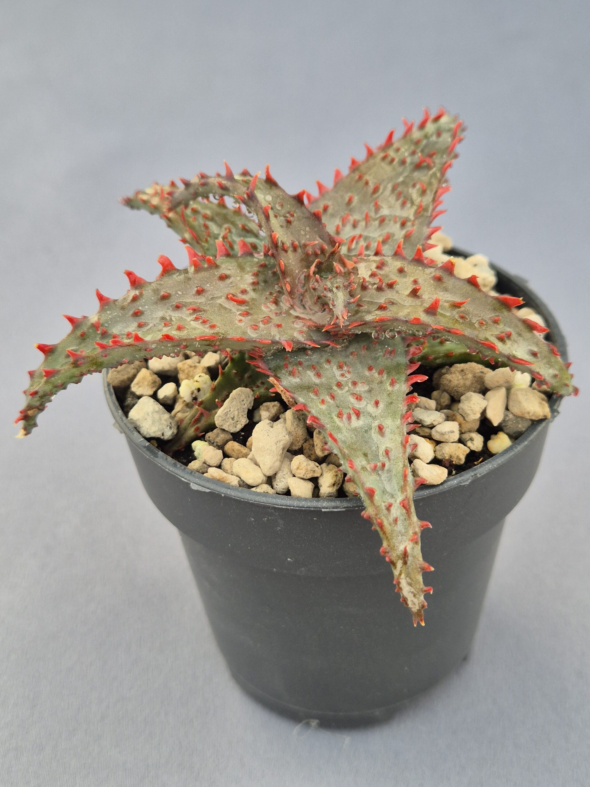 Este Aloe TCT híbrido destaca por su apariencia extravagante y sus colores intensos, mostrando una combinación única de verrugas prominentes y bordes bien marcados que lo convierten en una planta muy llamativa para cualquier colección.