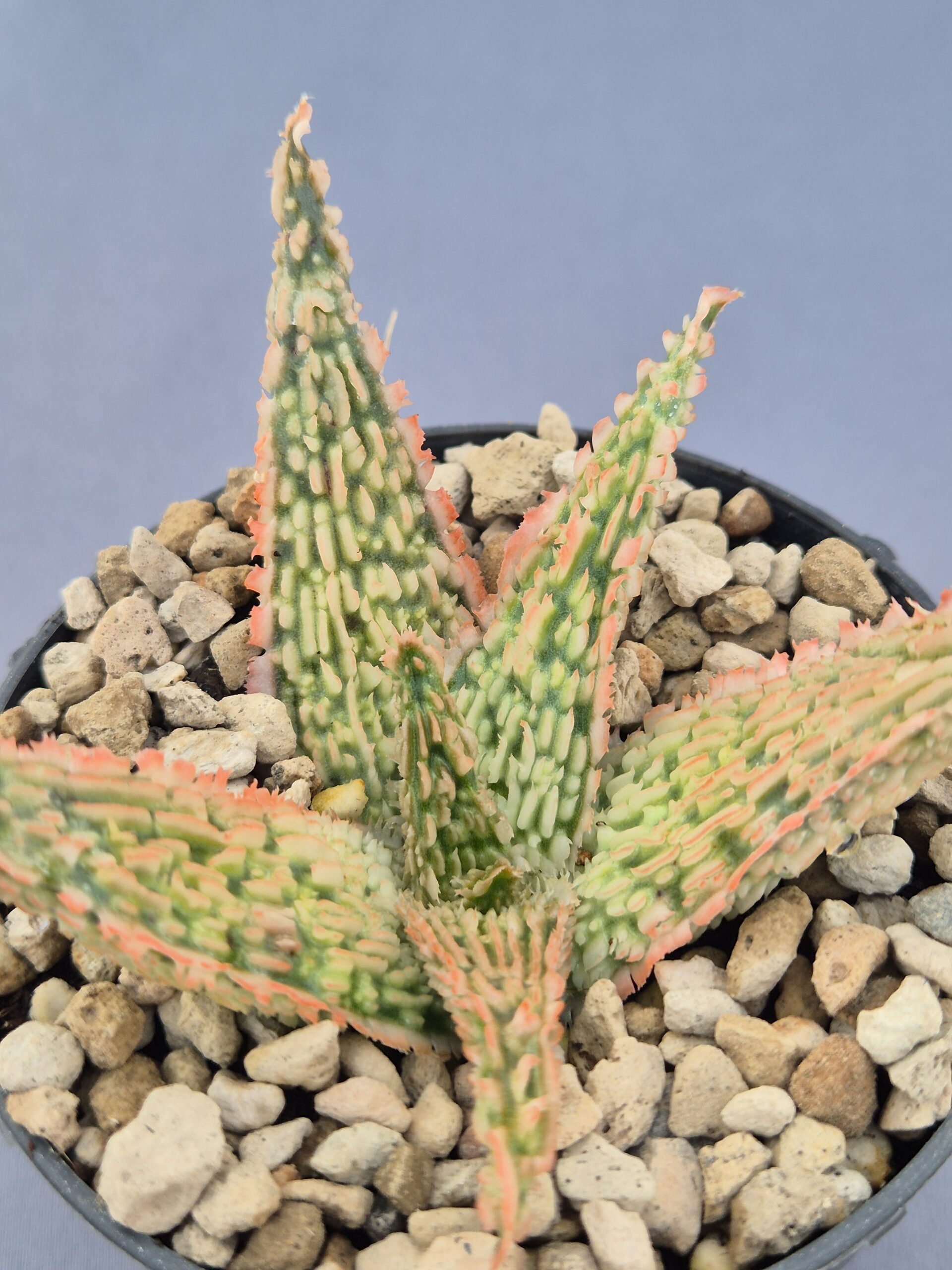 Aloe TCT híbrido de aspecto muy llamativo, con hojas triangulares y robustas cubiertas de tubérculos prominentes que crean un relieve muy marcado. Su combinación de verdes suaves con tonos crema y bordes rosados le da un aspecto casi escultural, ideal para colecciones de aloes híbridos poco comunes.