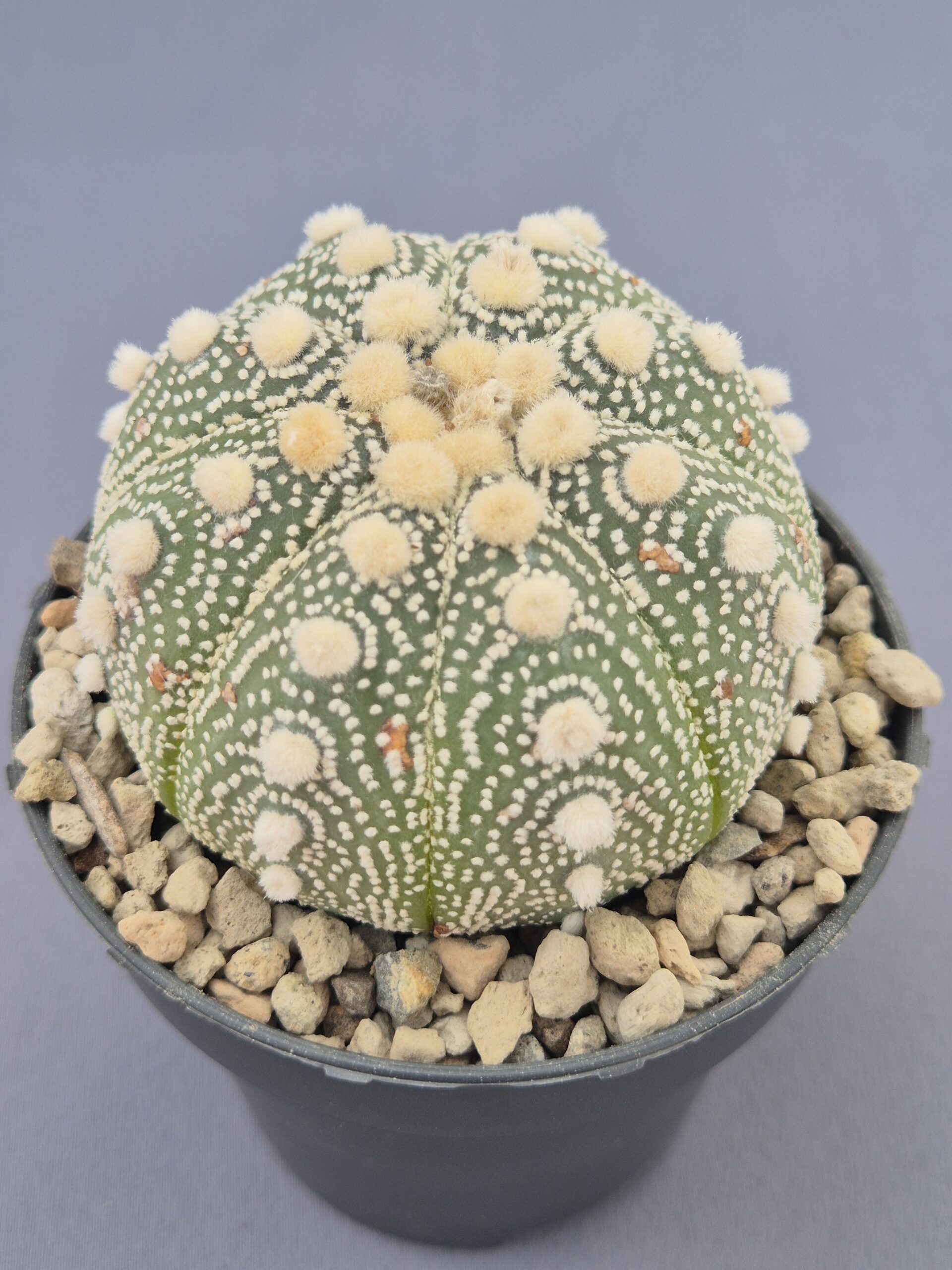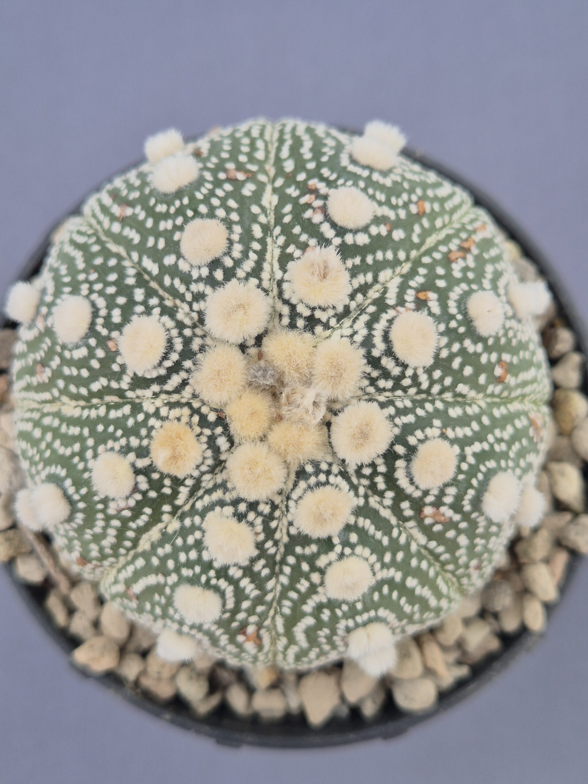 Astrophytum asterias cv. Superkabuto es una de las selecciones más admiradas dentro del género, famosa por su espectacular densidad de puntos blancos que recubren casi por completo el cuerpo. Su simetría perfecta y su estética minimalista lo convierten en una pieza imprescindible para coleccionistas exigentes.