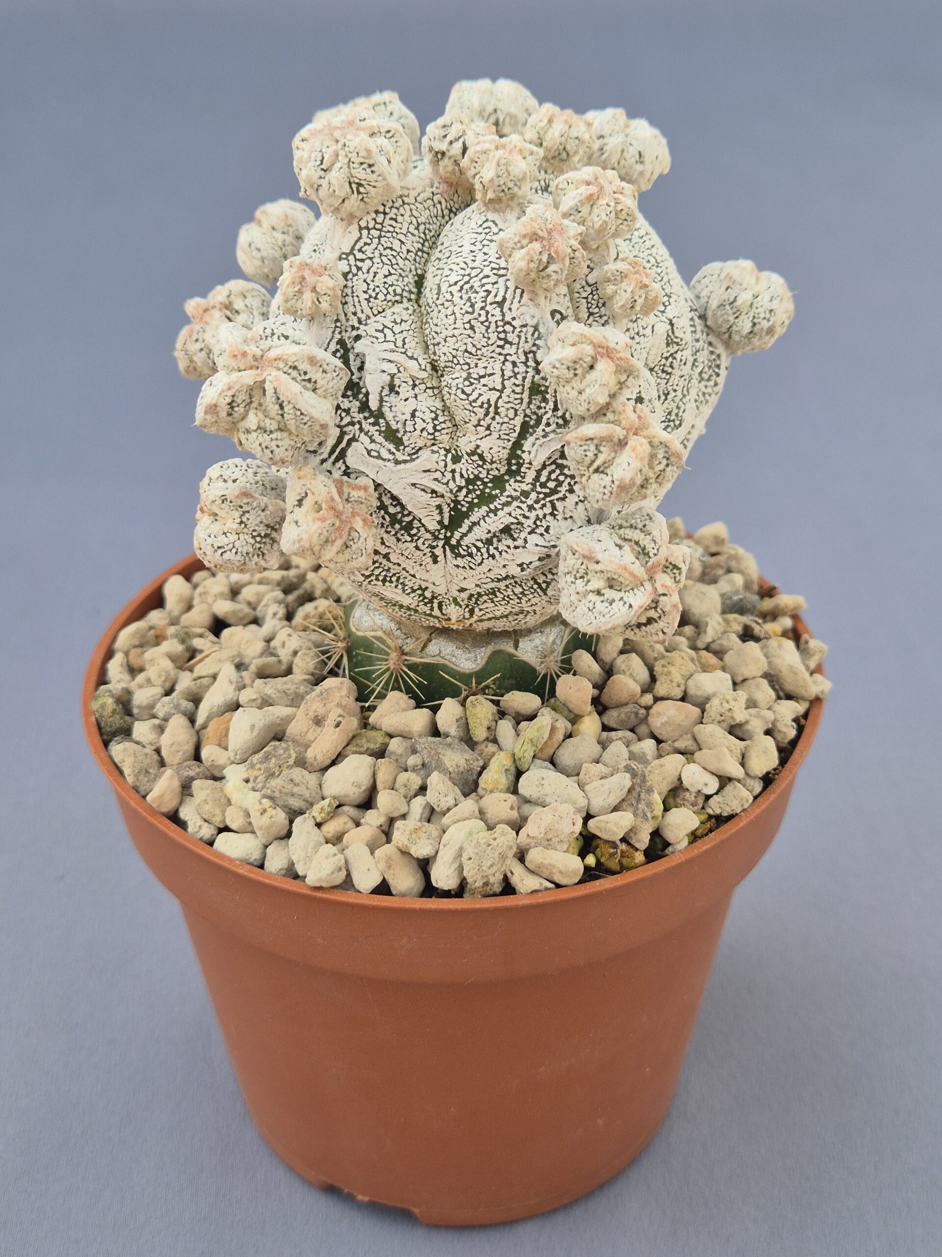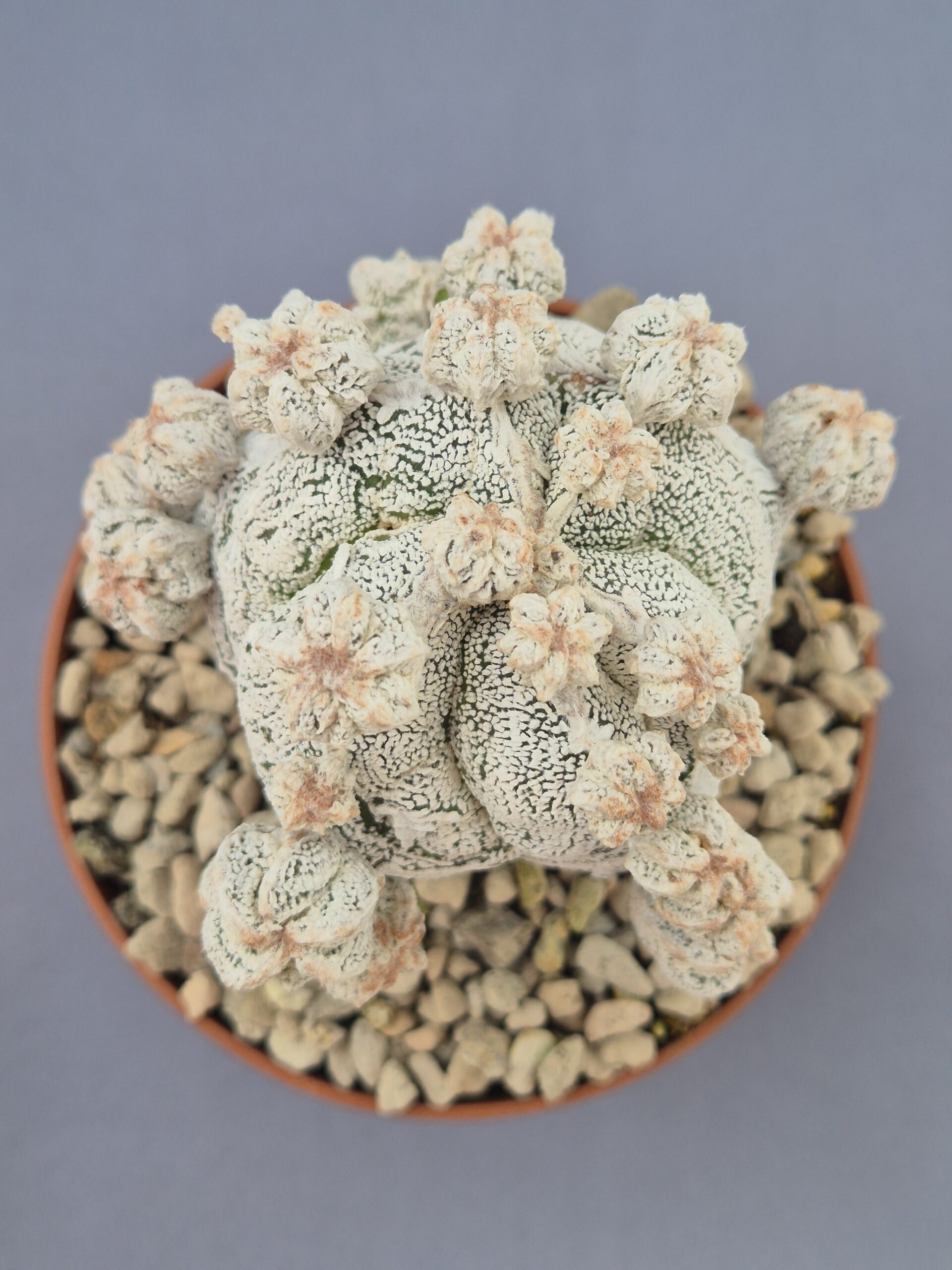 Astrophytum onzuka ‘Snow Ball’ es una auténtica joya dentro del mundo de los cactus japoneses selectos. Esta espectacular selección destaca por su densísima cobertura de puntos blancos que recubren casi por completo el cuerpo, creando un efecto “nevado” muy llamativo y elegante.