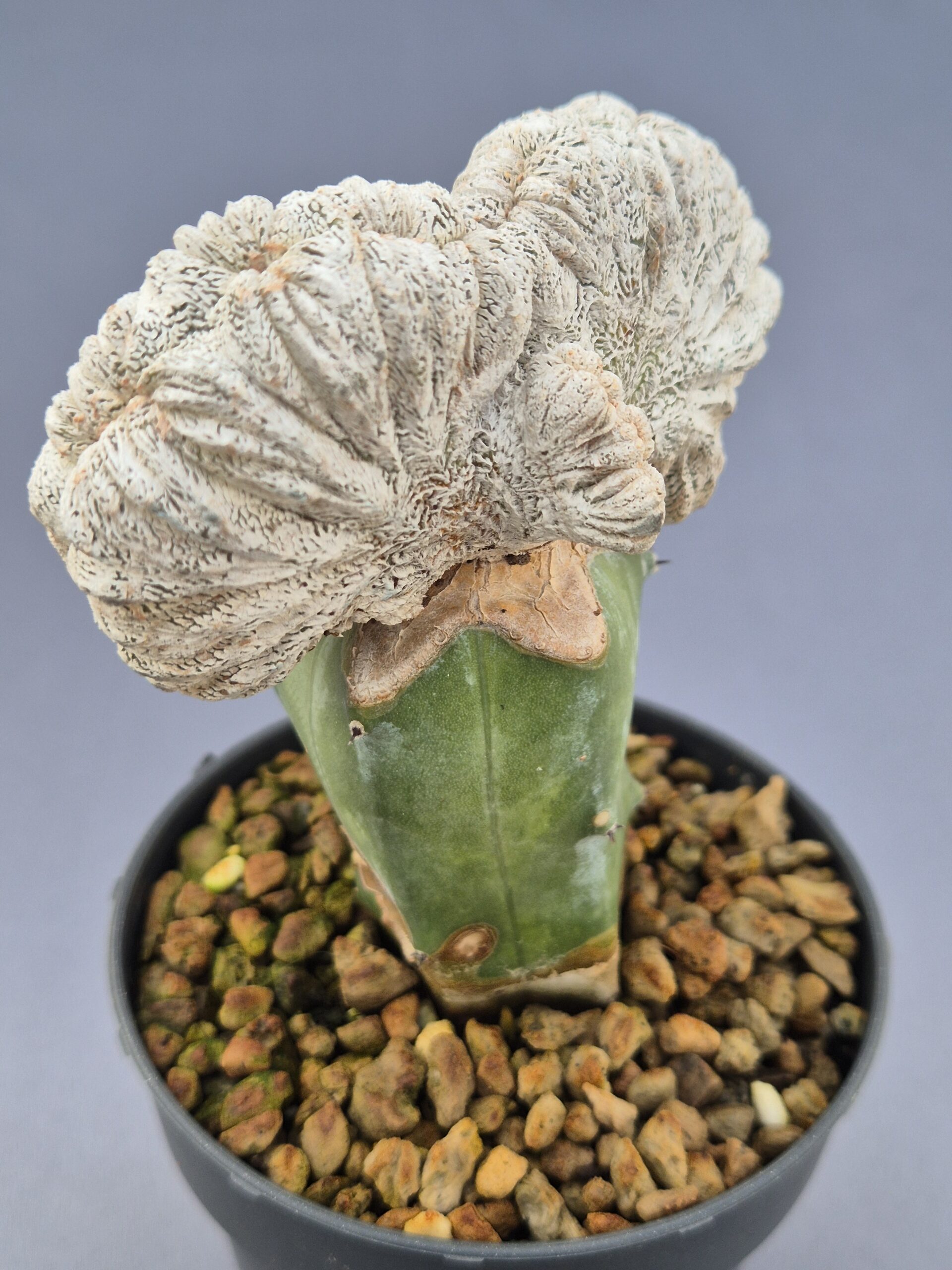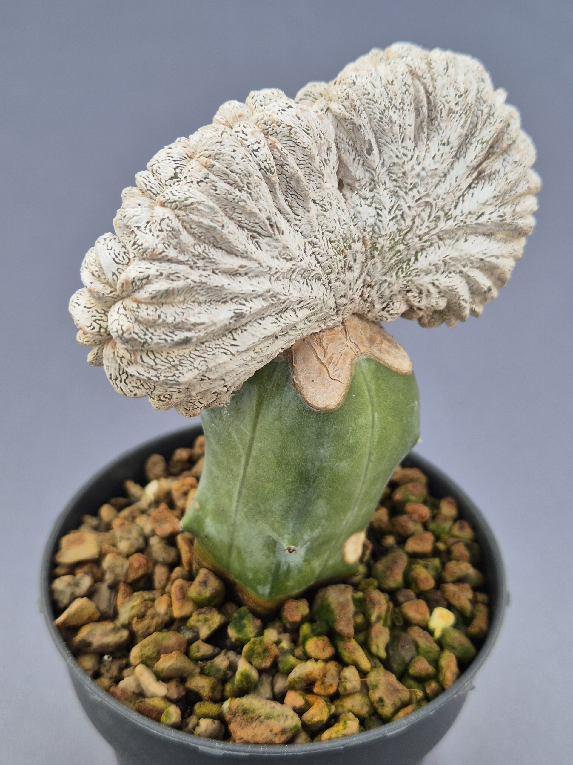 El Astrophytum Onzuko cristata injertado es una auténtica joya botánica, conocida por su forma crestada extremadamente ornamental. Sus crecimientos ondulados y compactos, de textura casi coralina, crean una pieza escultórica única que destaca inmediatamente en cualquier colección. El injerto potencia su vigor, permitiendo que desarrolle crestas aún más definidas y voluminosas con un aspecto elegante y altamente decorativo.