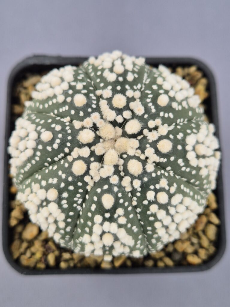 Este Astrophytum quadricostatum es una forma poco común dentro del género, reconocible por sus cuatro costillas bien marcadas y su superficie completamente cubierta por un denso manto de puntos blancos que le otorgan un aspecto aterciopelado. Su apariencia compacta, simétrica y muy limpia lo convierte en una pieza especialmente valorada por coleccionistas.