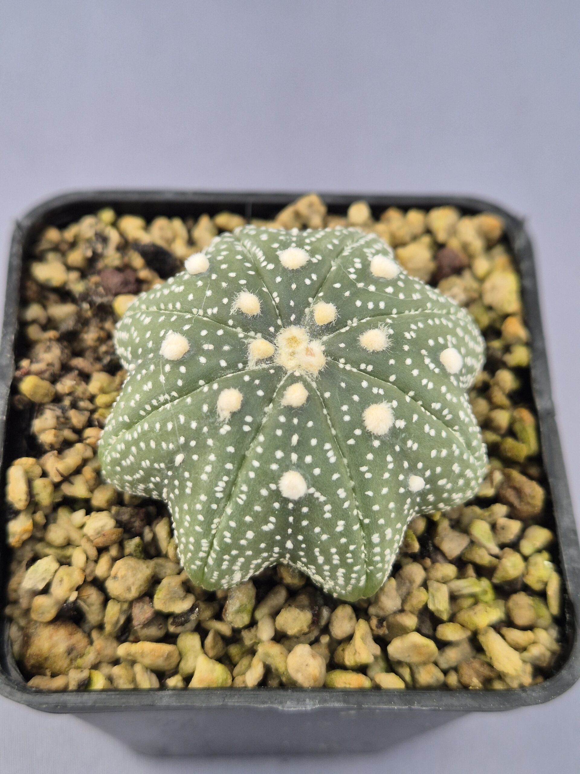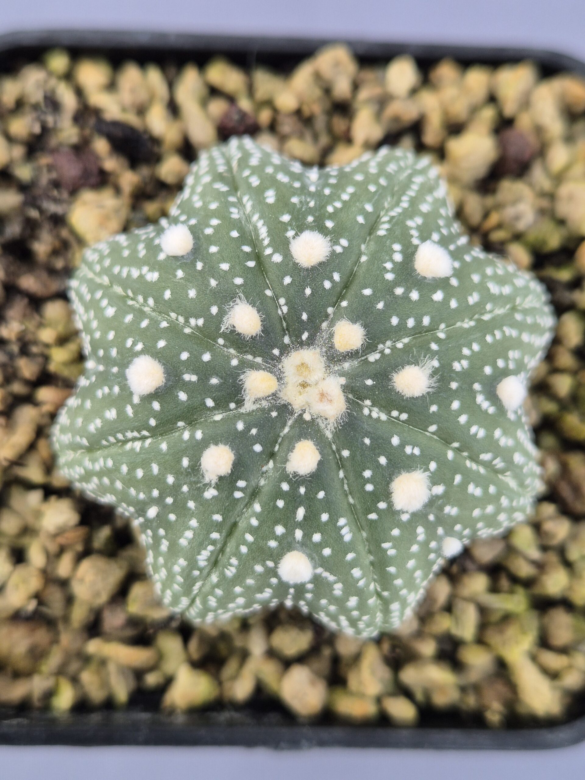 Este precioso Astrophytum destaca por su forma estrellada perfectamente definida, con costillas marcadas y simétricas que le dan un aspecto delicado y geométrico. Sus areolas blancas y aterciopeladas crean un contraste encantador con el verde profundo del cuerpo, aportándole ese toque característico que hace tan especiales a los cultivares tipo «Star Shape». Una planta elegante, llamativa y muy apreciada por coleccionistas que buscan ejemplares únicos.