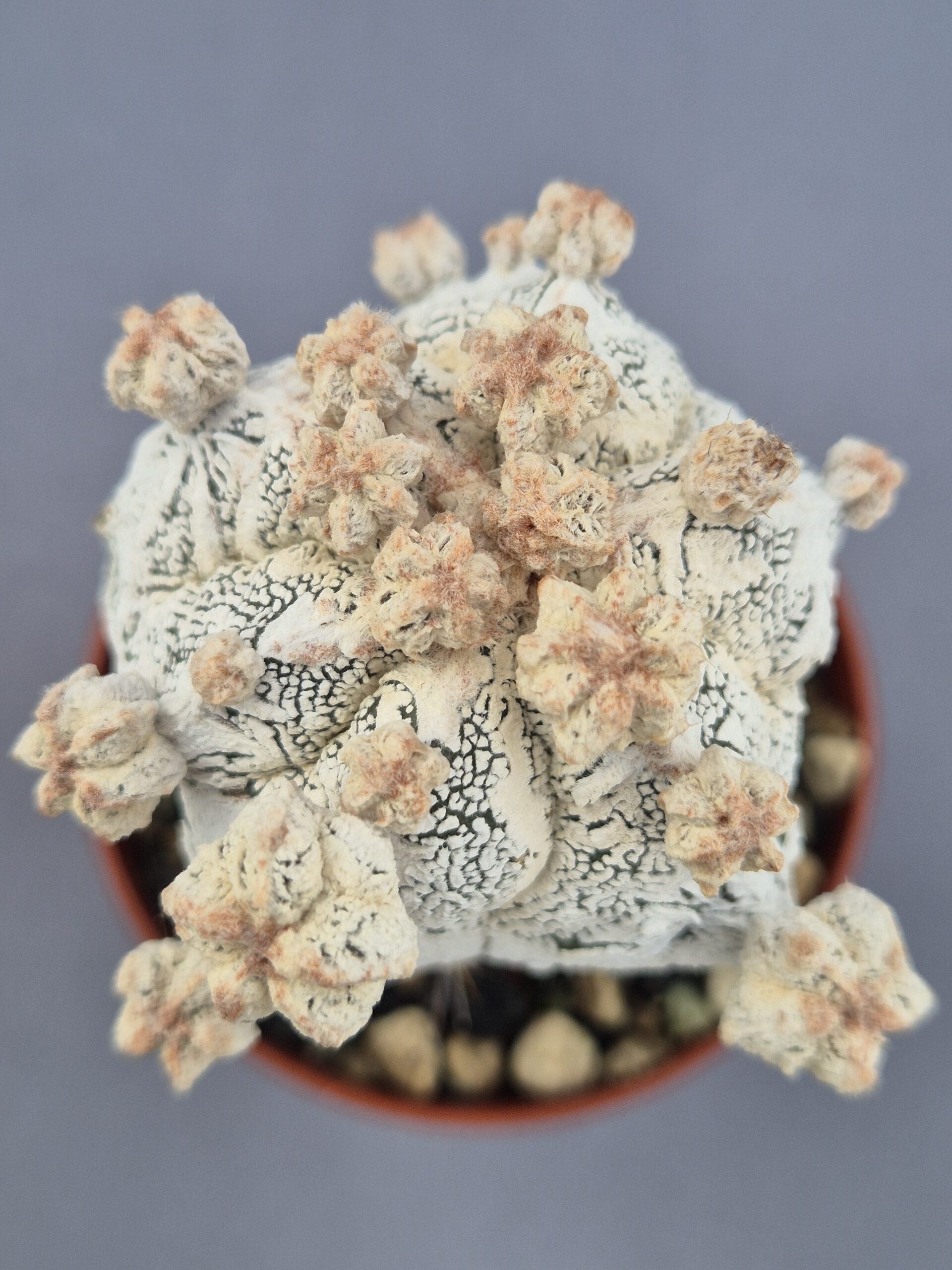 El Astrophytum Super White Hakkun injertado es una auténtica joya botánica, reconocible al instante por su epidermis intensamente blanca y su patrón quebrado que parece esculpido a mano. Sus protuberancias lanosas, que coronan toda la superficie, aportan un aspecto único, casi escultórico, que lo convierte en una pieza especialmente apreciada por coleccionistas exigentes. Al estar injertado, su crecimiento es más vigoroso y estable, permitiendo disfrutar plenamente de su rareza.