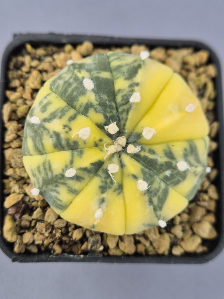 El Astrophytum V-TYPE es un cactus extraordinariamente llamativo, reconocido por sus marcados patrones en forma de “V” que recorren cada una de sus costillas. Su denso moteado blanco y sus areolas lanosas le otorgan un aspecto texturizado, elegante y muy ornamental, convirtiéndolo en una pieza imprescindible para quienes buscan ejemplares selectos y de presencia única dentro de su colección.