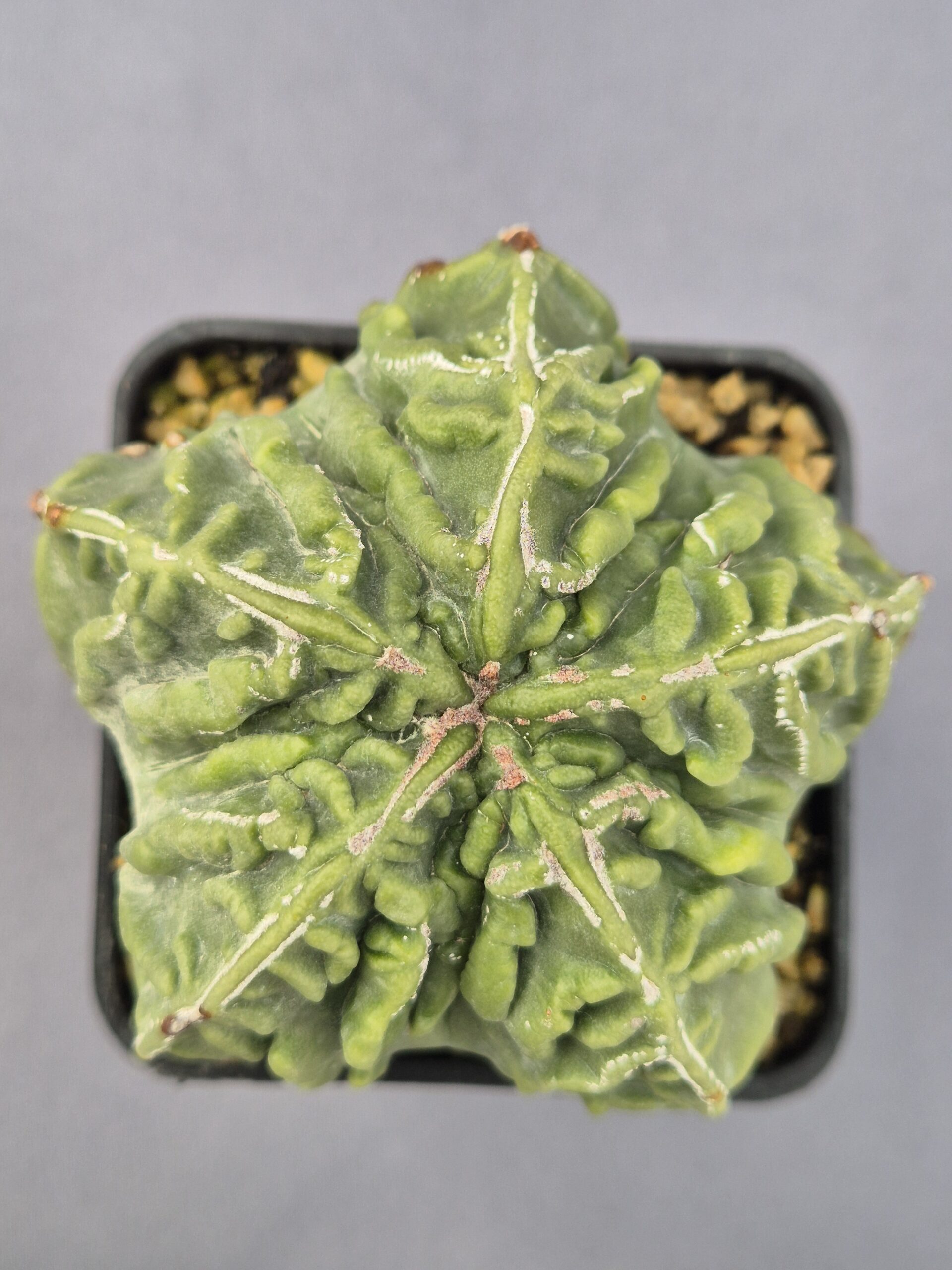 Este espectacular híbrido de Astrophytum Yoroi × Fukuryū es una pieza verdaderamente única, donde se combinan lo mejor de ambos parentales: la estructura marcada y poderosa del Yoroi con las ondulaciones irregulares y carnosas del Fukuryū. Su superficie presenta un relieve profundo y escultórico que hace que cada ejemplar sea irrepetible, con un aspecto casi “armadurado” que cautiva a cualquier coleccionista exigente.