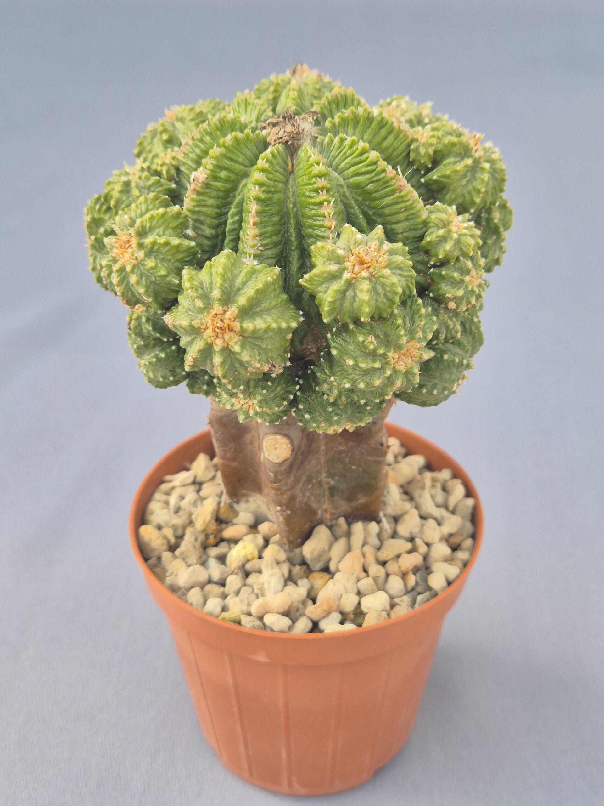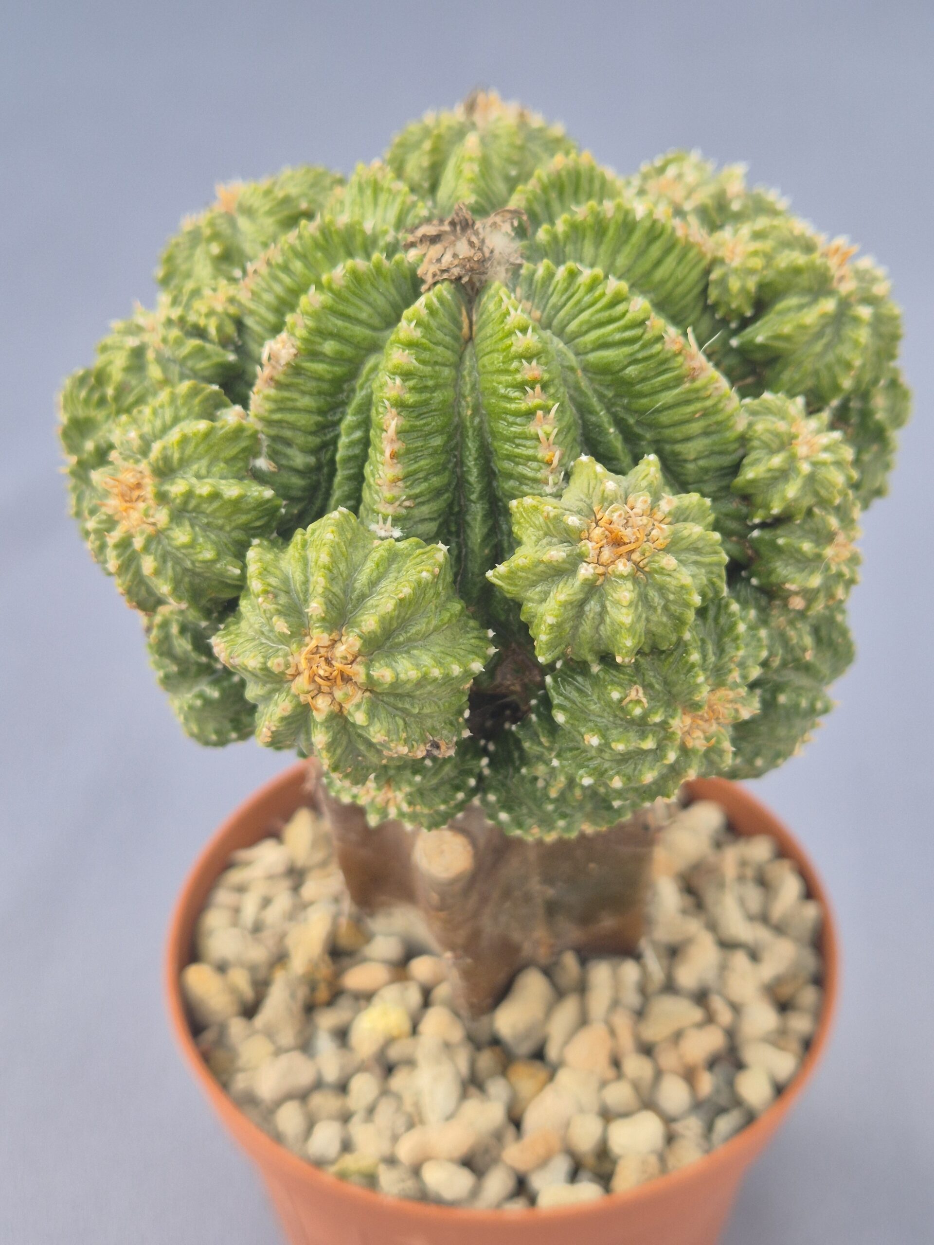 Aztekium ritteri injertado es uno de los cactus más raros y apreciados por coleccionistas debido a su crecimiento extremadamente lento y su forma tan particular. En esta versión injertada, la planta desarrolla con mayor vigor manteniendo su estética única, lo que permite disfrutar antes de su característica silueta compacta y profundamente costillada.