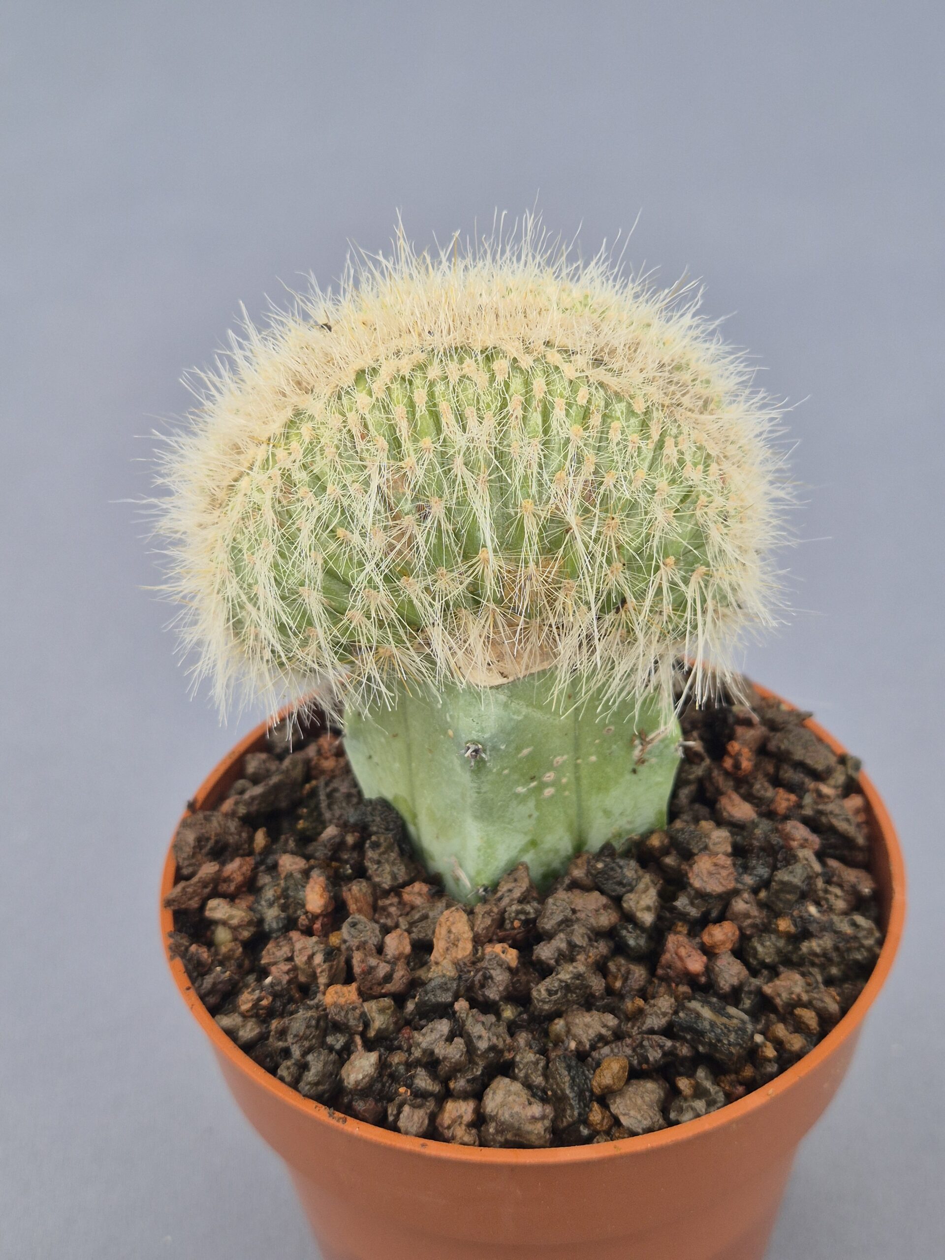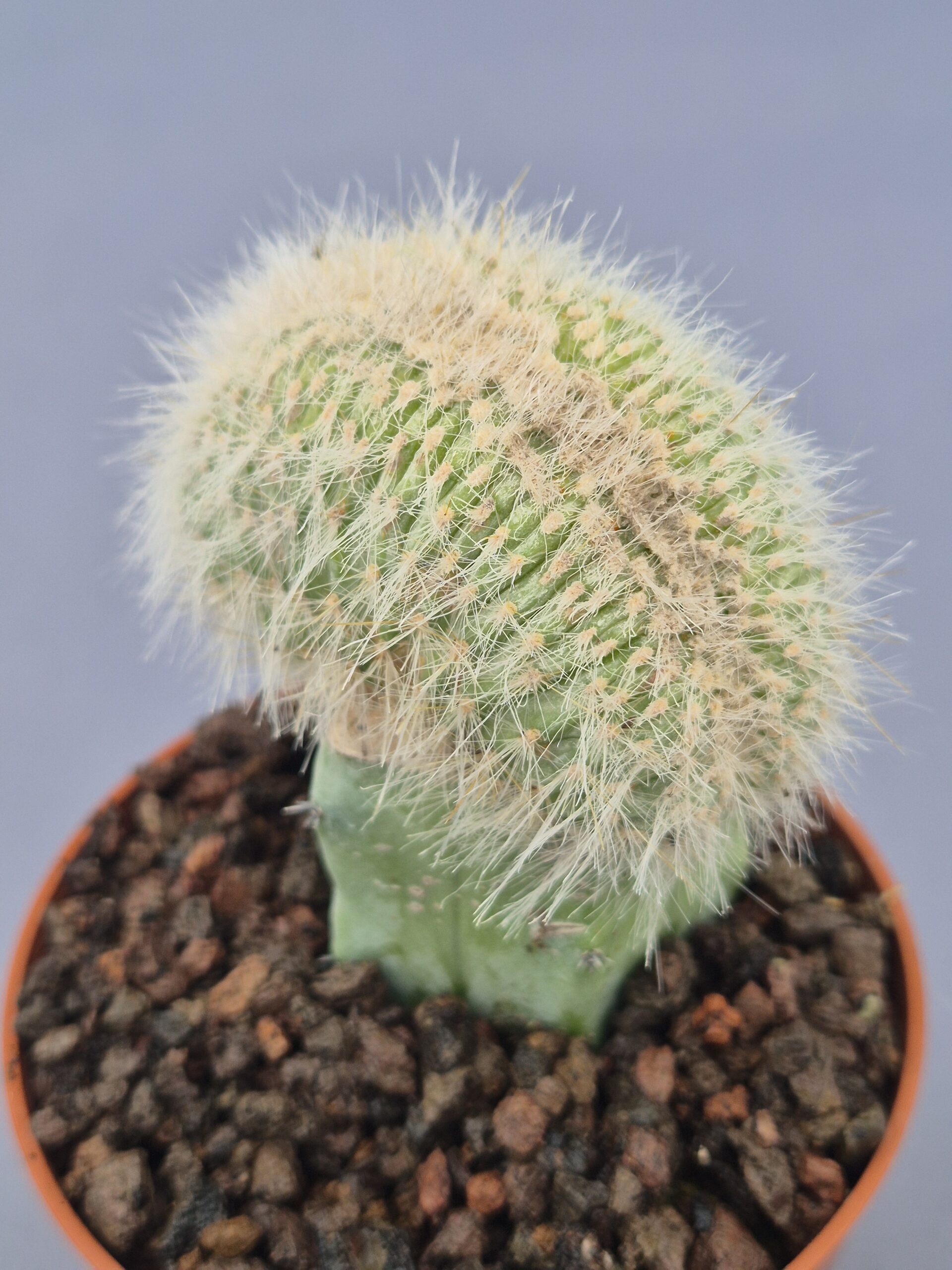 Cleistocactus strausii cristata es una forma crestada muy apreciada del popular “cactus antorcha plateada”, destacando por su aspecto etéreo y su abundante cobertura de espinas finas y sedosas. Su crecimiento irregular crea siluetas únicas y muy decorativas.