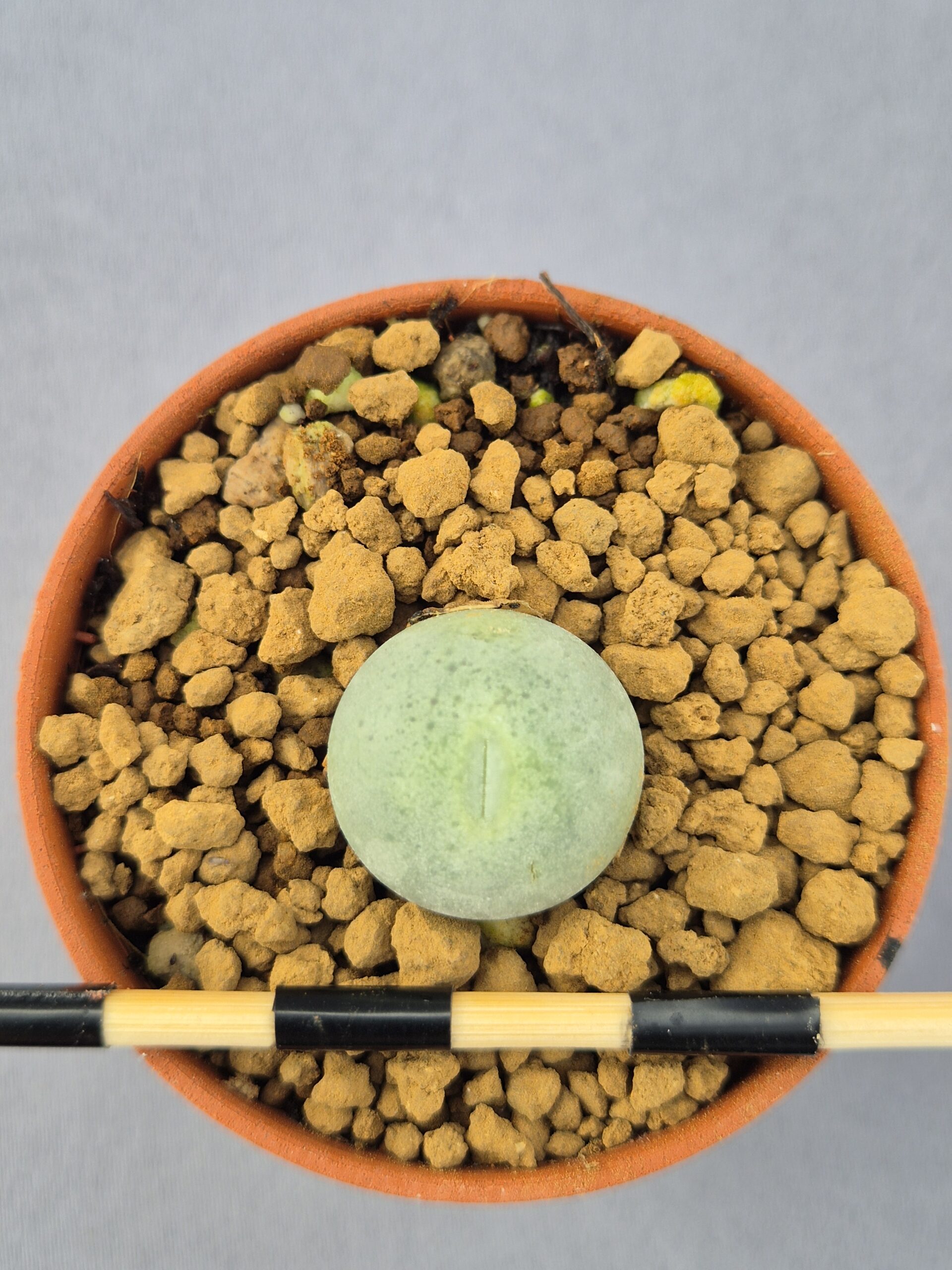 Este Conophytum Calculus es un ejemplar perfectamente esférico y compacto, con su característico aspecto de “pebble plant”. Su superficie lisa en tonos verde grisáceo y la hendidura central bien definida lo convierten en una planta extremadamente elegante y minimalista.