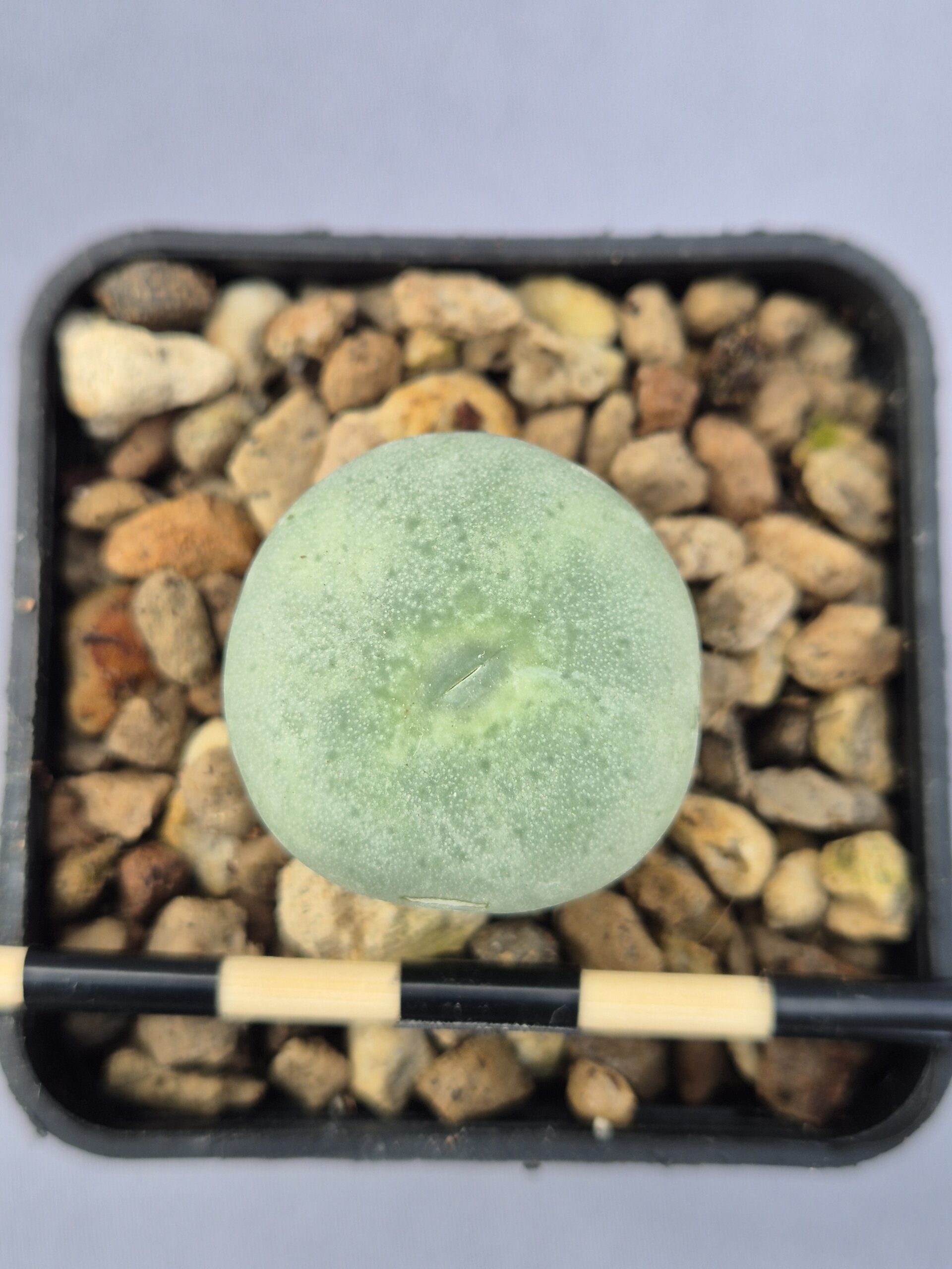 Este Conophytum flavum subsp. ornatum SB1117 destaca por su forma redondeada, compacta y lisa, con un tono verde glauco muy uniforme y una hendidura central bien definida. Su apariencia minimalista y su superficie aterciopelada lo convierten en un ejemplar muy elegante dentro del género.