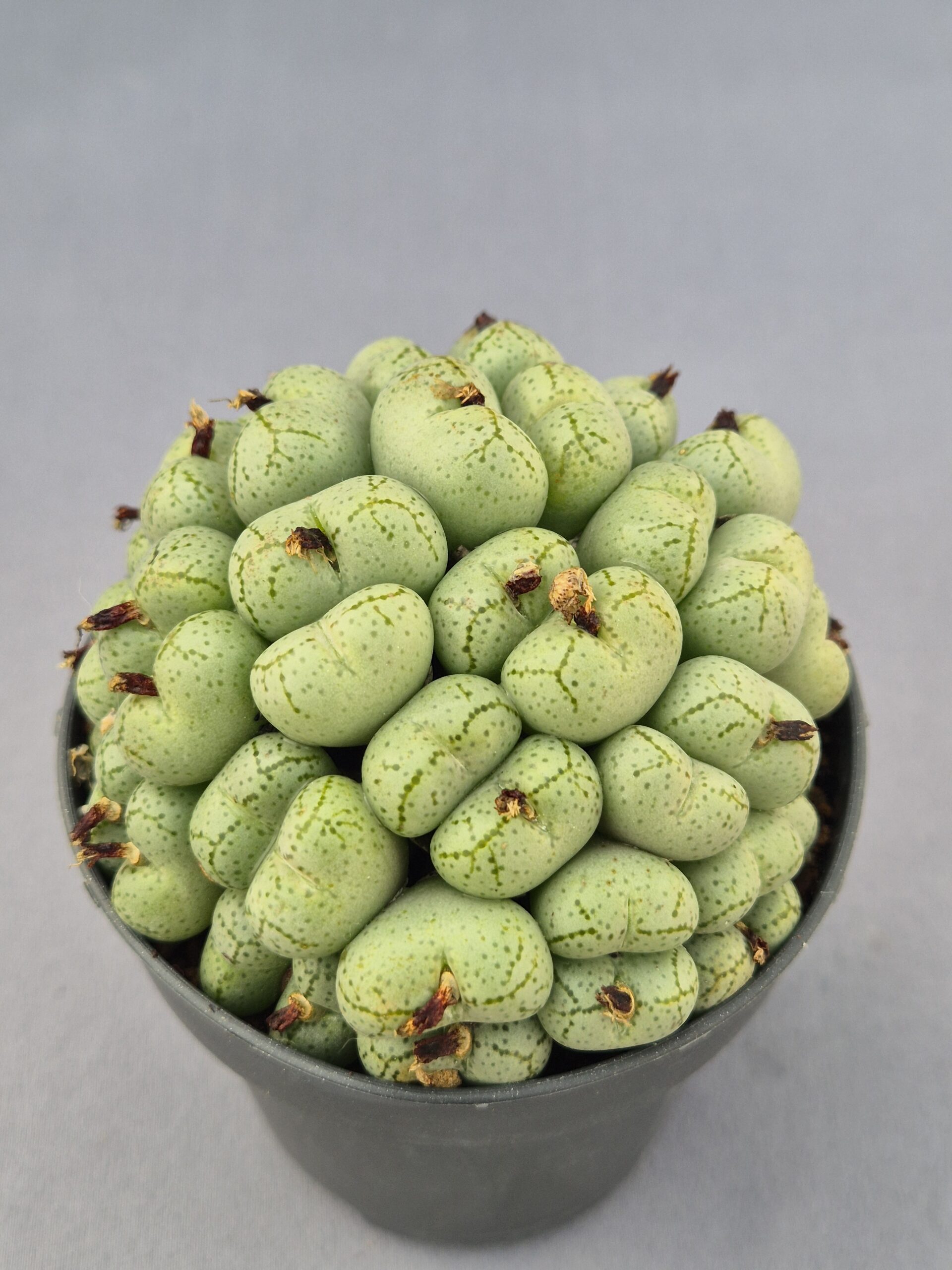 Este Conophytum híbrido forma una densa colonia de cuerpos globosos y compactos, de tono verde suave con moteado más oscuro en la superficie. Su aspecto es fresco, pulido y muy característico dentro del género, creando un efecto visual limpio y uniforme.