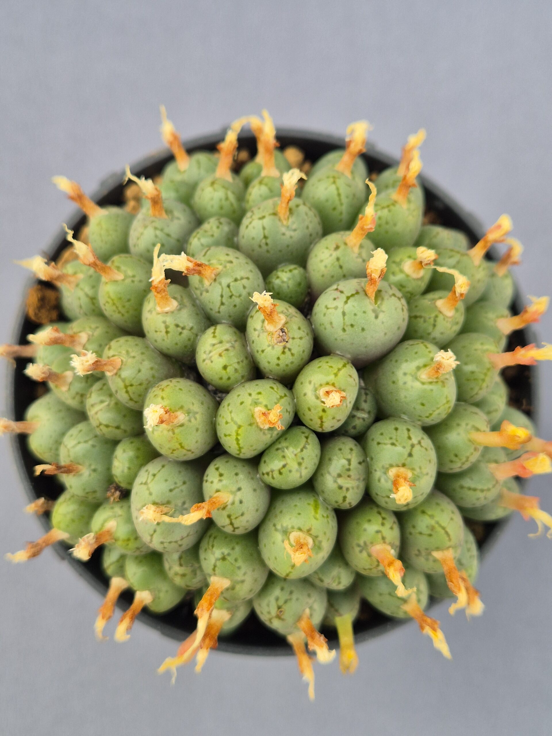 Este hermoso Conophytum híbrido forma grupos densos de pequeñas cabezas globosas que emergen desde mediados del verano y florecen a comienzos del otoño. Es una planta compacta, de crecimiento lento y muy atractiva por sus tonos verdes moteados y sus curiosas marcas superficiales.