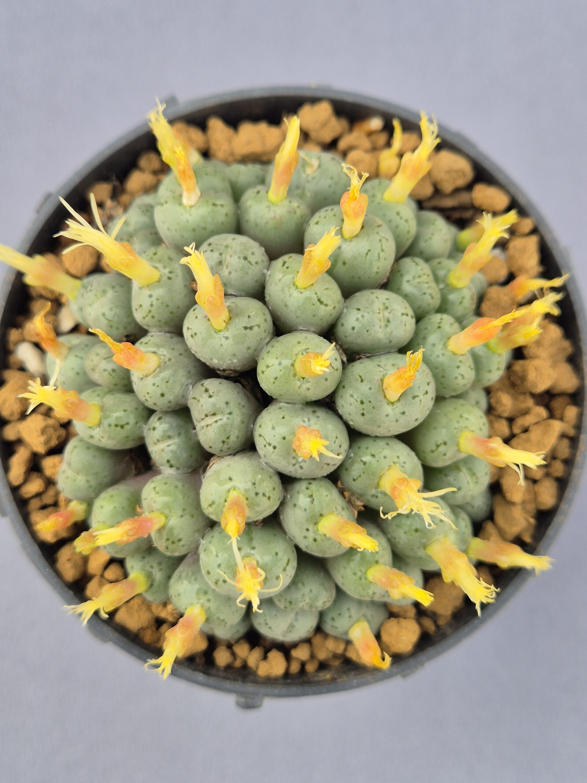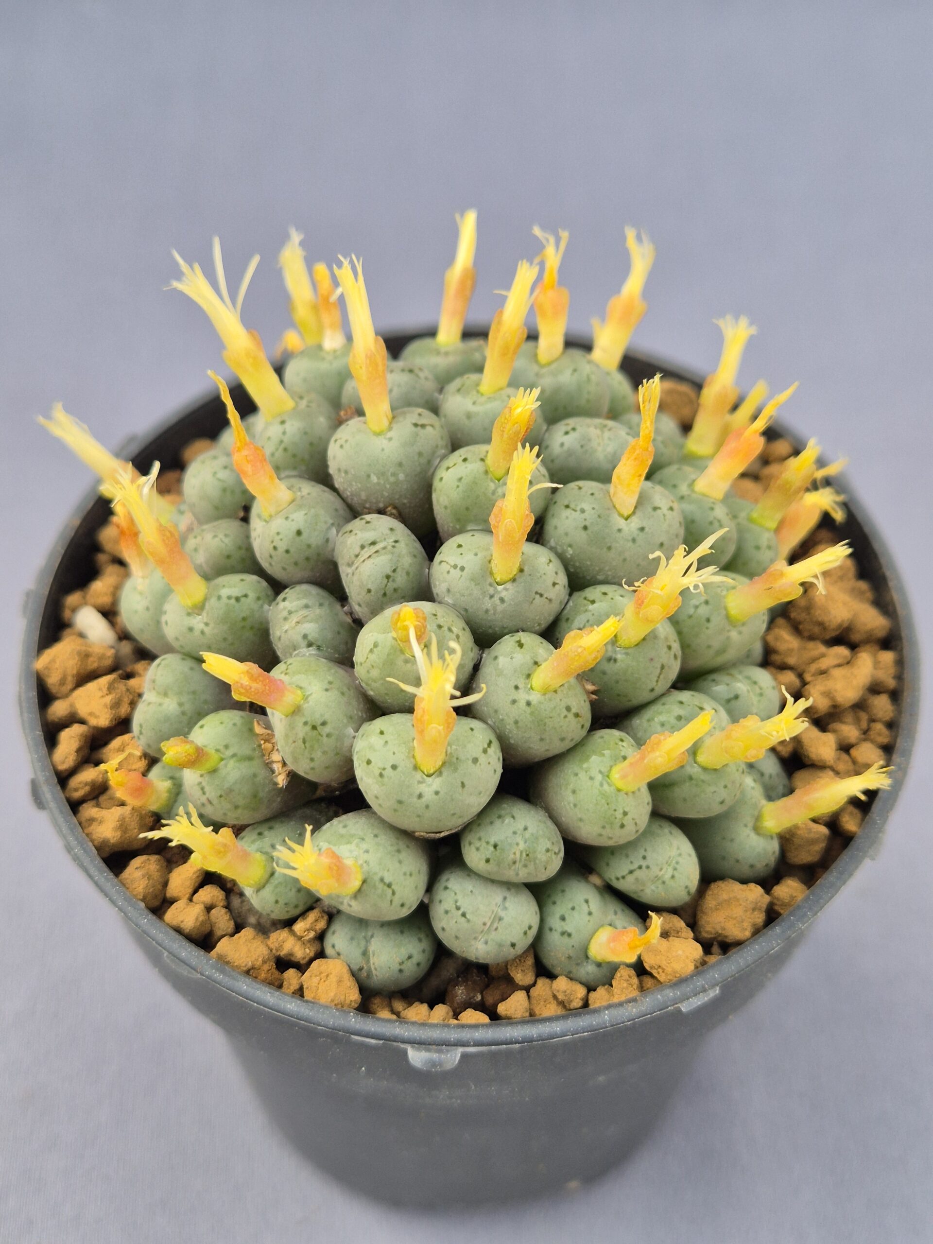 Este Conophytum híbrido forma una densa colonia de pequeñas cabezas globosas que destacan por su tono verde grisáceo y su abundante floración. Es una planta compacta, decorativa y muy apreciada por coleccionistas de suculentas miniatura.