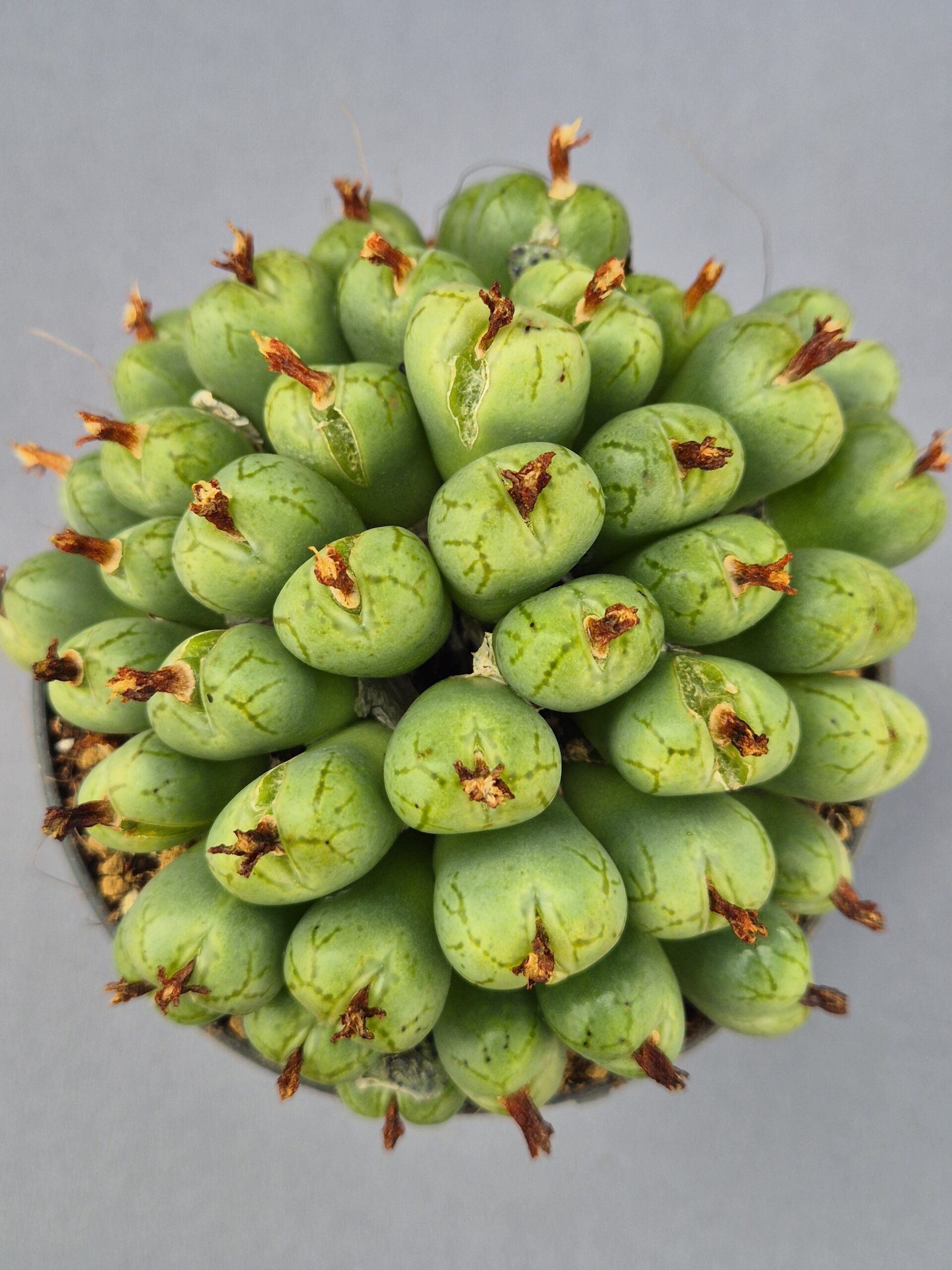 Este hermoso Conophytum híbrido forma una cabeza compacta y simétrica de cuerpos verdes, marcada por líneas translúcidas y restos florales secos que indican su reciente floración. Su aspecto redondeado y fresco lo convierte en una pieza muy atractiva dentro de cualquier colección de suculentas enanas.