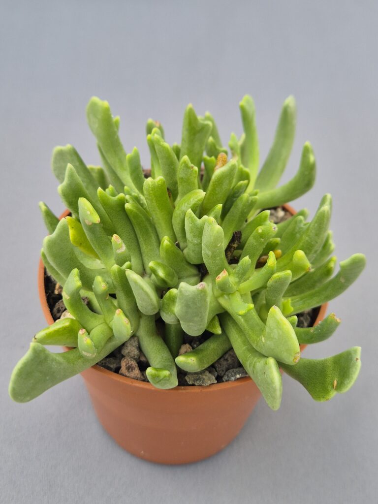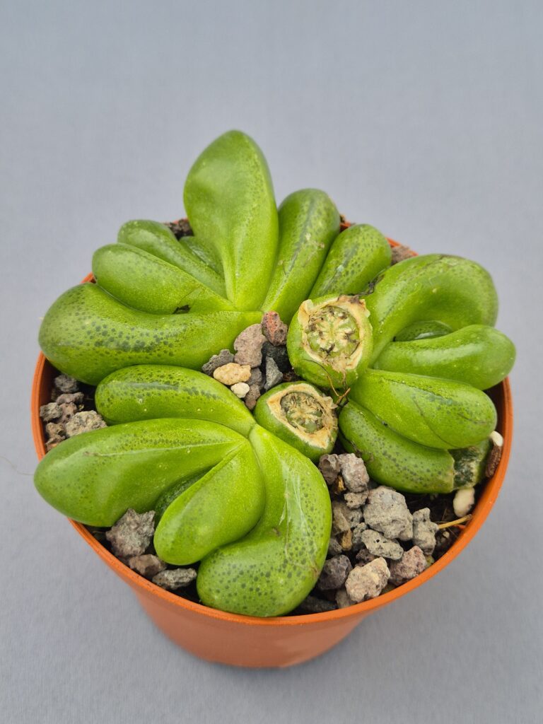 Este Conophytum híbrido forma grupos compactos de cabezas carnosas de tonos verdes suaves. Es una planta de crecimiento lento que destaca por su aspecto redondeado y su patrón moteado, típico del género, además de sus pequeñas flores que emergen desde la hendidura central.