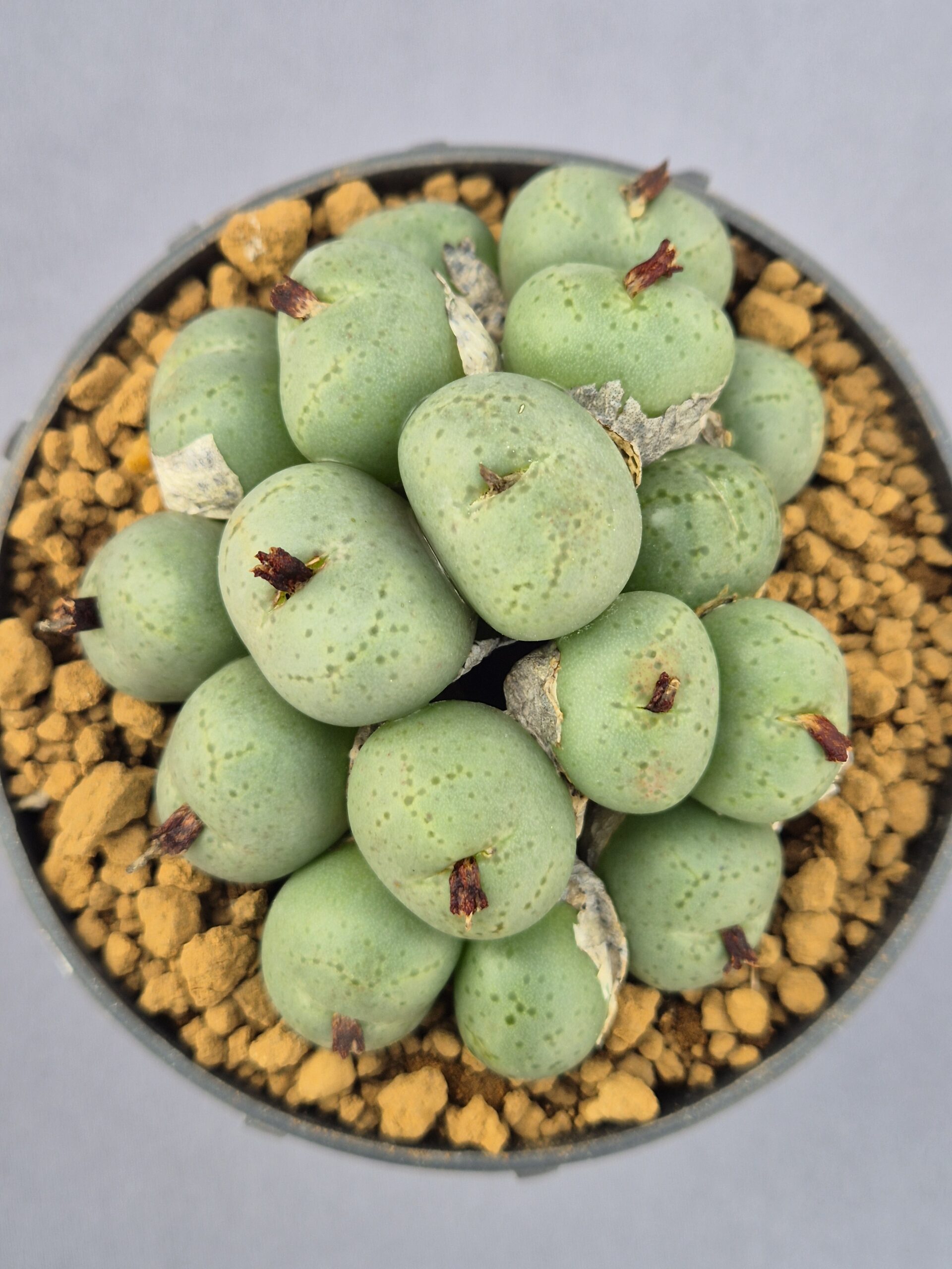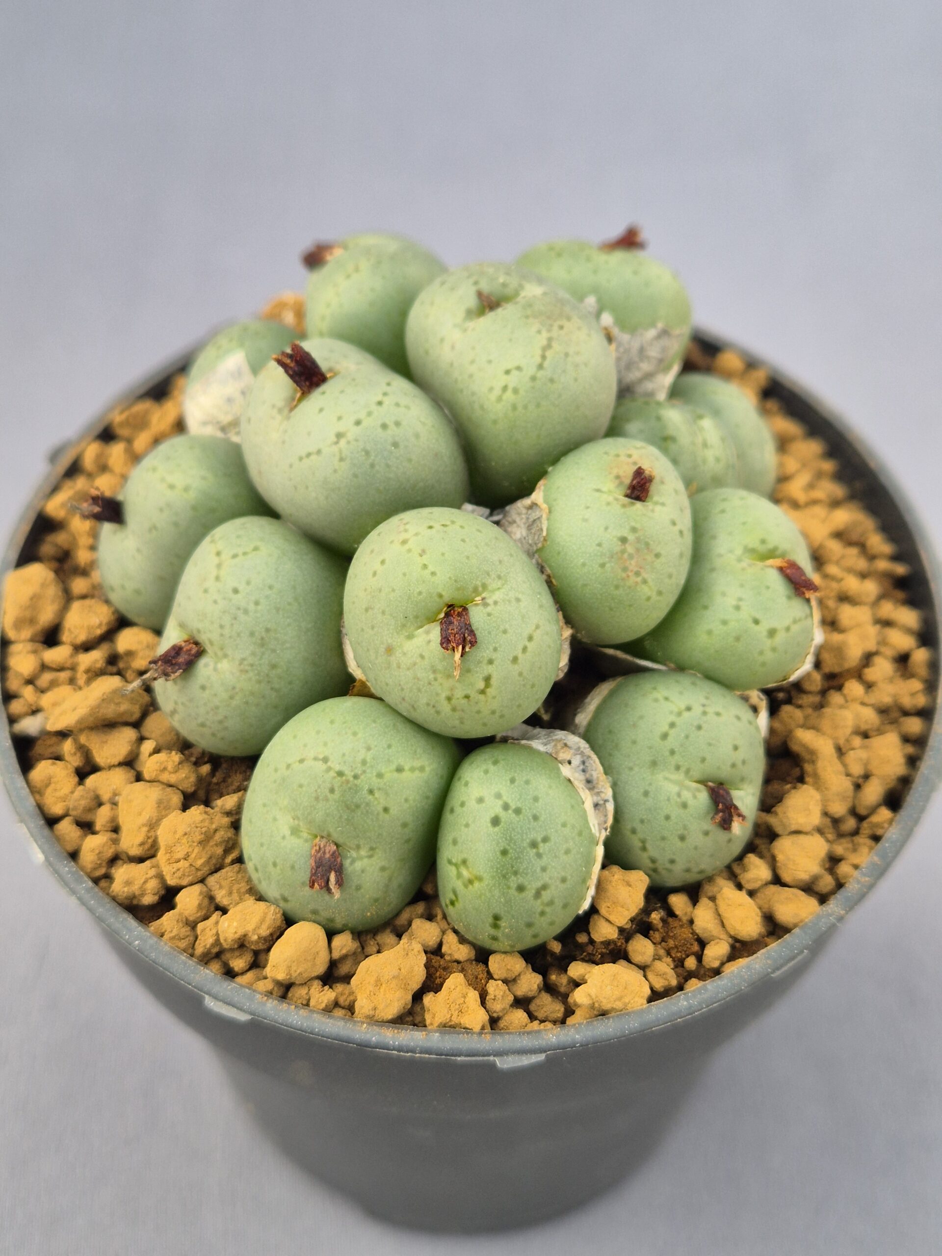 Este Conophytum híbrido destaca por formar pequeñas colonias de cuerpos globosos de tonos verdes suaves, con delicados puntitos y restos de túnicas secas que aportan un aspecto único y ornamental. Es una planta compacta, elegante y muy apreciada en colecciones de suculentas raras por su crecimiento lento y su comportamiento estacional.