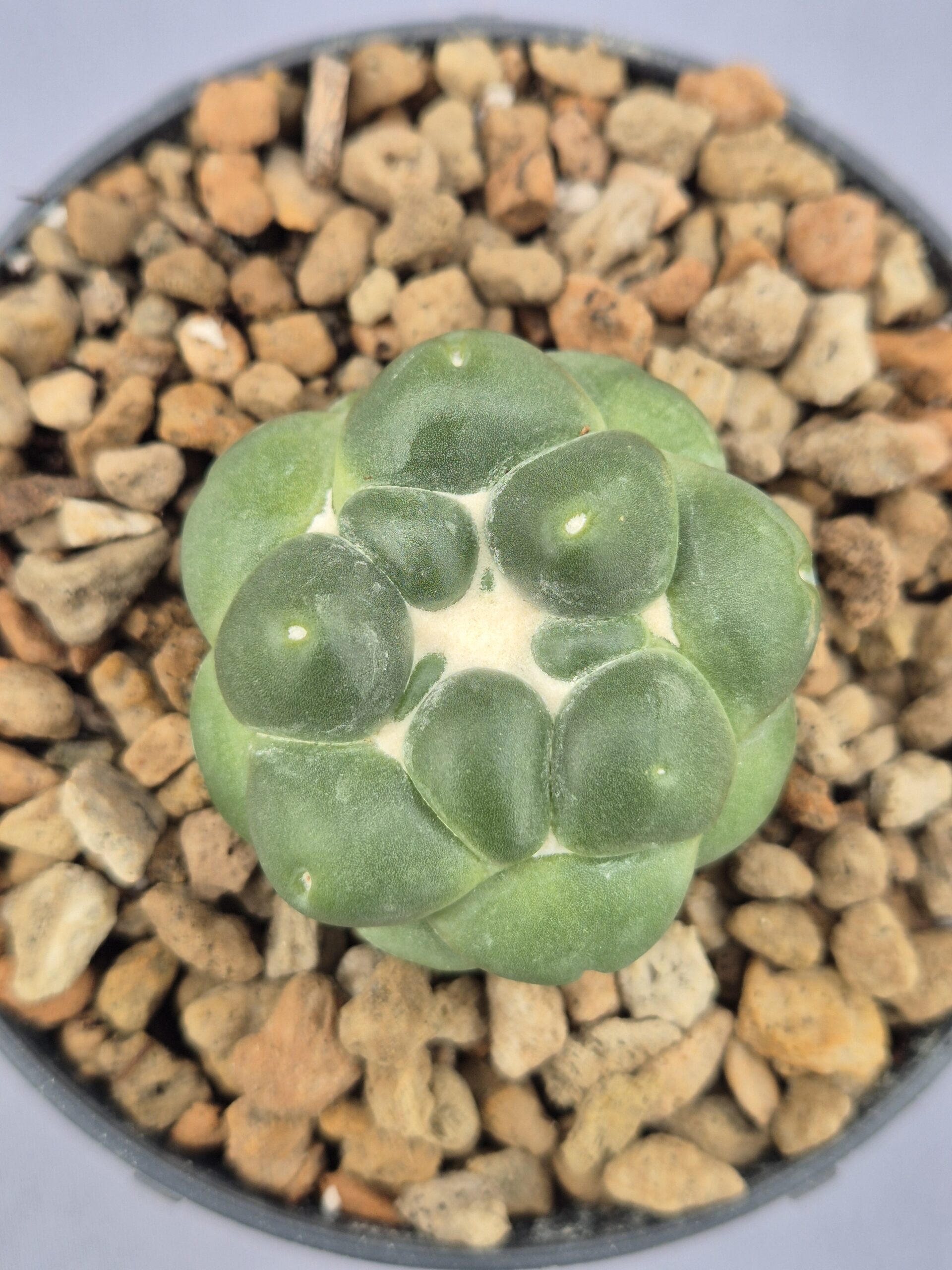 🌿Forma: Cuerpo globoso compuesto por tubérculos grandes y redondeados, dispuestos en espiral. La ausencia de espinas realza su aspecto liso y limpio.