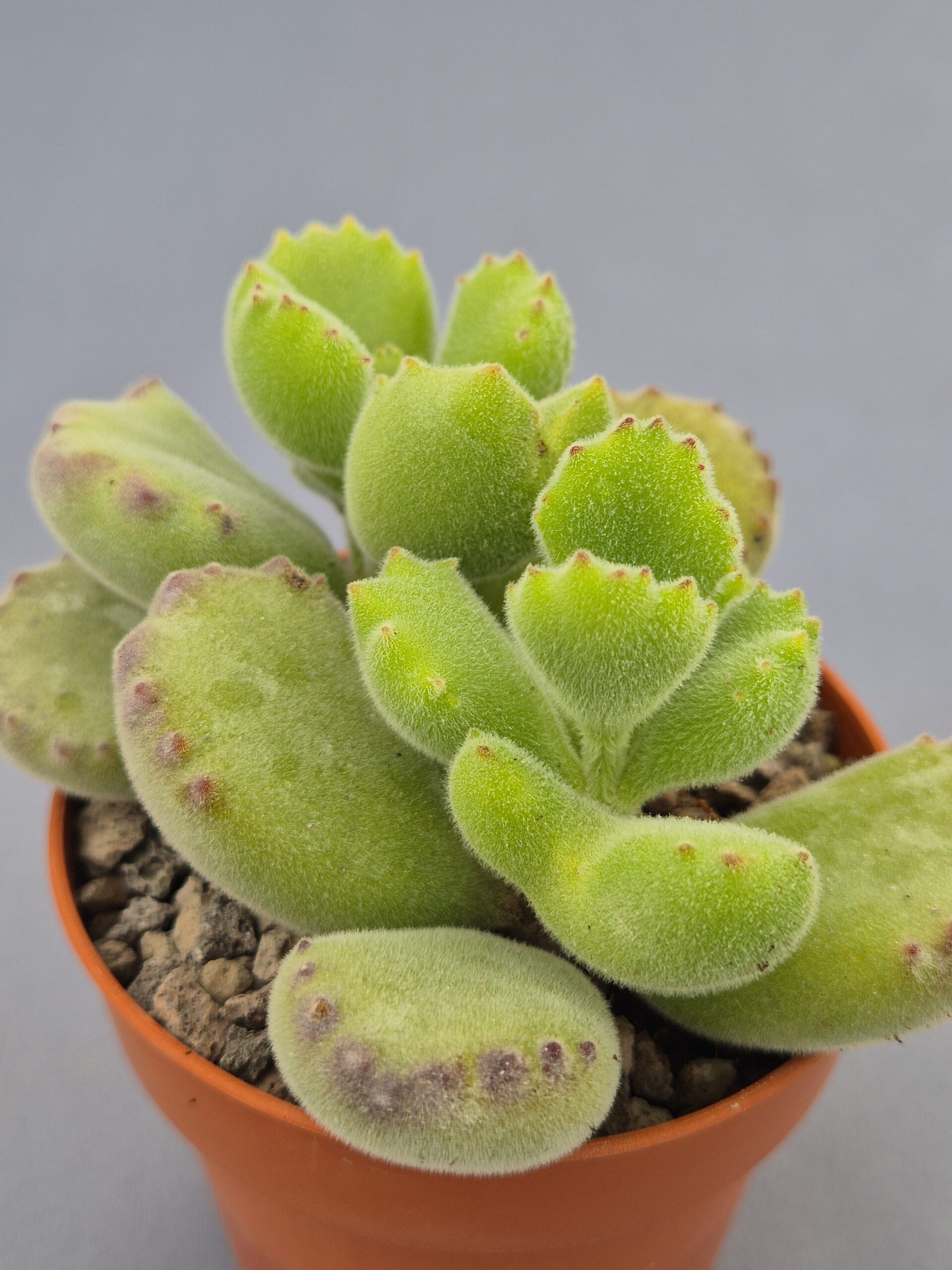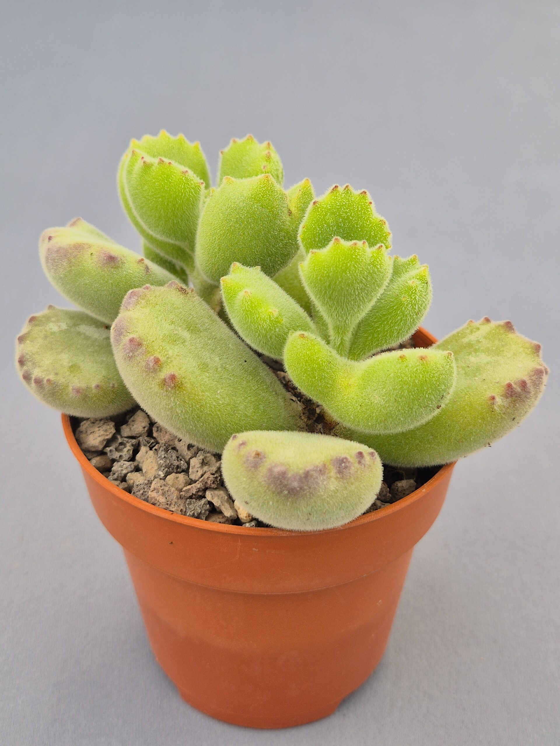 Cotyledon tomentosa es una suculenta encantadora y muy reconocible, famosa por la forma peculiar de sus hojas que evocan pequeñas “garras de oso”. Su aspecto compacto y su textura aterciopelada la convierten en una de las especies más queridas dentro del mundo de las crasas decorativas.
