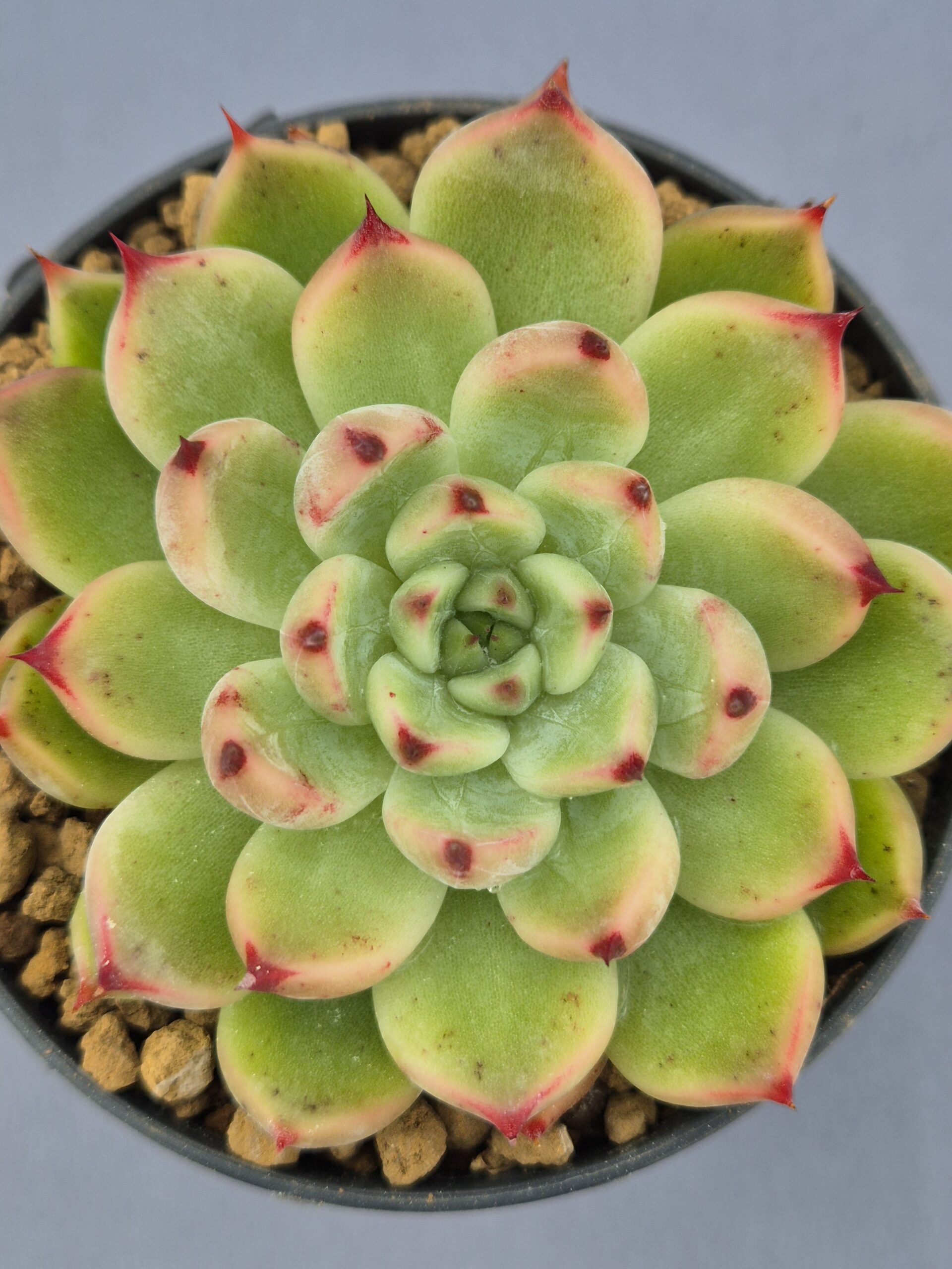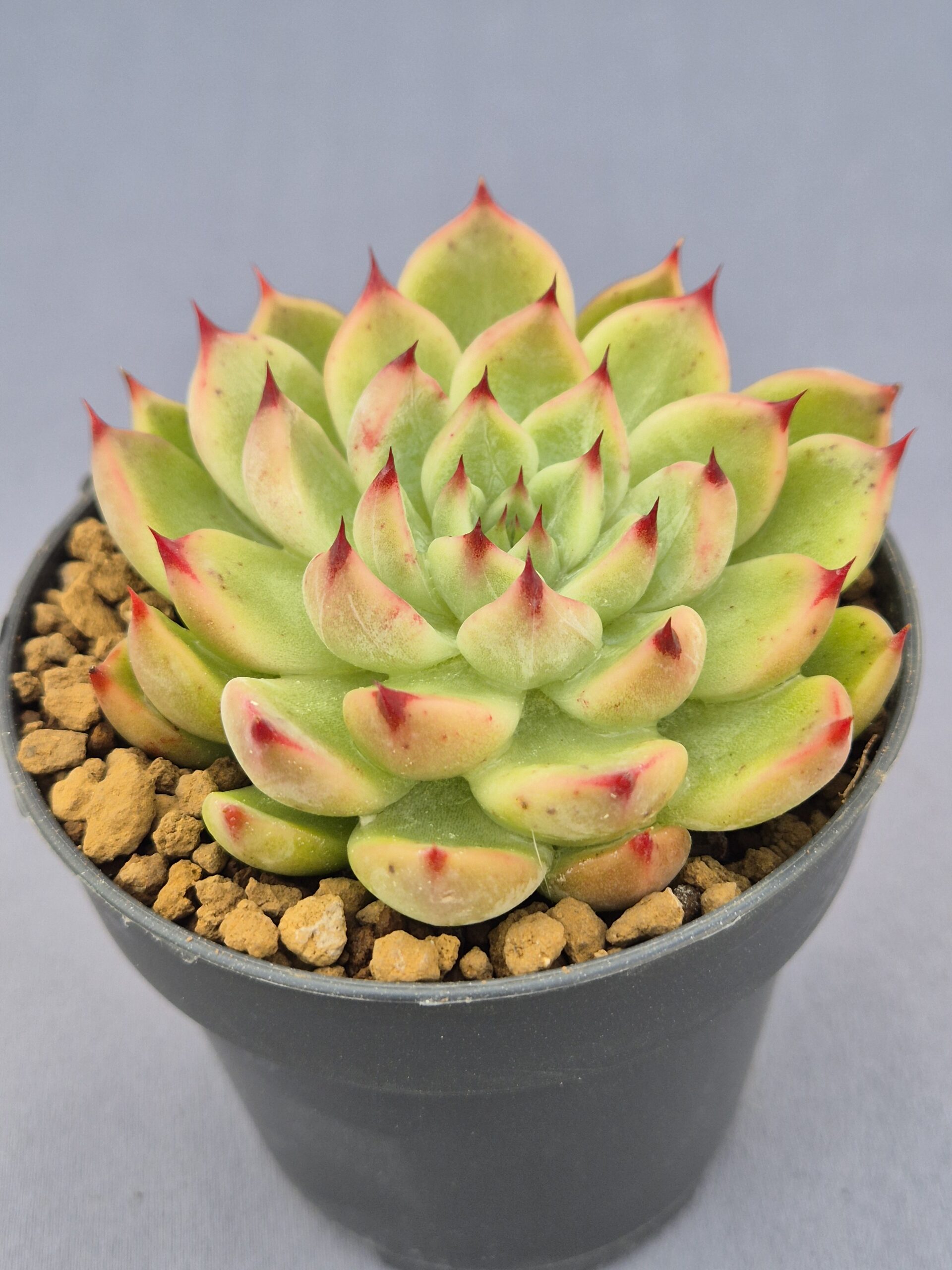 La Echeveria ‘Achilleus’ es una suculenta híbrida de colección creada por Hwaga, que combina una estructura casi perfecta con un toque salvaje. Su roseta forma un patrón geométrico impecable, con hojas carnosas de tono verde claro cubiertas por una fina pruina, y terminadas en puntas afiladas color rojo oscuro que contrastan con fuerza y elegancia.