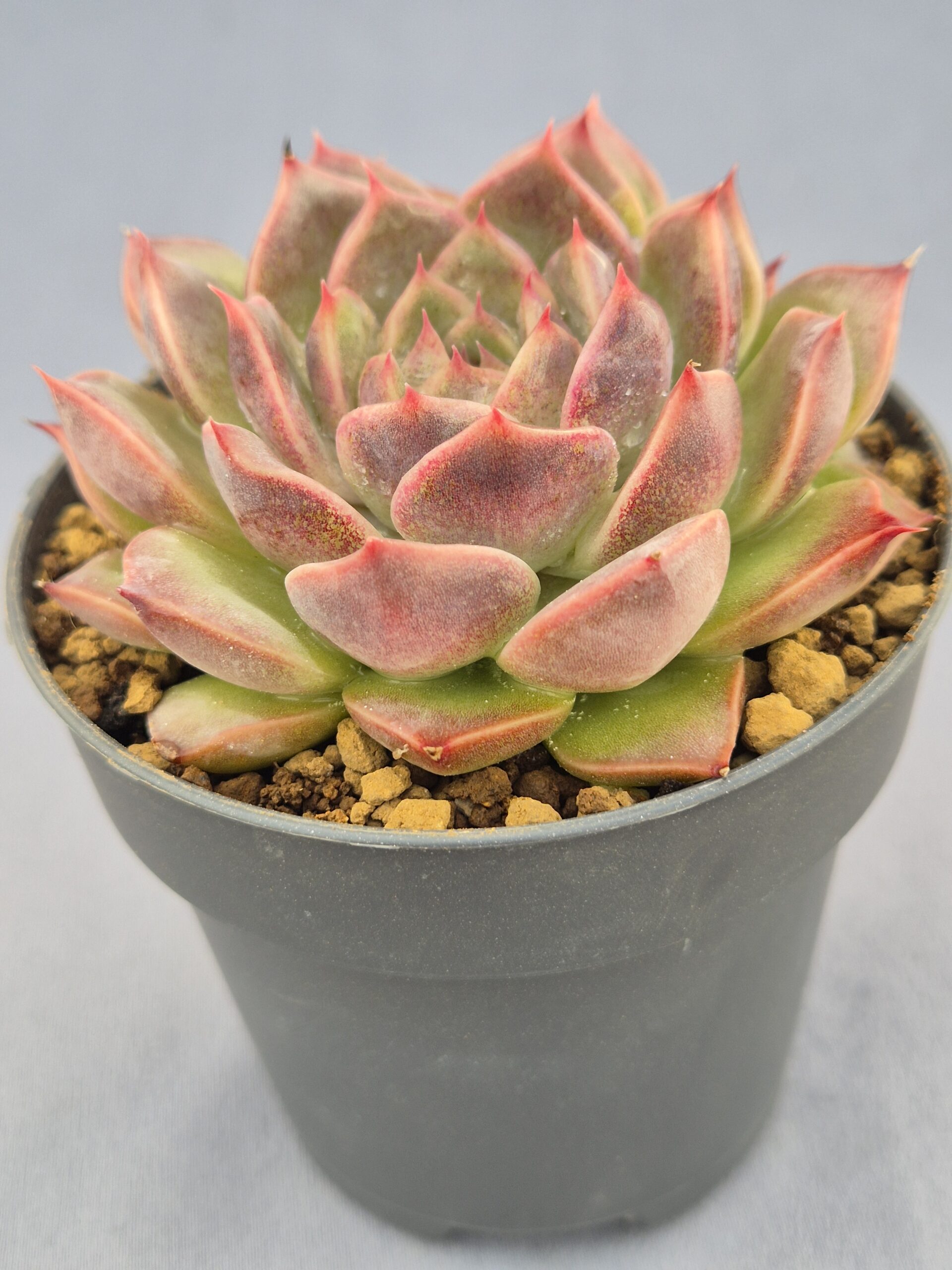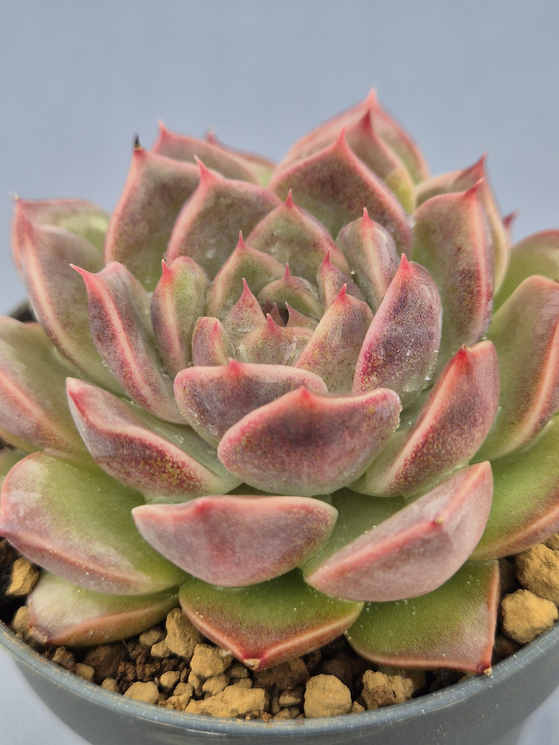 La Echeveria Dior es una joya botánica que destaca por su porte refinado y su combinación de tonos suaves pero vibrantes. Sus hojas forman una roseta perfectamente equilibrada, con una base verde clara que se funde en delicados tonos rosa empolvado y coral, evocando el lujo y la sofisticación que su nombre sugiere.