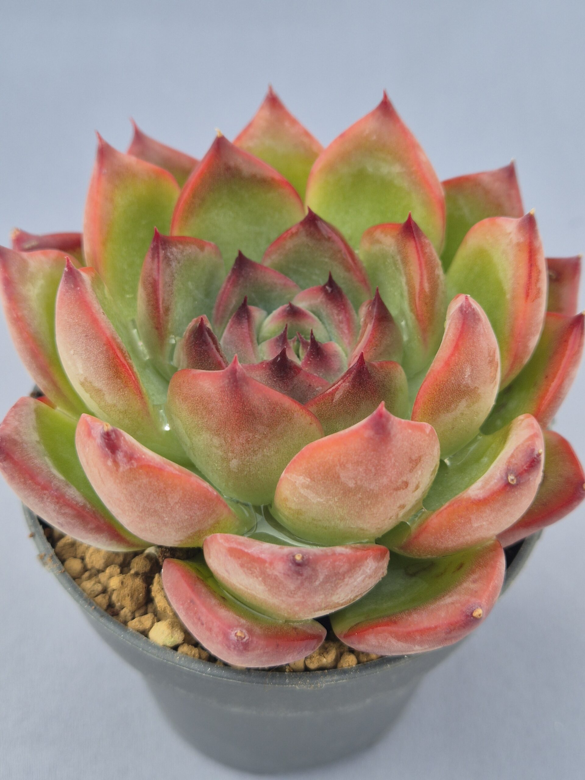 🌿Forma: Roseta bien formada y simétrica, con hojas carnosas, triangulares y ápice pronunciado.