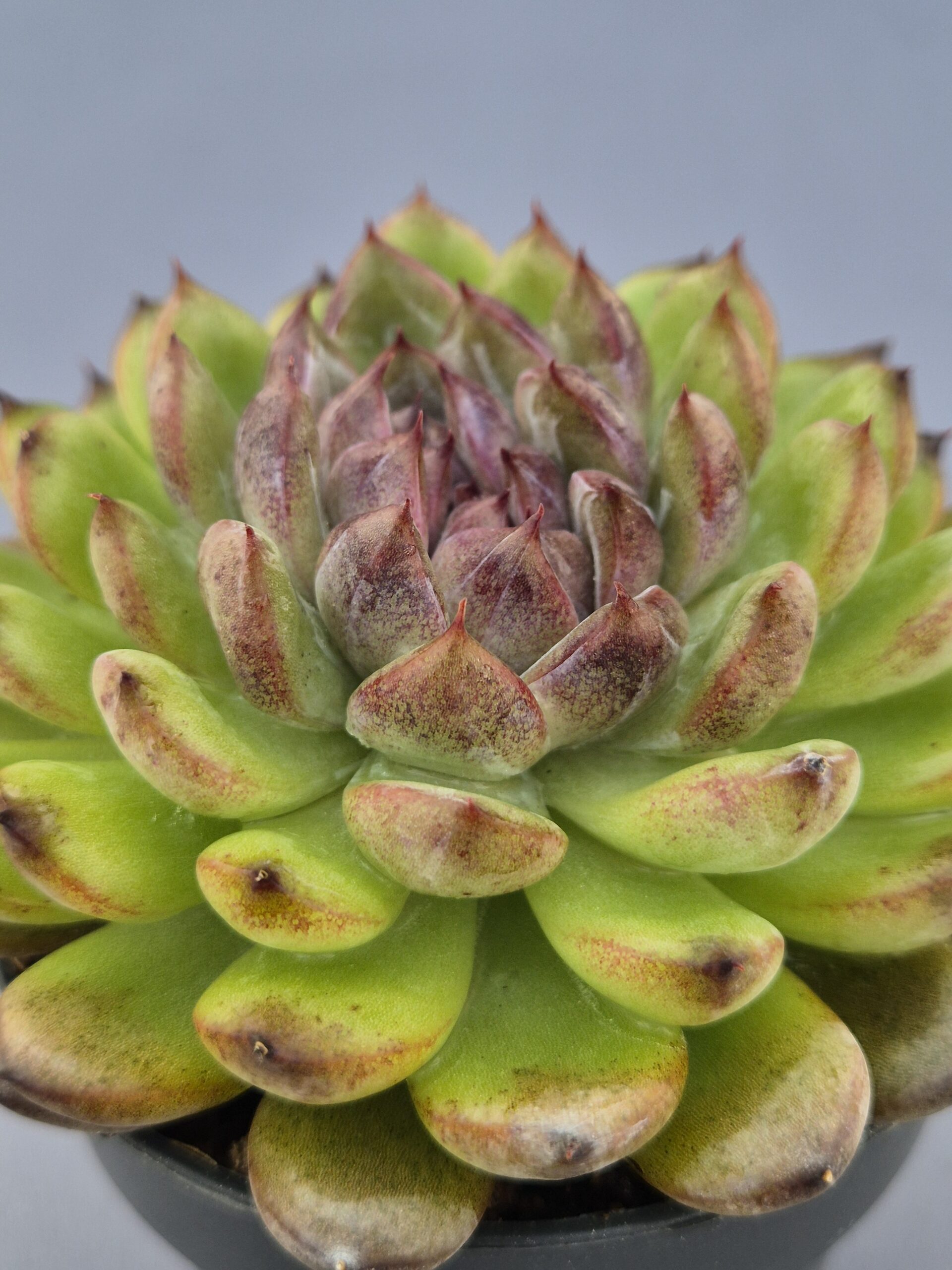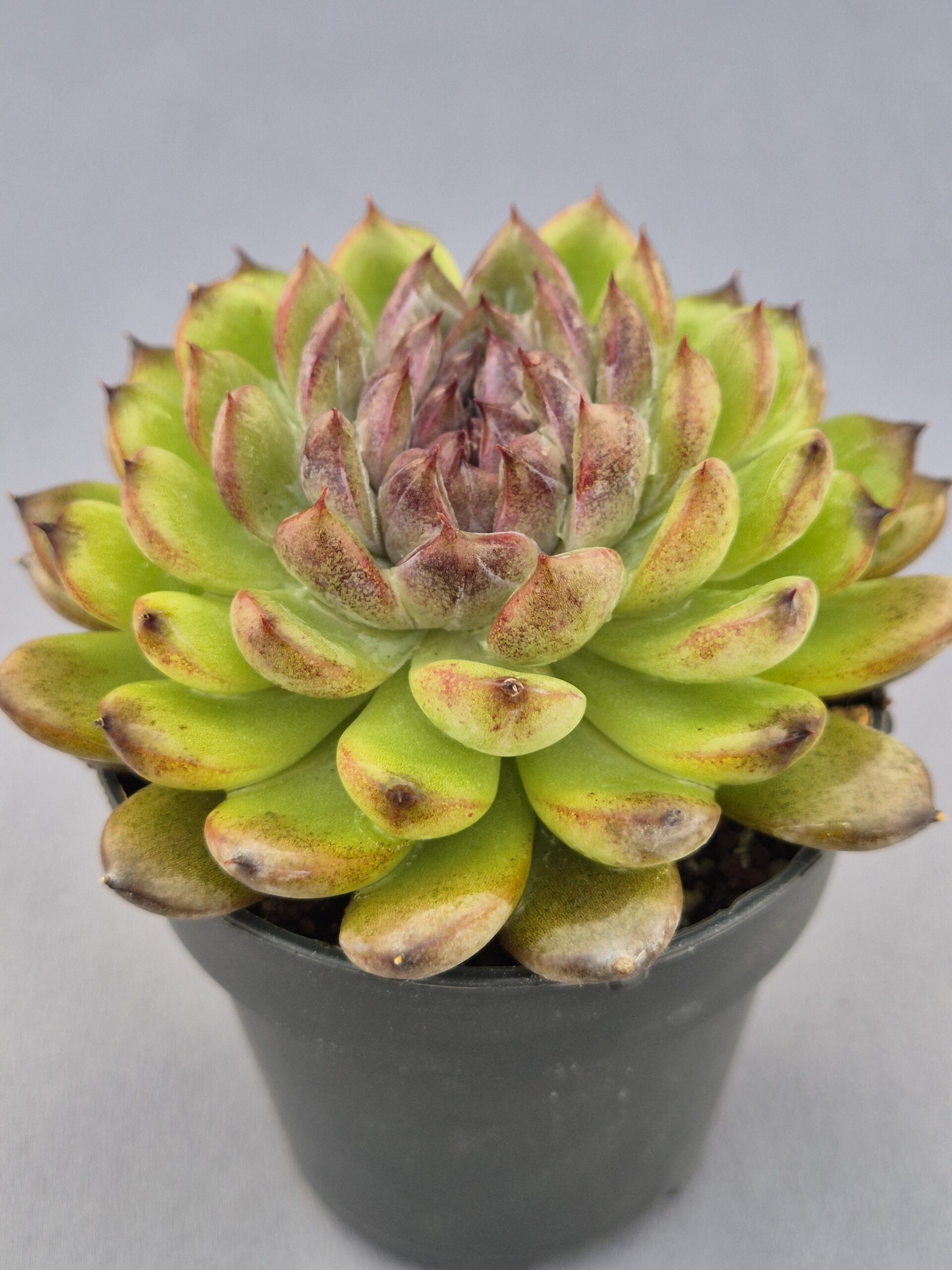 La Echeveria Gemstone es una suculenta que destaca por sus tonos únicos y su forma compacta y elegante. Sus hojas gruesas, verde pálido con matices violáceos oscuros en las puntas, le otorgan una apariencia mineral y sofisticada, como si fuera tallada en jade y amatista.