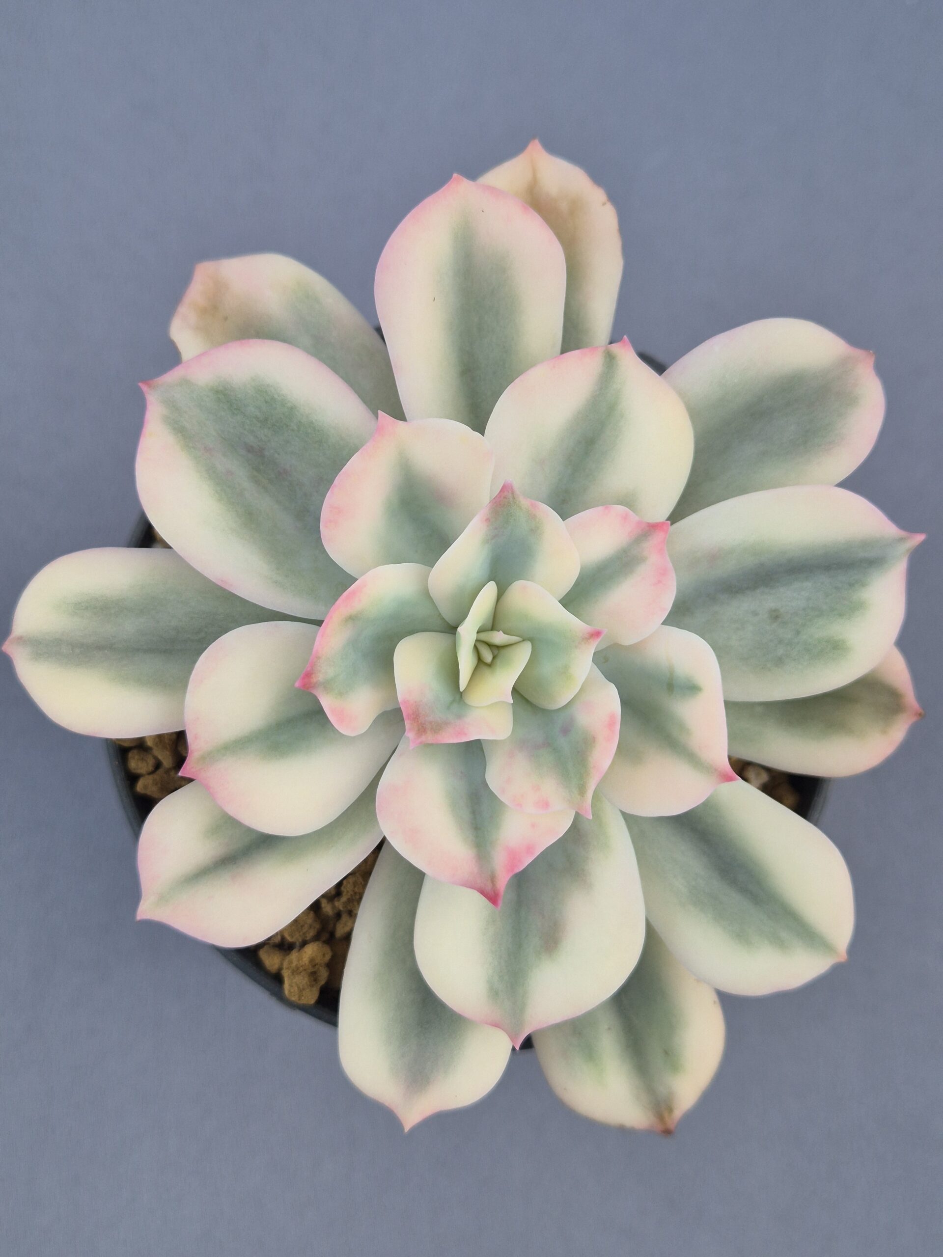 La Echeveria imbricata variegata es una suculenta ornamental muy apreciada por su elegante roseta simétrica y su llamativa variegación. Combina tonos crema, verde suave y delicados matices rosados en los bordes, creando un efecto luminoso y refinado que la convierte en una pieza destacada en cualquier colección.