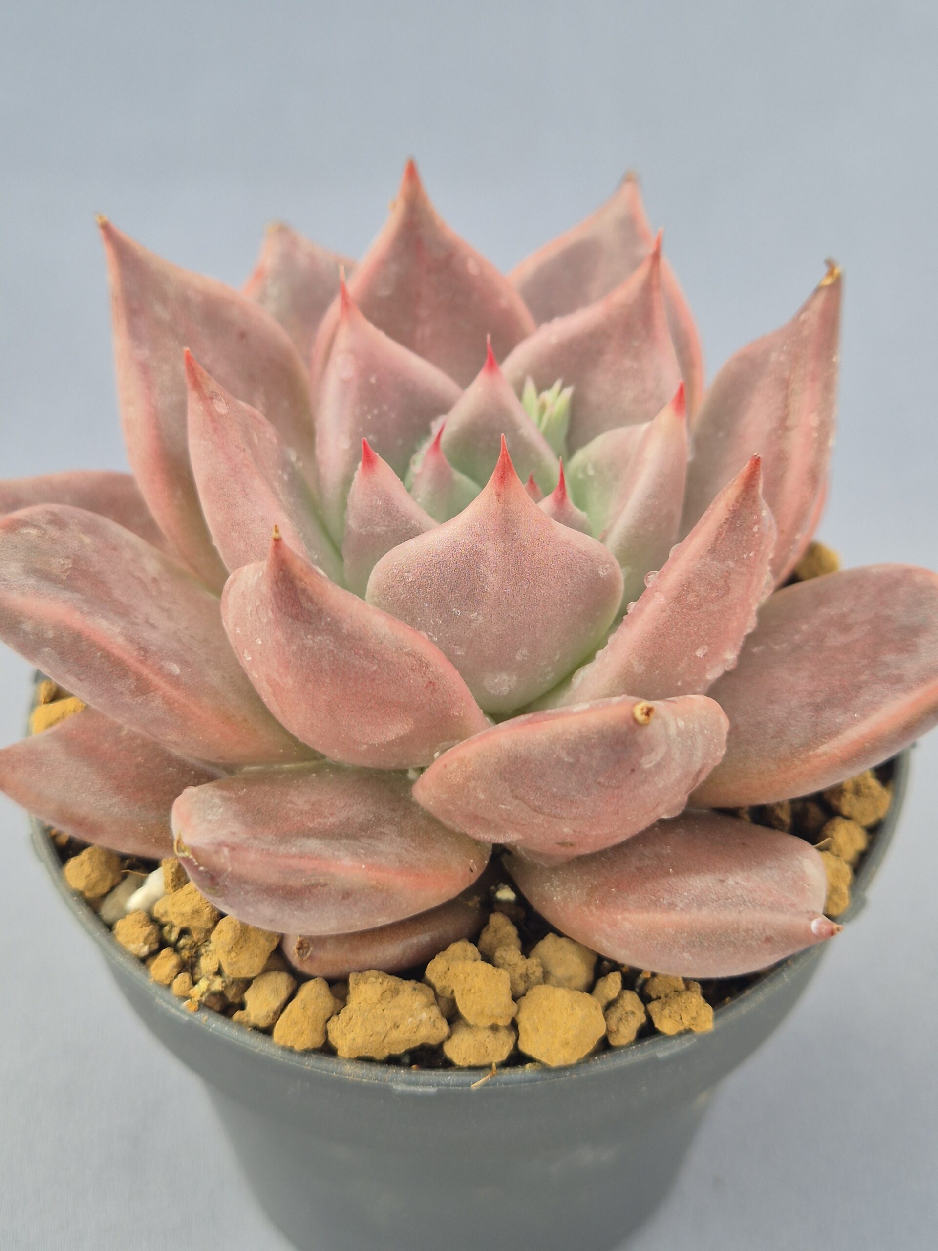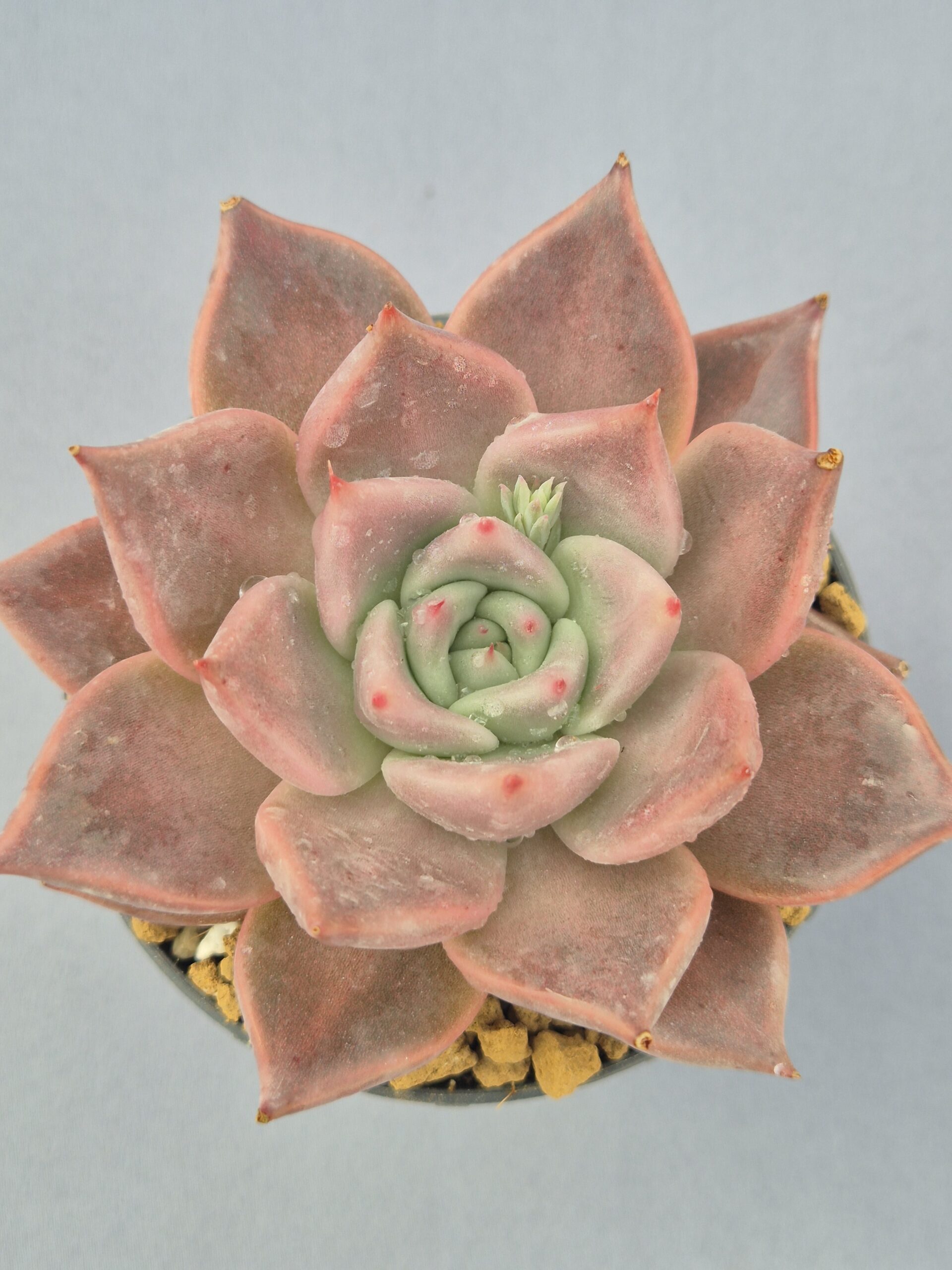🎨Color: Tonalidades rosadas a salmón con matices empolvados, combinadas con una base verde pálido visible en el centro de la roseta. Los ápices adquieren un tono rosado más intenso bajo buena iluminación.
