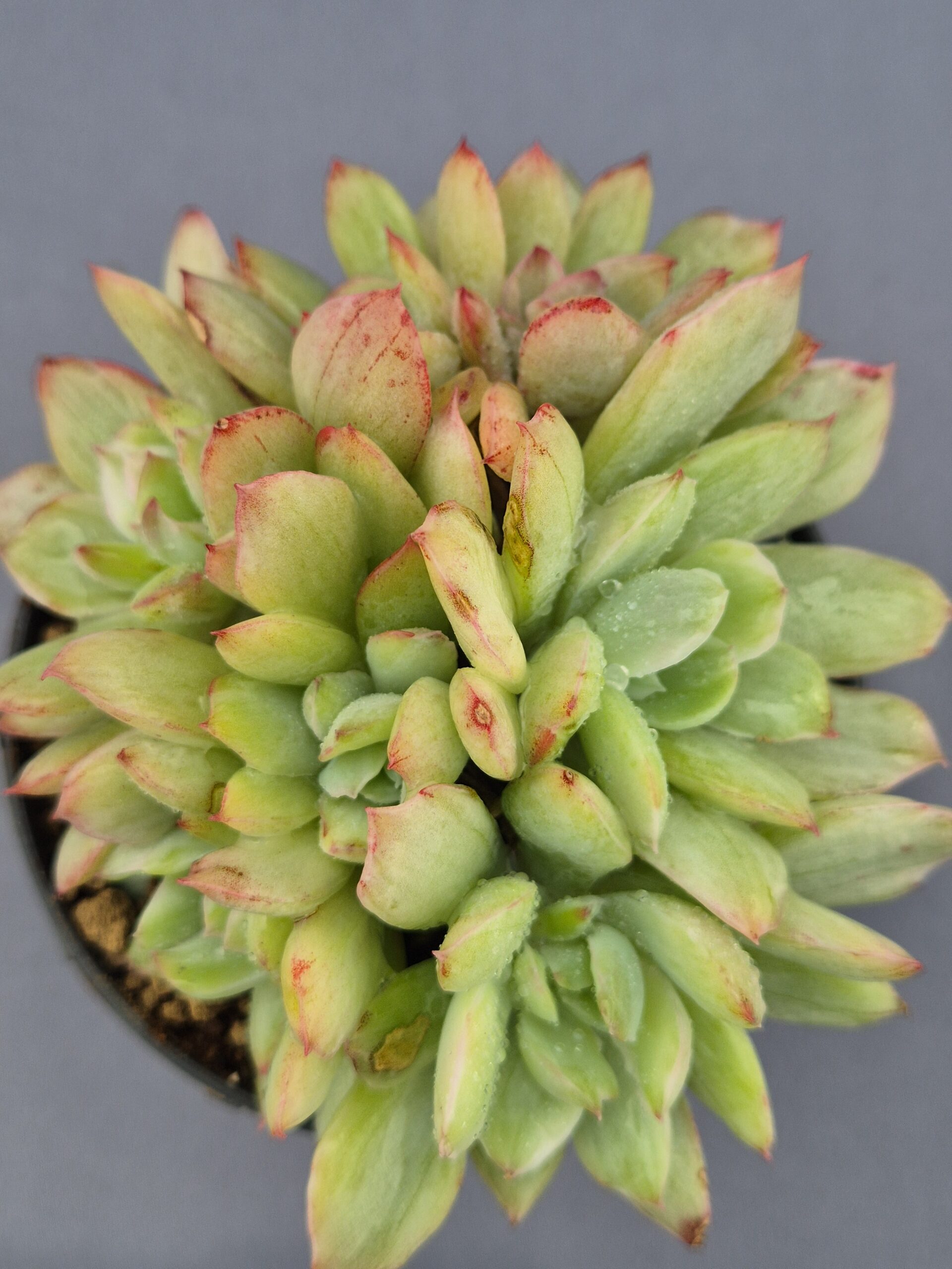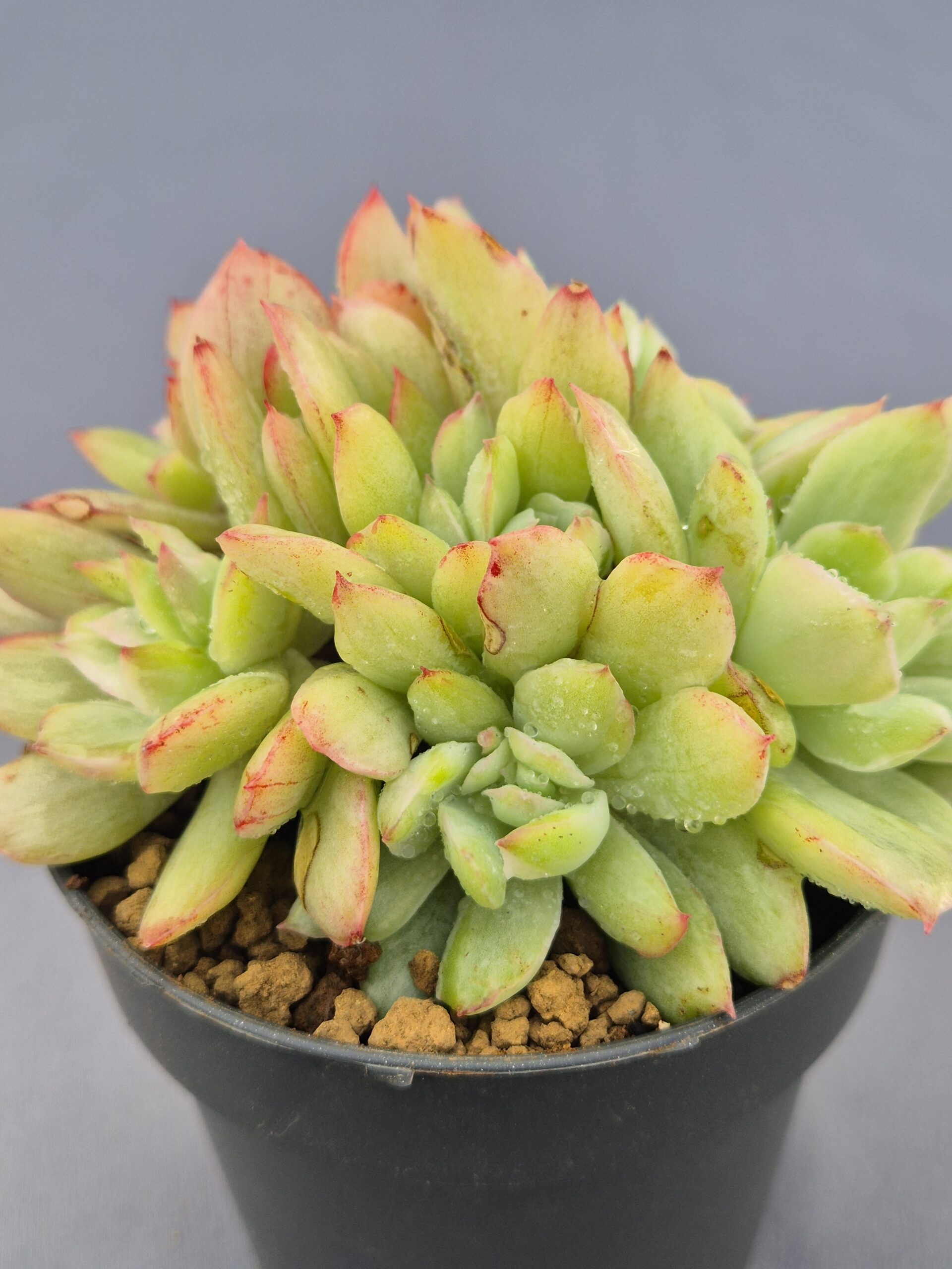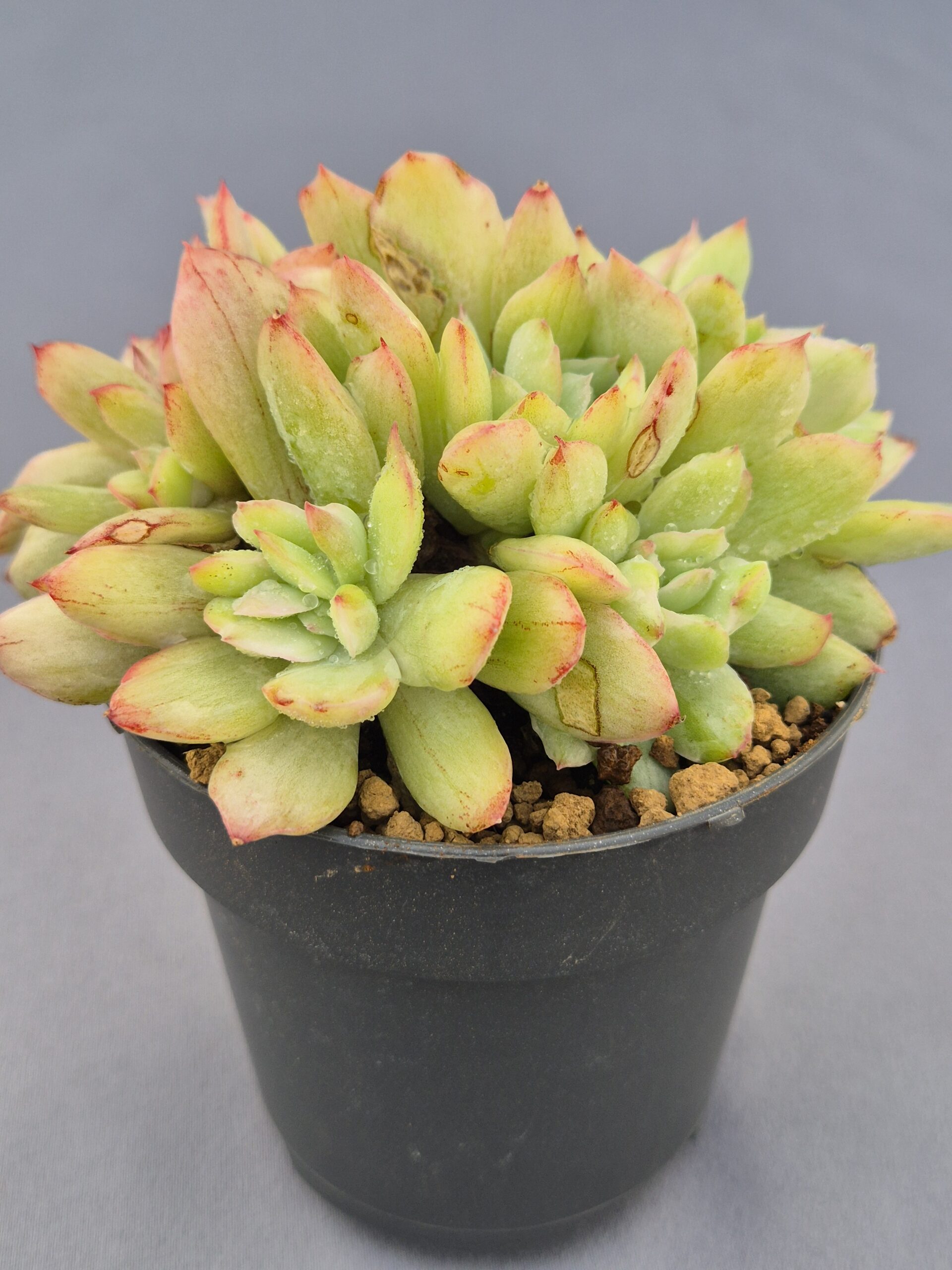 La Echeveria Luella Clustering Variegada es una joya botánica que no pasa desapercibida. Su forma compacta y su capacidad de formar grupos o “clumps” naturales la convierten en una suculenta perfecta tanto para coleccionistas como para quienes buscan una planta llamativa y de bajo mantenimiento.
