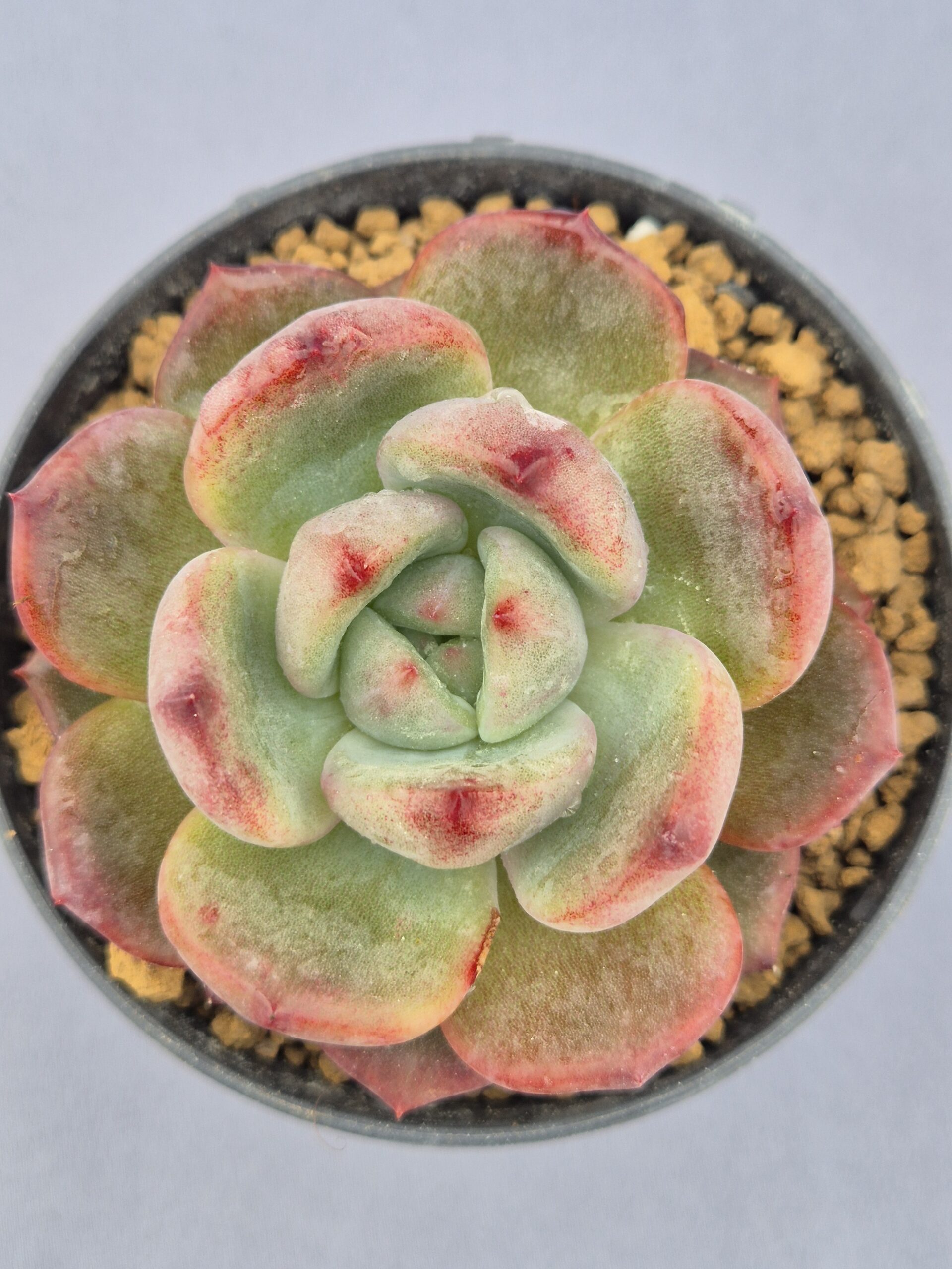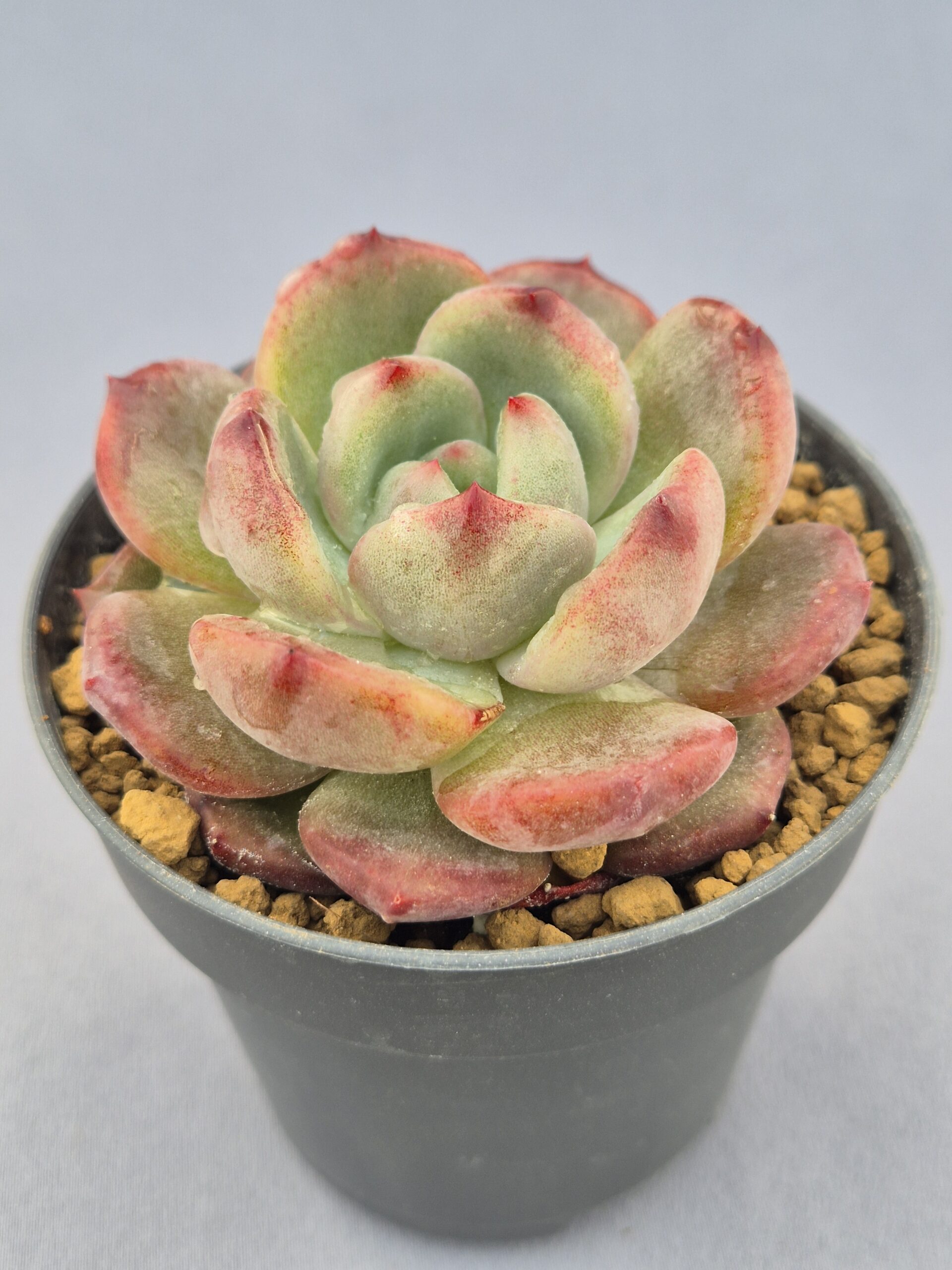 La Echeveria Miss Hong cautiva a primera vista con su patrón bicolor: una combinación armoniosa de verde esmeralda y rojo intenso en las puntas. Una elección llamativa y elegante para cualquier colección.