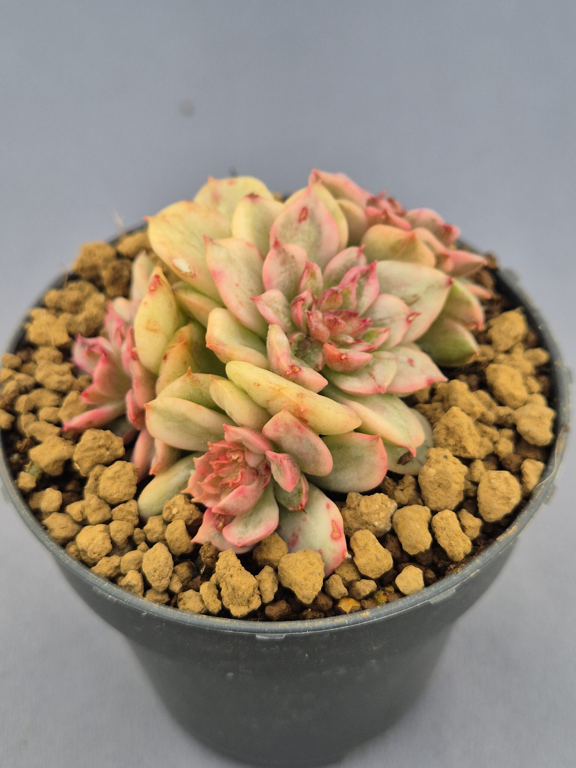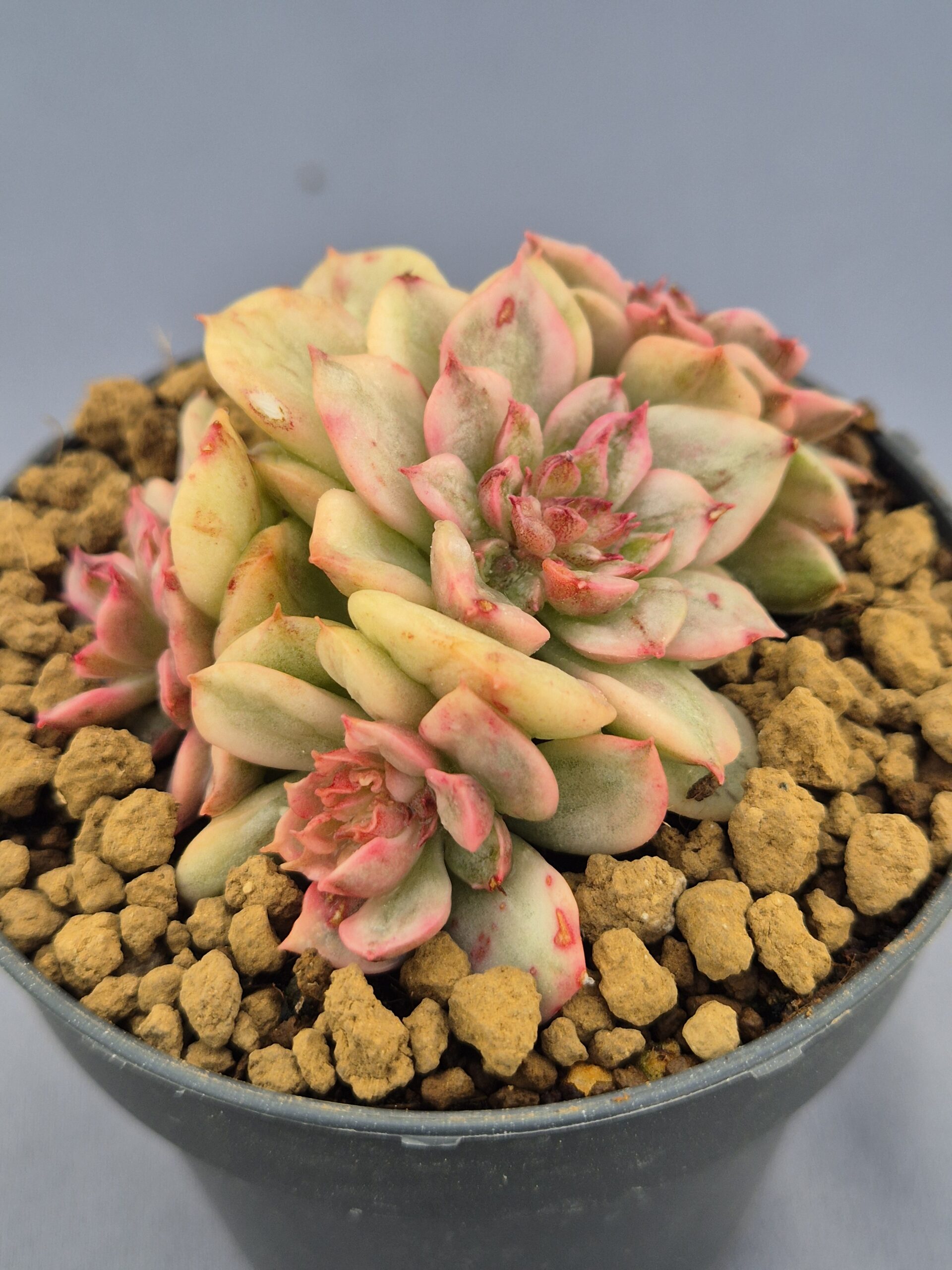 La versión 002 de la Echeveria Nuda Variegada es una joya viva que destaca por su forma compacta, múltiples rosetas y una tonalidad delicada que combina el verde pastel con un rubor rosado encantador. Un espectáculo de suavidad y estructura para cualquier colección.