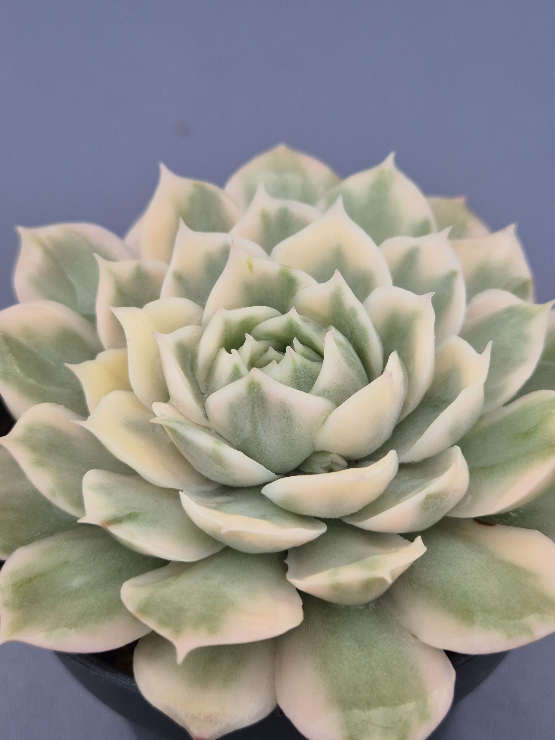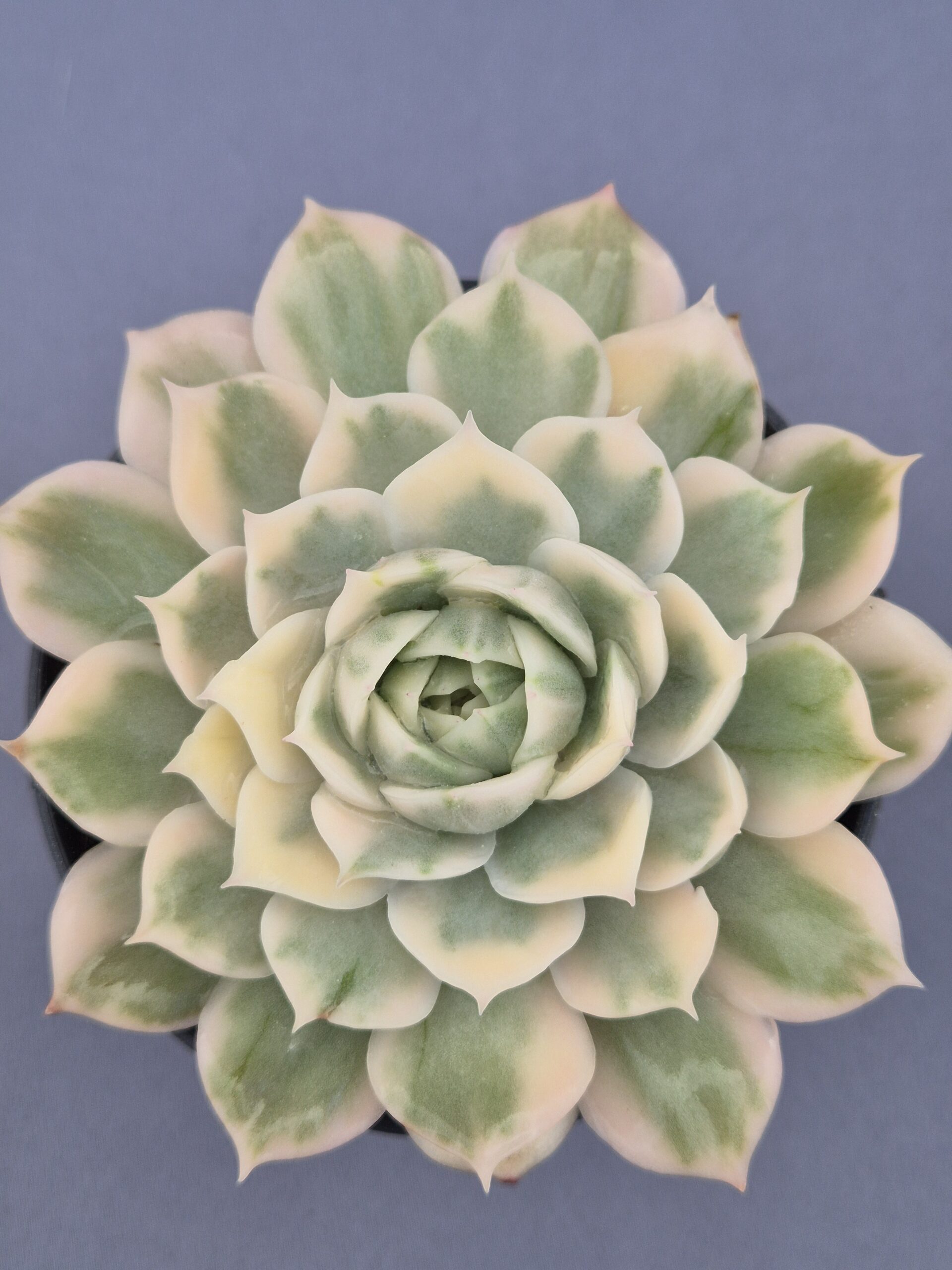 La Echeveria Onslow Variegada es una joya coleccionable. Con una roseta compacta de hojas gruesas, su tono marfil mezclado con suaves pinceladas verdosas la convierte en una de las variegadas más deseadas por su elegancia serena y delicada.