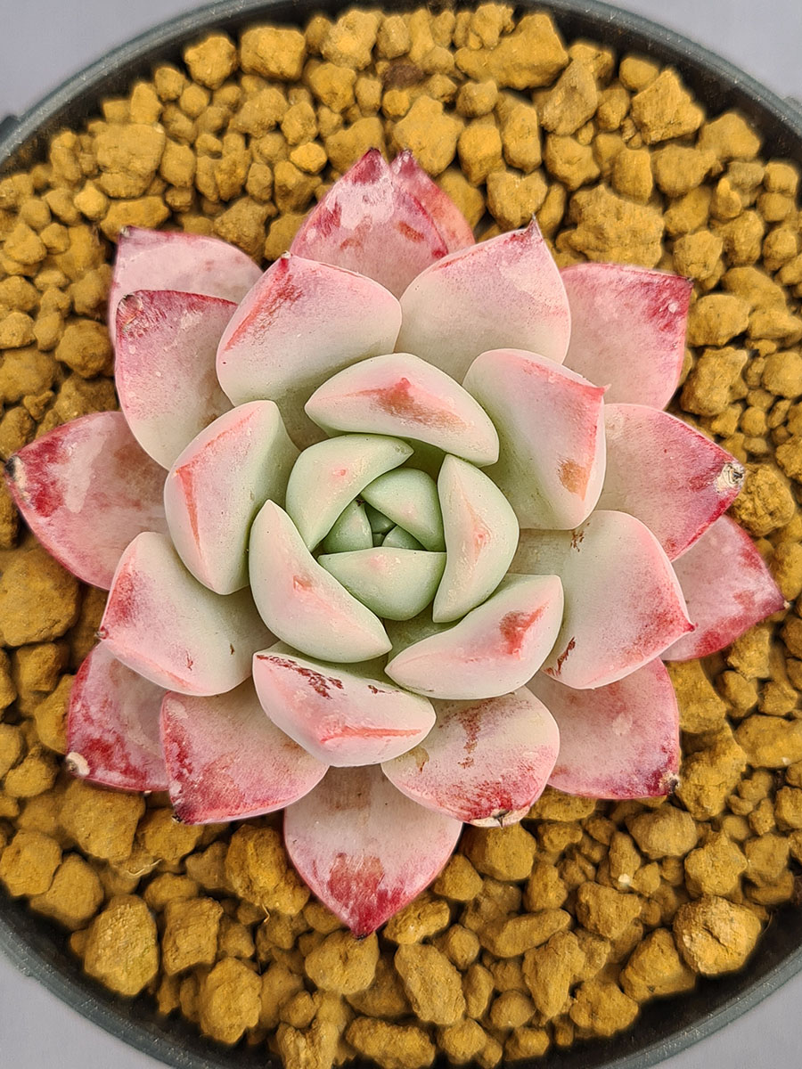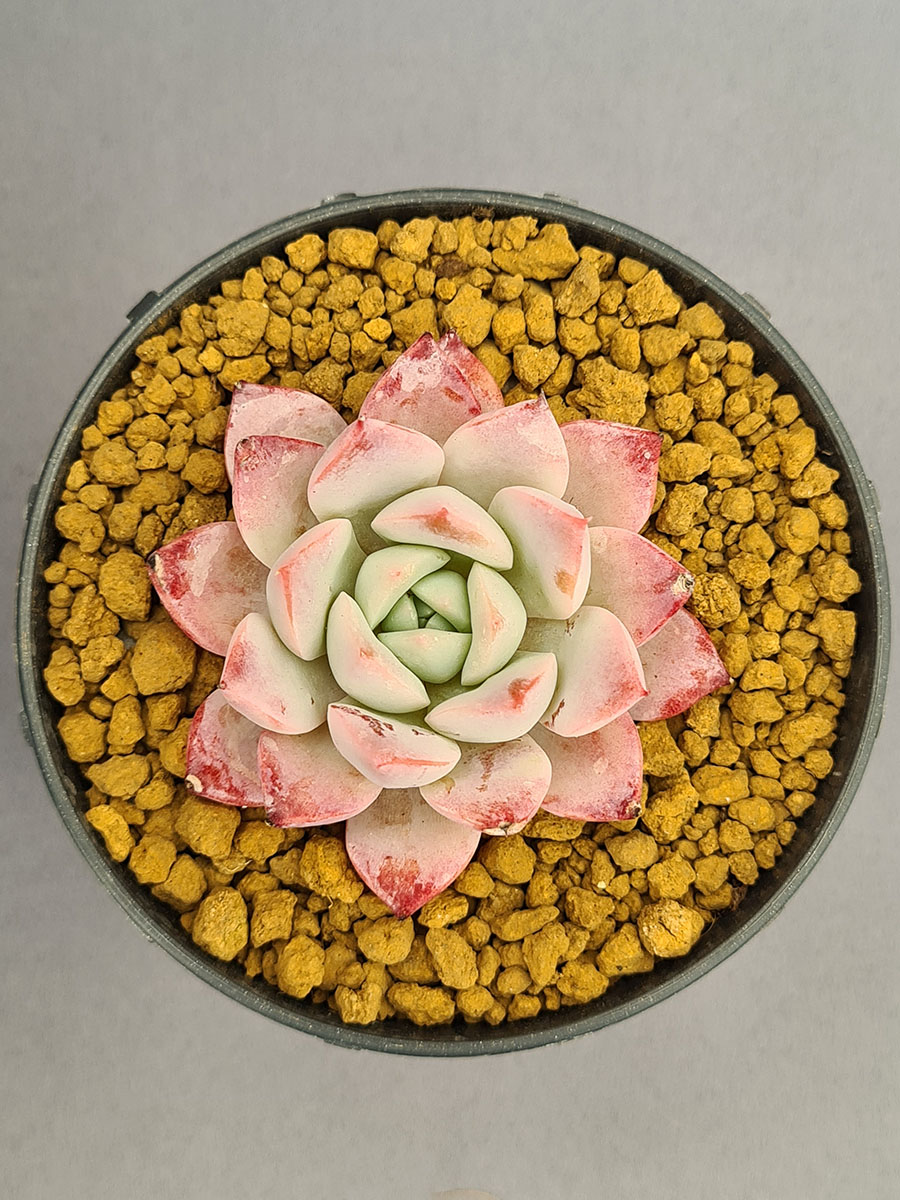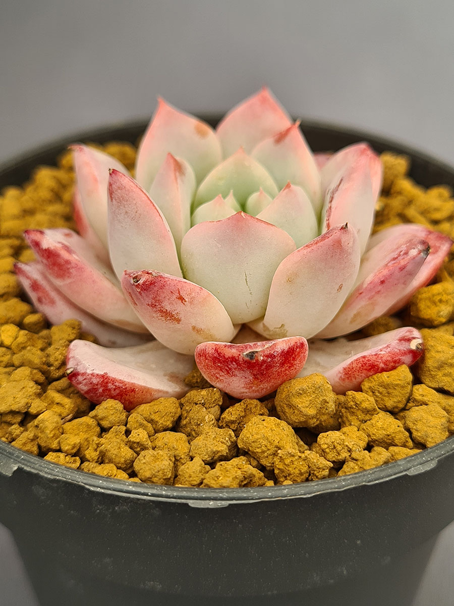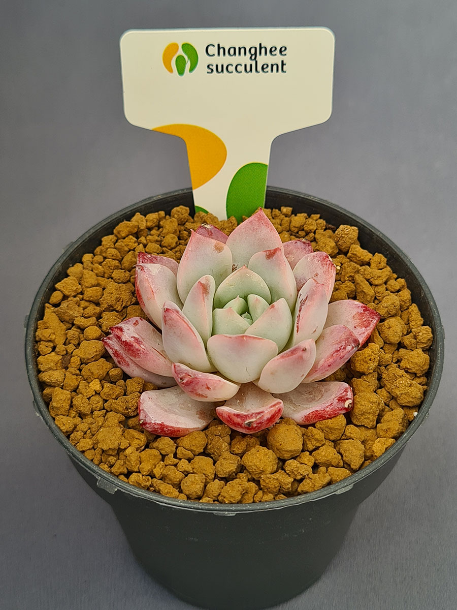 La Echeveria Pheromone, creada por Changhee, es una suculenta de gran encanto visual. Sus hojas blancas nacaradas se tiñen de rojo intenso en las puntas, como si estuvieran delineadas con pinceladas suaves de color, creando un contraste elegante y vibrante.