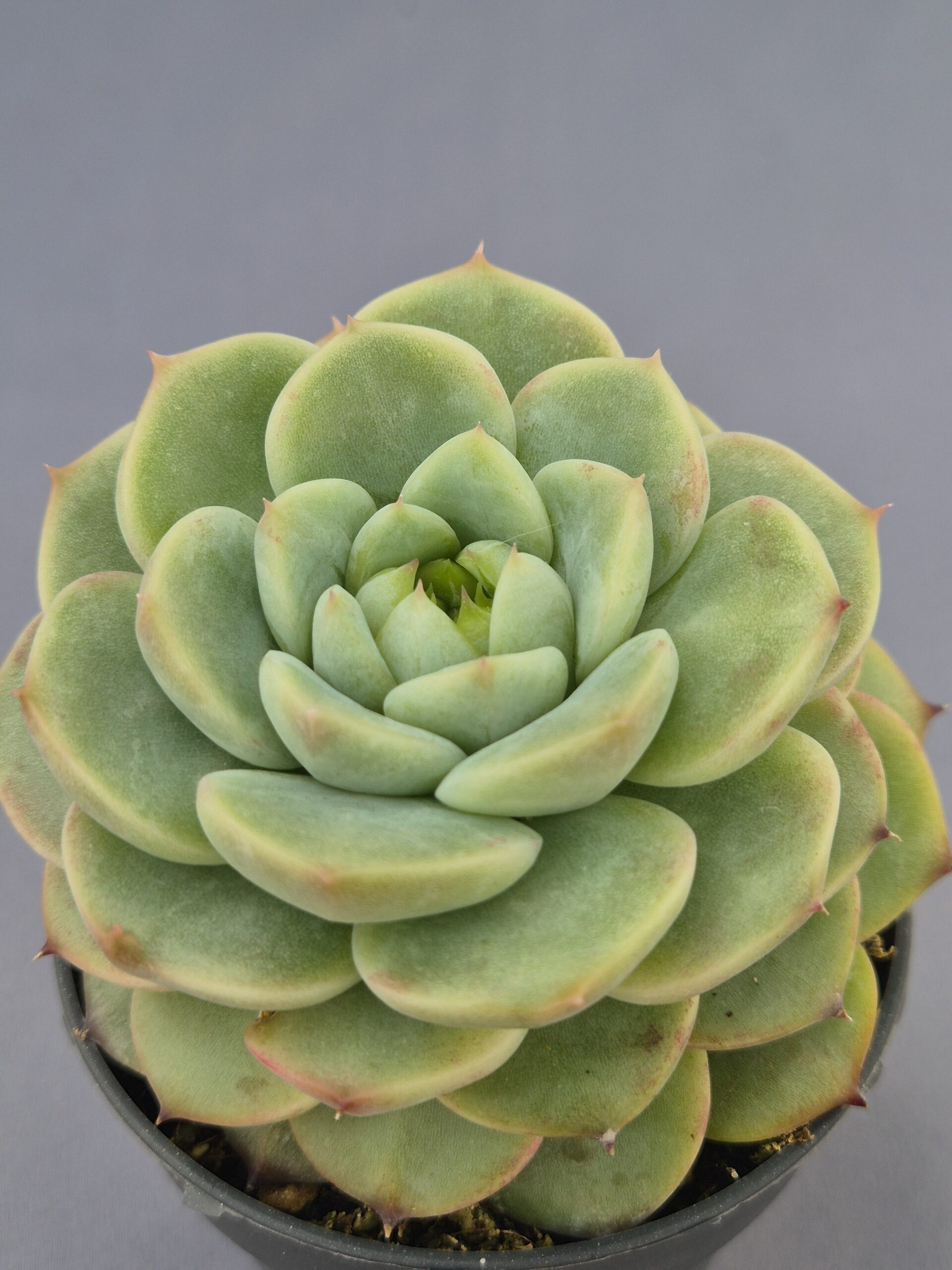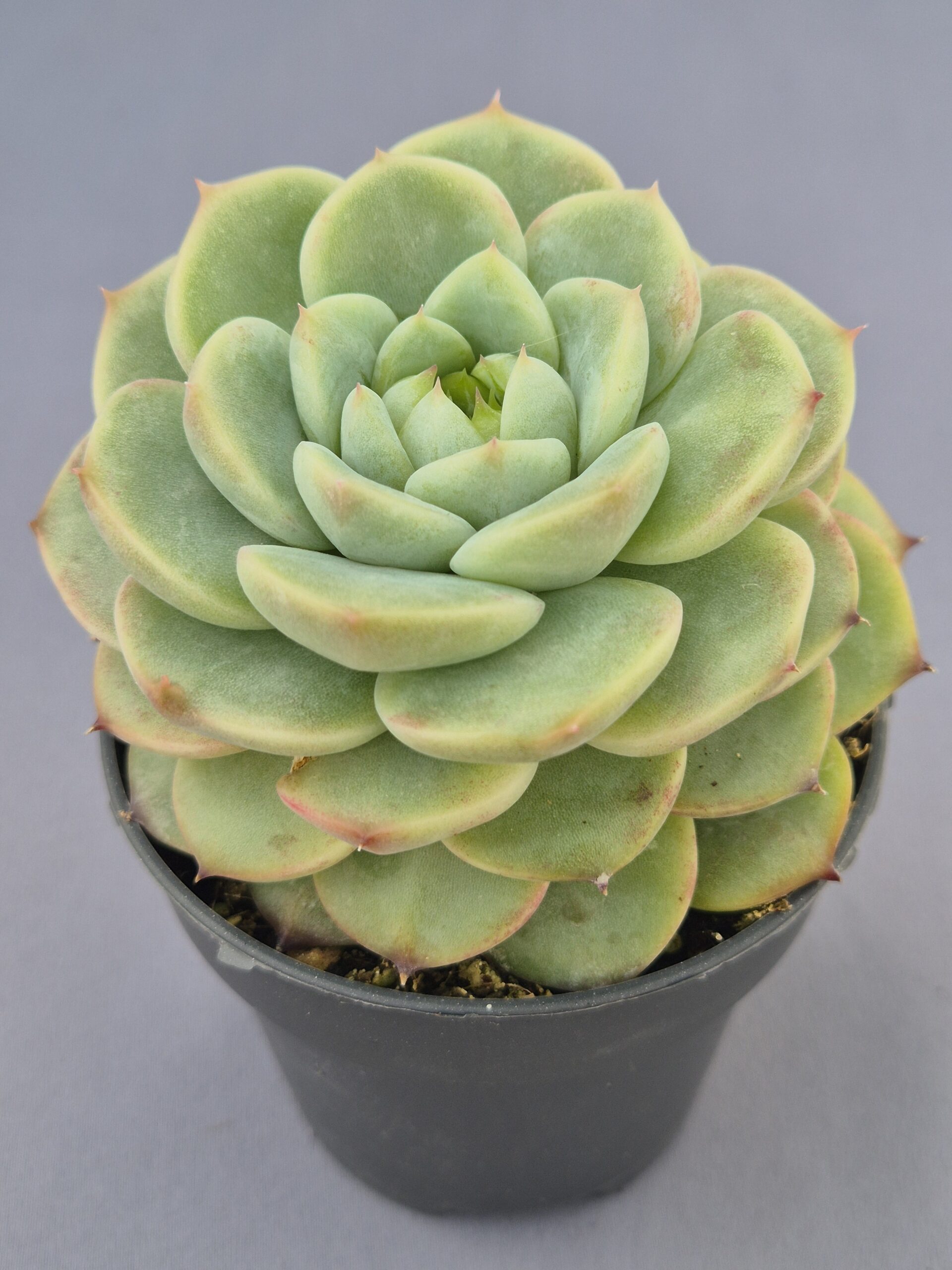 🌿Forma: roseta compacta y simétrica formada por hojas carnosas, ligeramente alargadas y terminadas en punta definida.